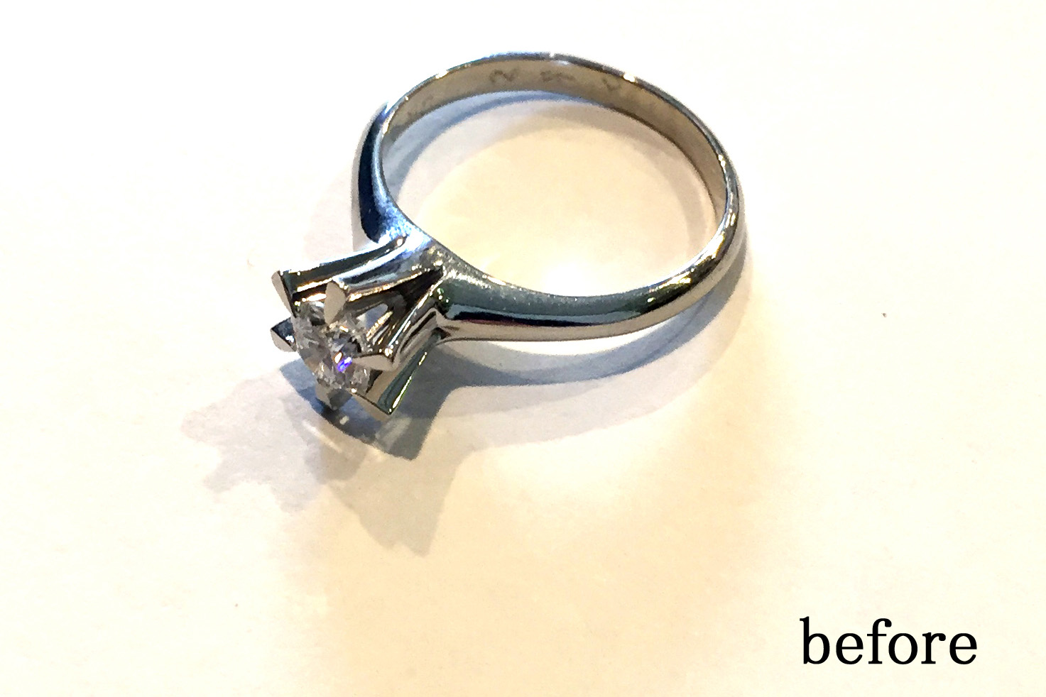 ダイヤモンドが高くセッティングされていた為使いにくいということで、低くセッティングするデザインに変更致しました。透かしの入った可愛い石座に、ミル打ちも入っているので、しっかりした重量感もありながら女性らしく見えるデザインです。