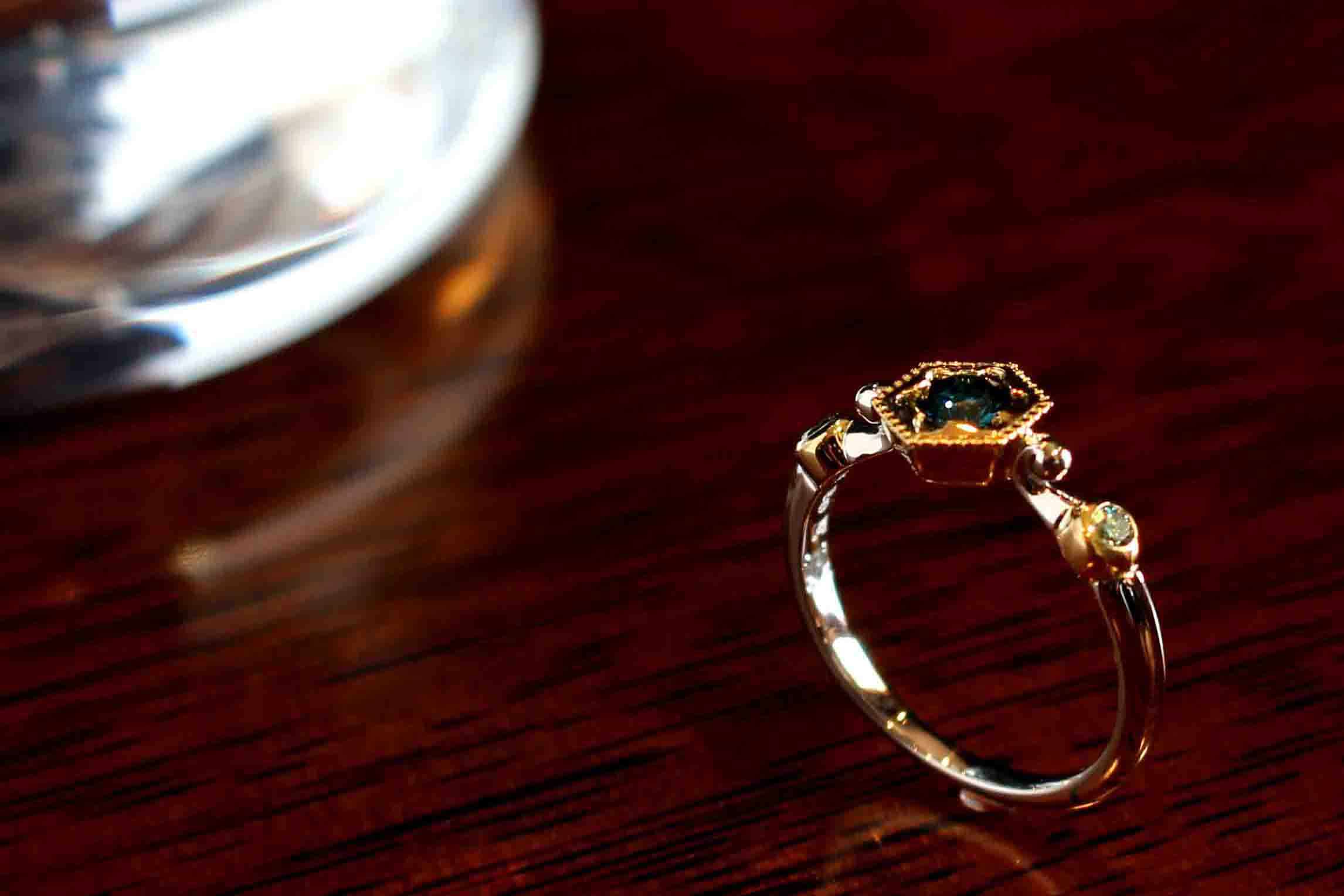 6角形の石座が特徴的なエンゲージリング。ダイヤモンドを立体的になおかつフラットにセッティングすることでいつでも使いやすいデザインになっています。どこから見ても美しいフォルムは他には無いスペシャルなプレゼントになると思います。