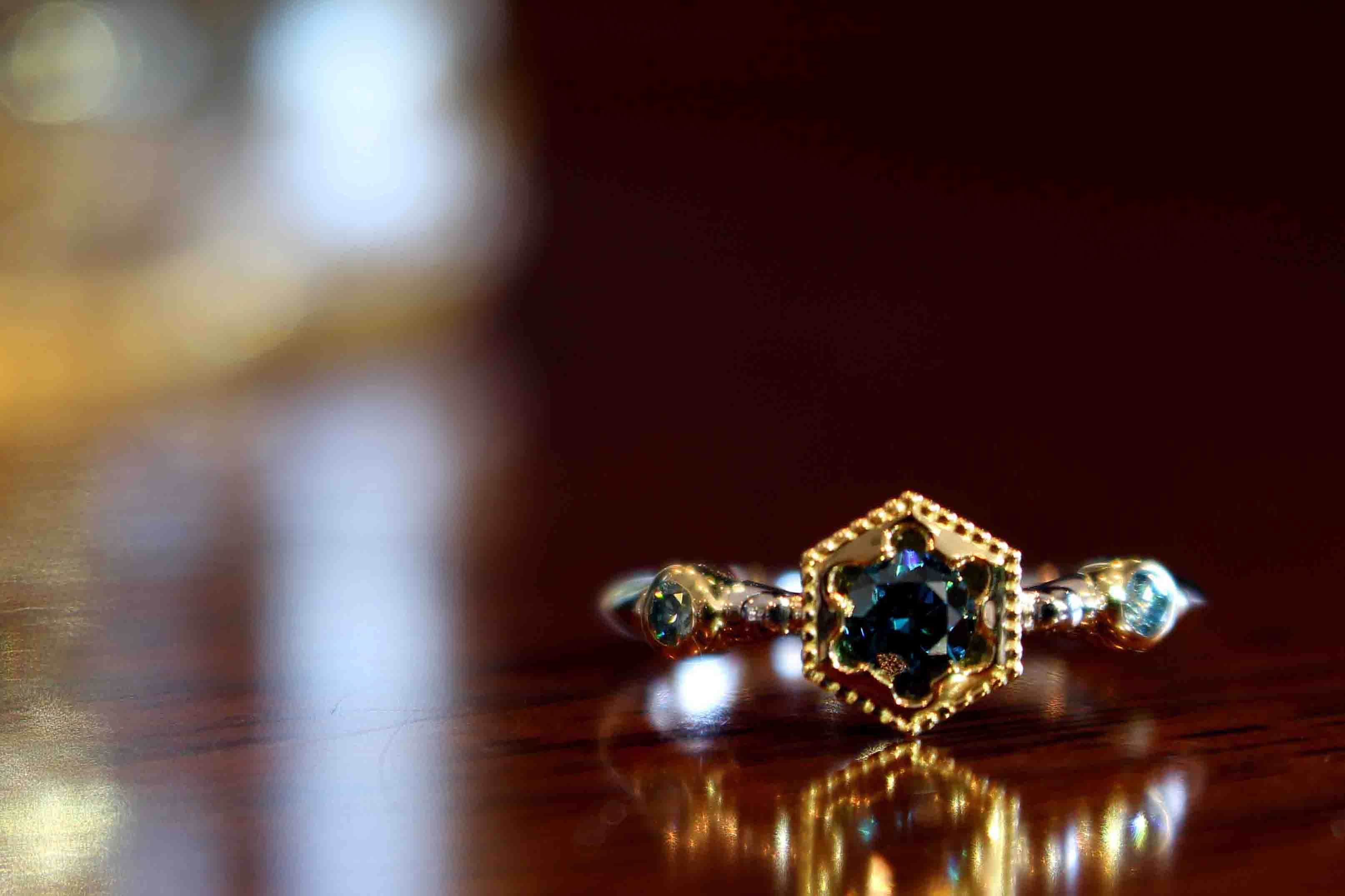 こちらの品物は彼女さんがブルーが大好きということで深いブルーのダイヤモンドをセンターストーンに、サイドストーンには淡い青のアイスブルーダイヤをセッティングしました。さらに特別感のあるエンゲージリングに仕上がりました。