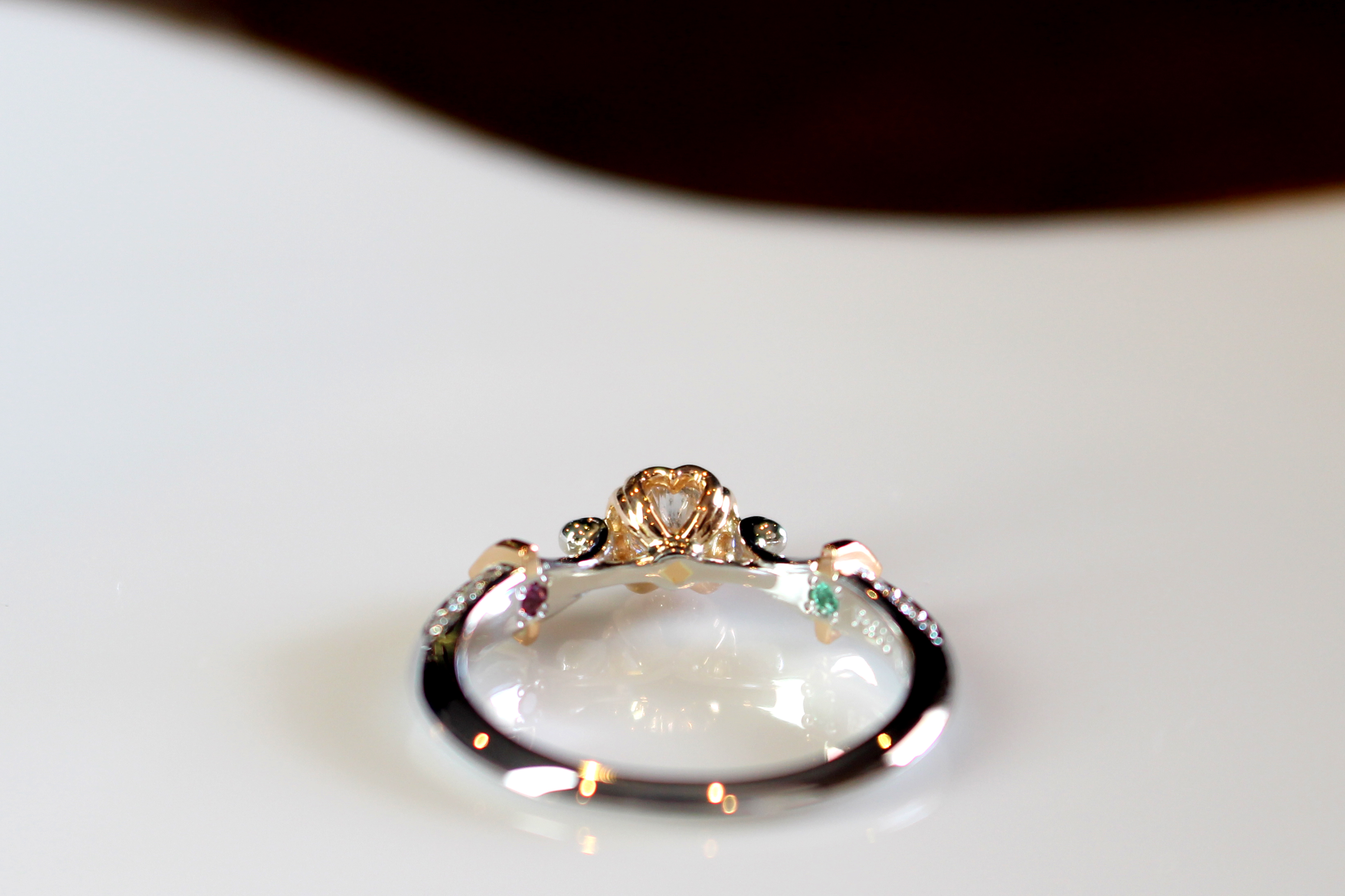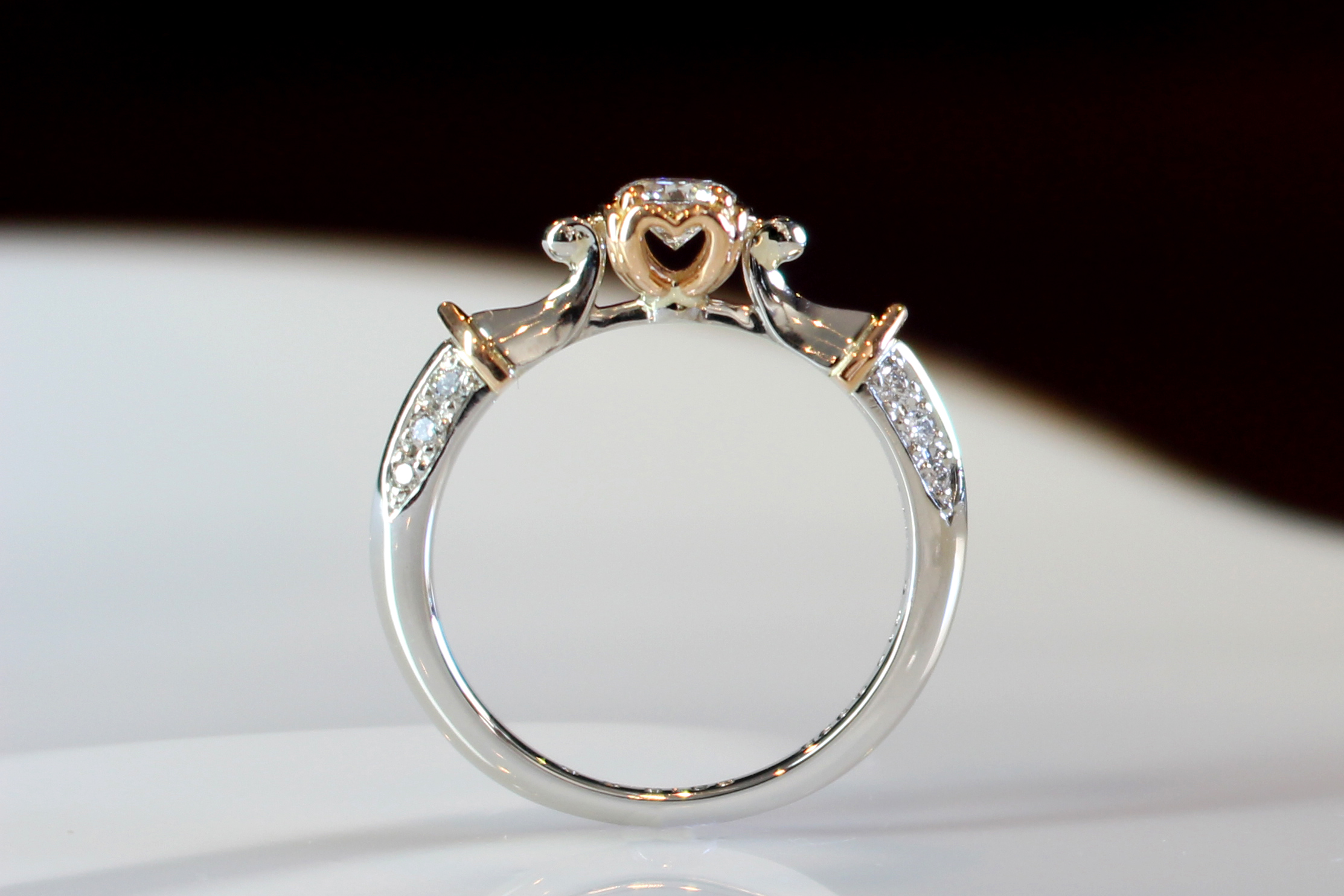 とにかく特別感にこだわりプラチナとピンクゴールドで制作させて頂きました。サイドにもダイヤモンドをセッティングし華やかな印象に。センターストーンの石座にはハートの透かし模様が入っています。内側にもお二人の誕生石をセッティング。喜んで頂けるポイントを詰め込みました。