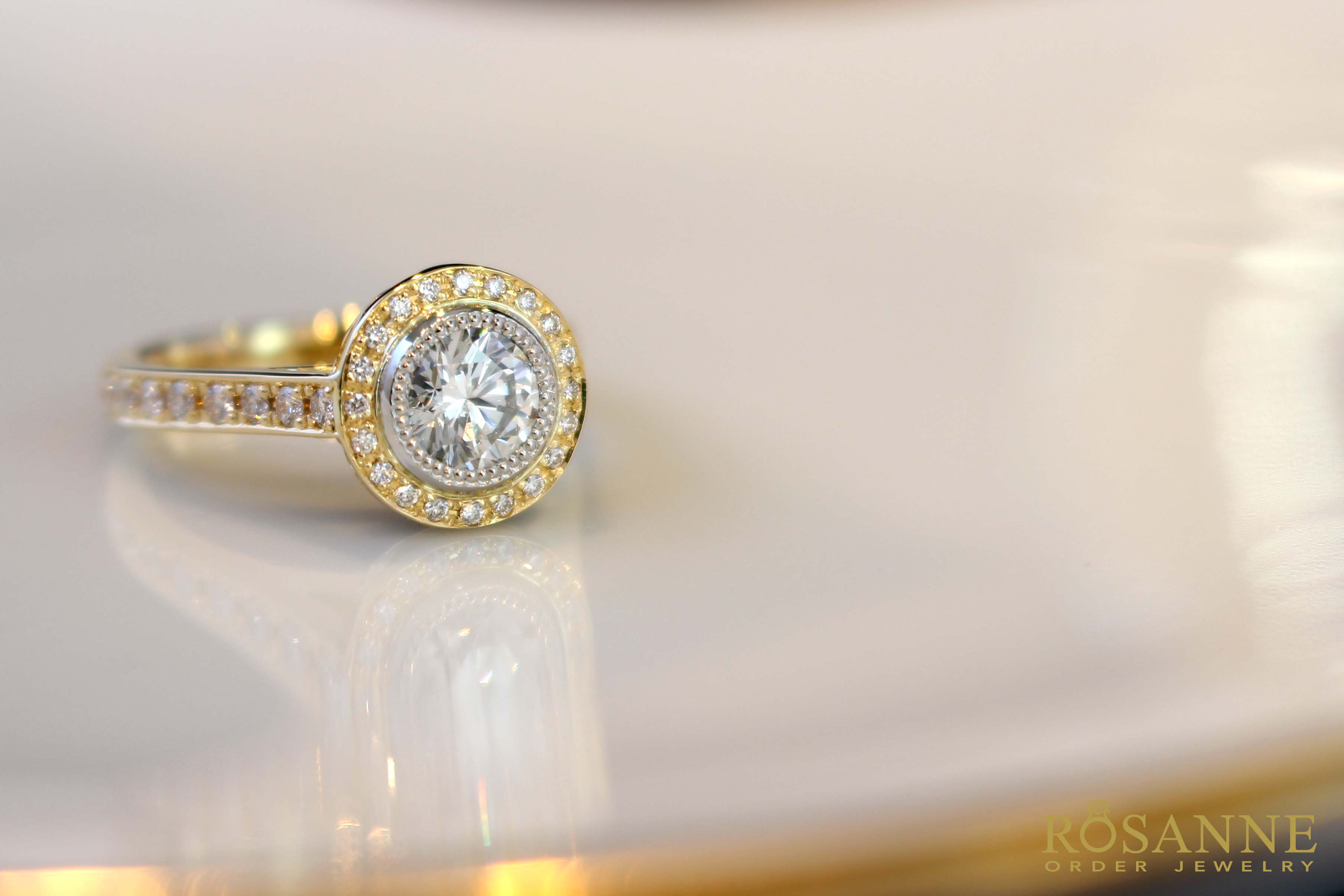 女性らしく豪華なデザインにしたいというご要望でお作り致しました。センターの大粒0.5カラットのダイヤモンドをプラチナの石座にセットし、ミル打ち加工でさらに華やかに。メレダイヤで取り巻きました。