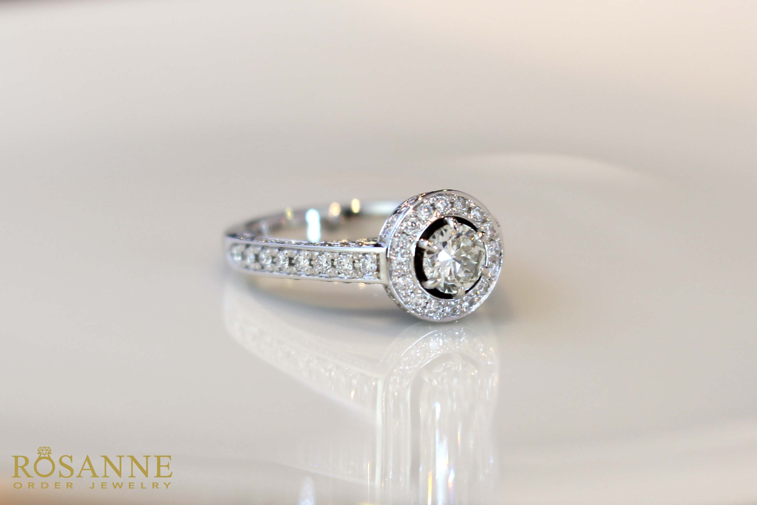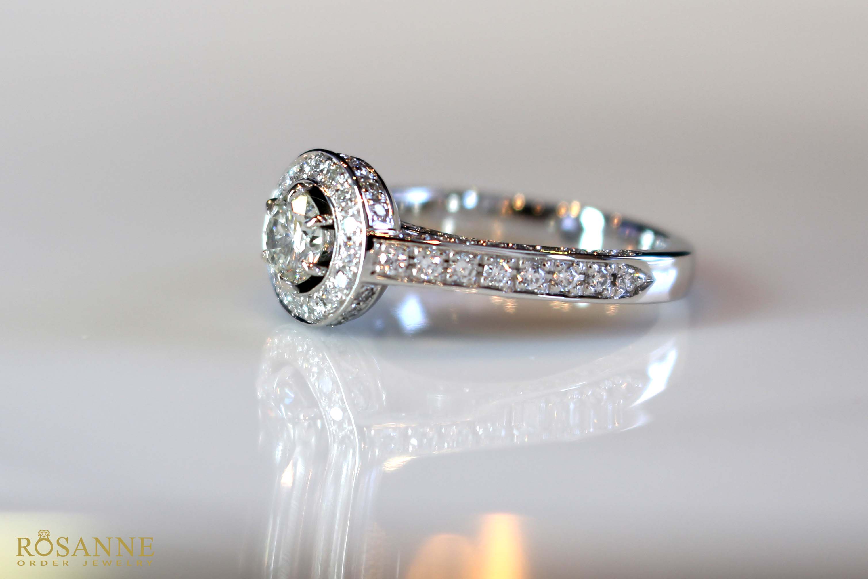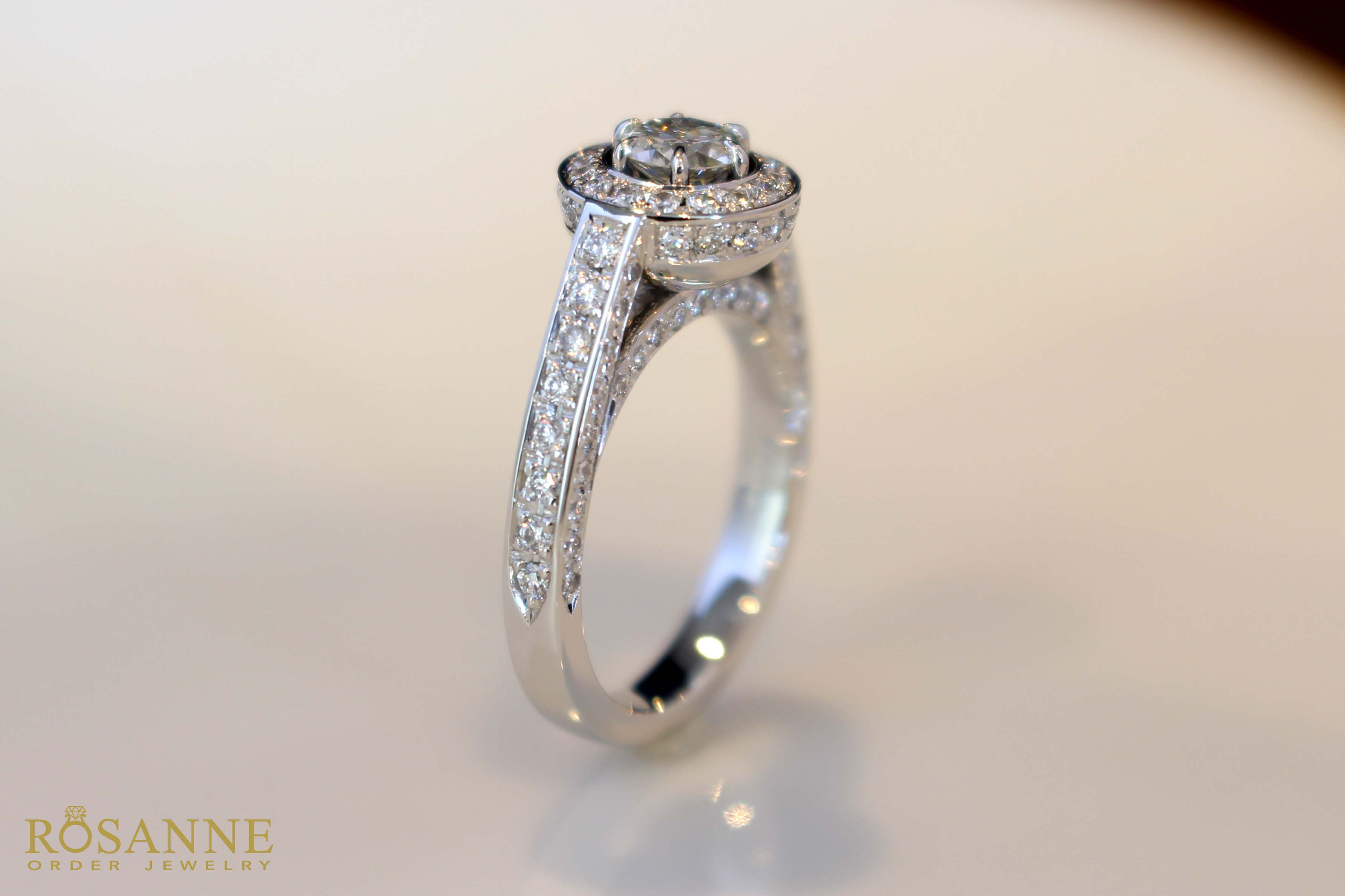 センターダイヤの取り巻きはもちろんどこから見ても小粒のダイヤモンドが並ぶことで細かな輝きが生まれクラシックで華やかなエンゲージリングに仕上がりました。