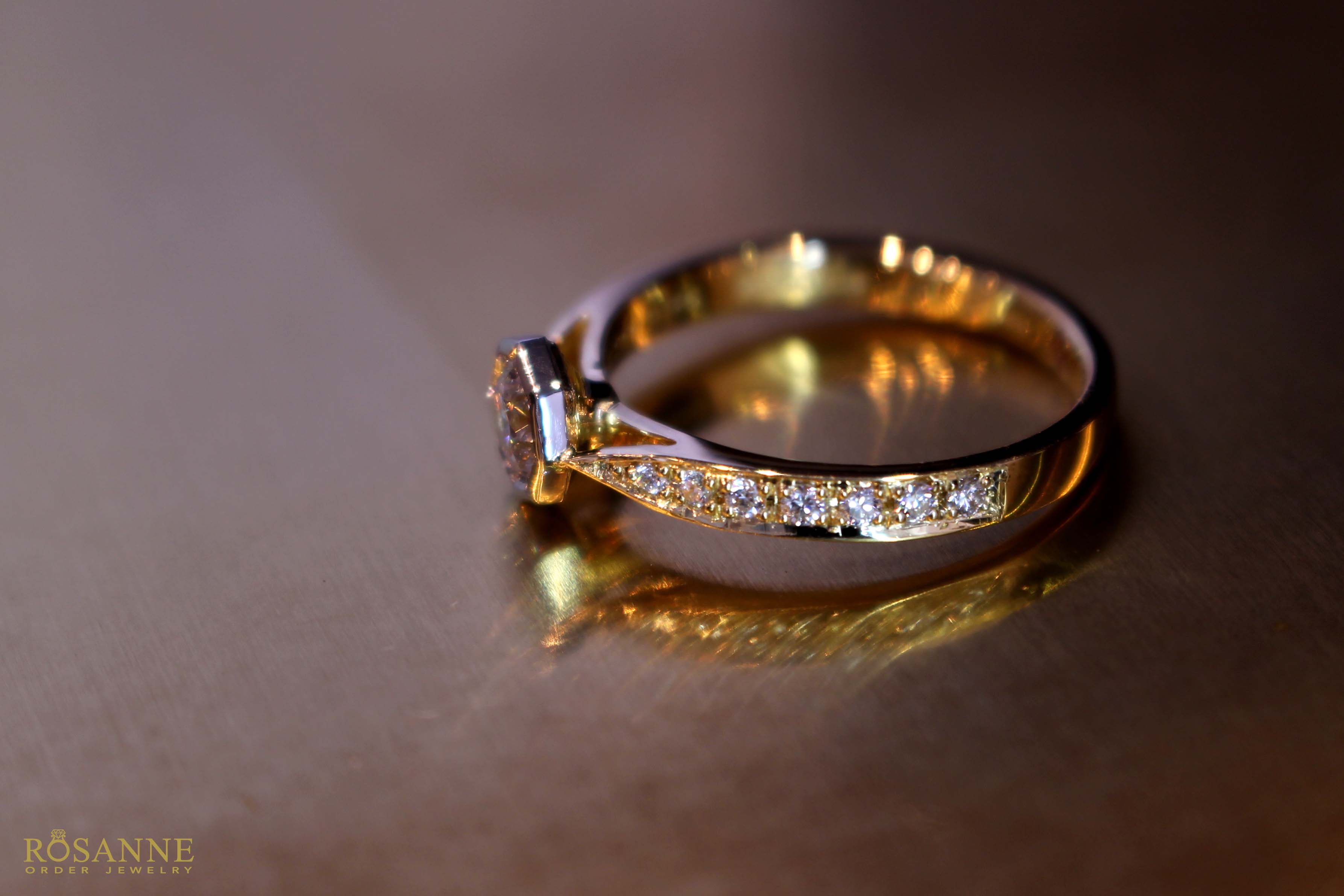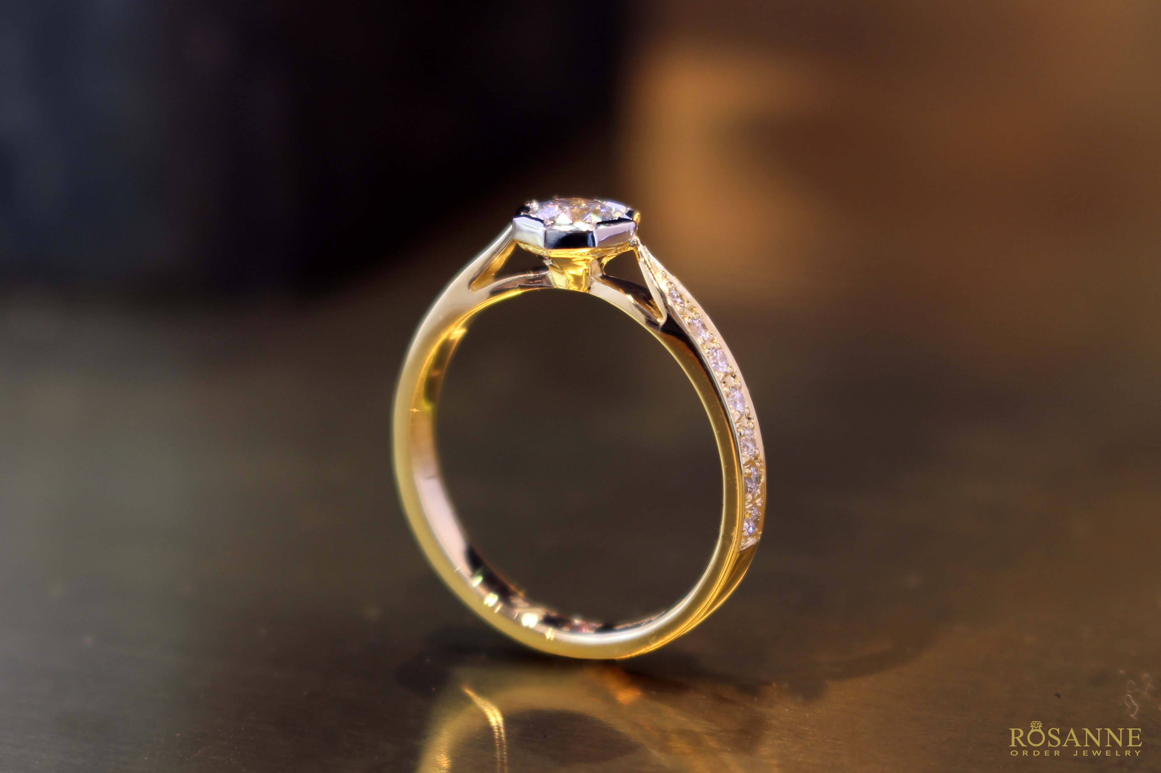 腕にはメレダイヤモンドをセットして華やかに。ダイヤモンドの周りのみプラチナを使った特別なコンビのエンゲージリングです。