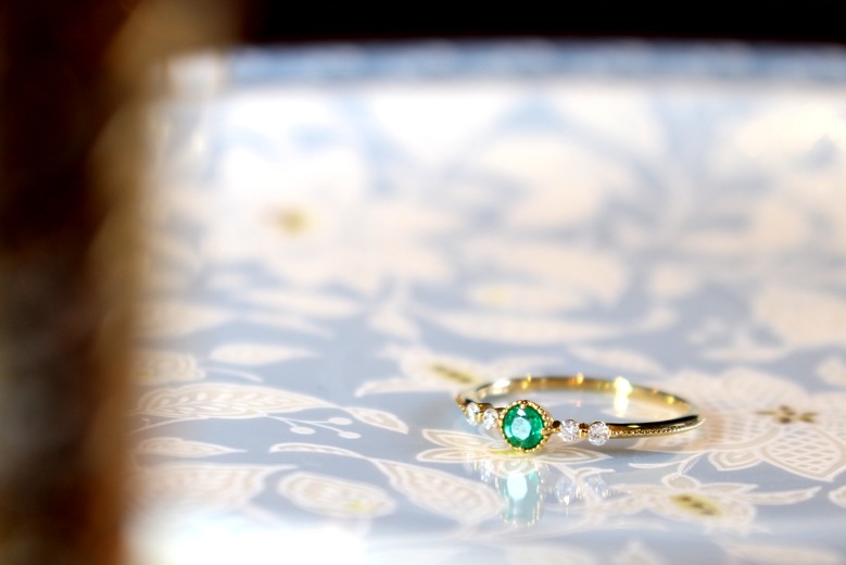 センターのエメラルドを取り巻くミル打ちが可愛いシンプルなリングです。