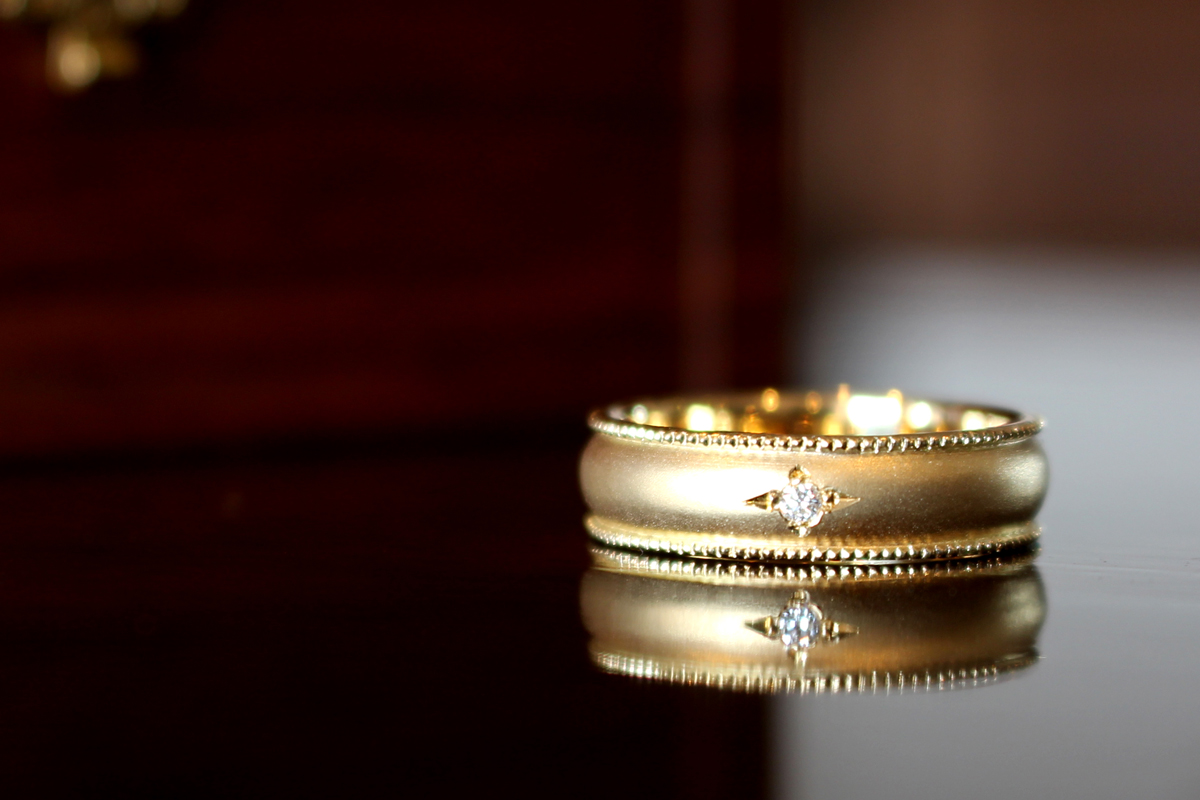 幅の太いリングをベースにサイドにミル打ちを施しクラシカルな雰囲気に。艶消しのマットな質感とミル打ちのキラキラが楽しいリングです。