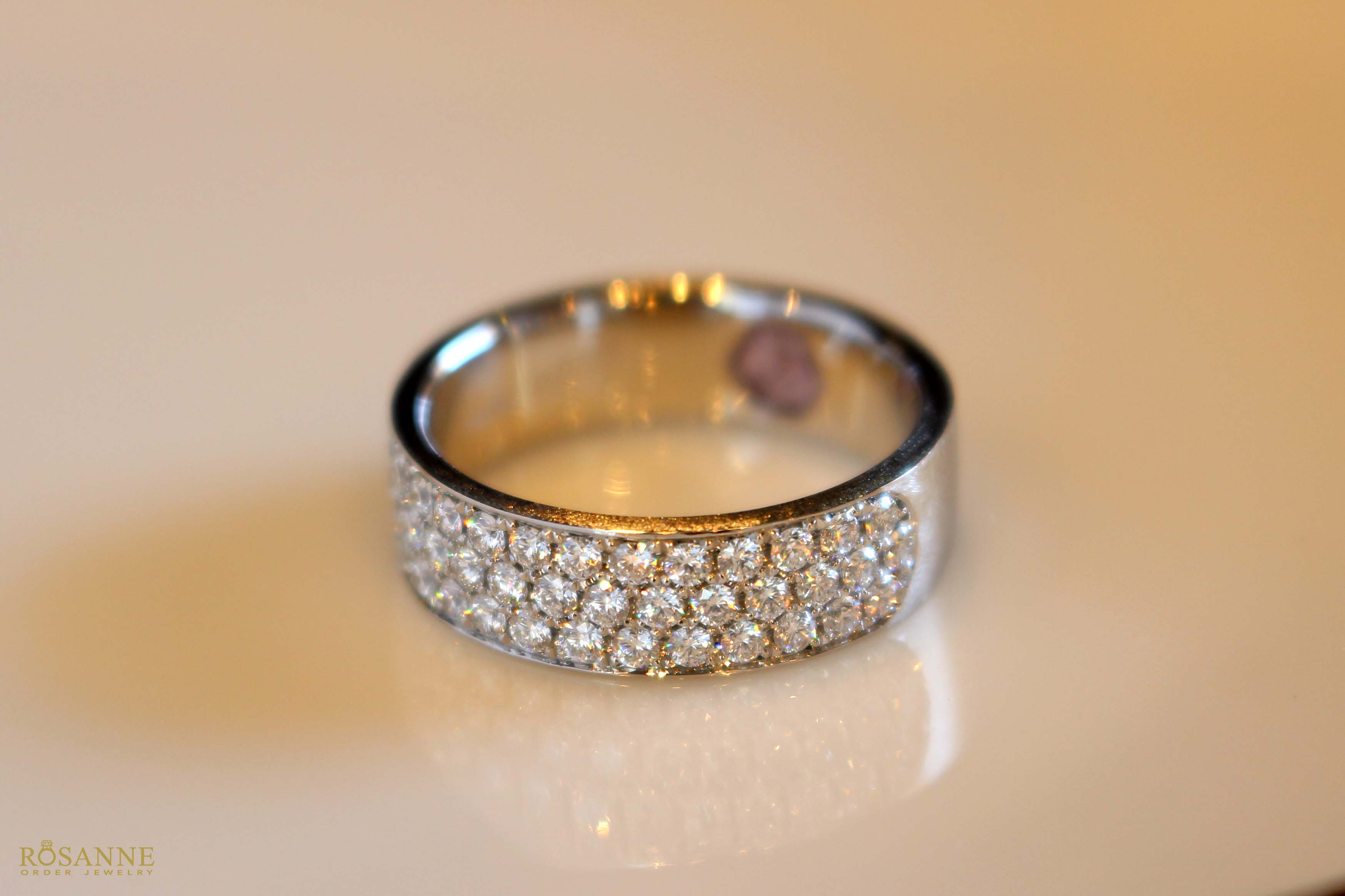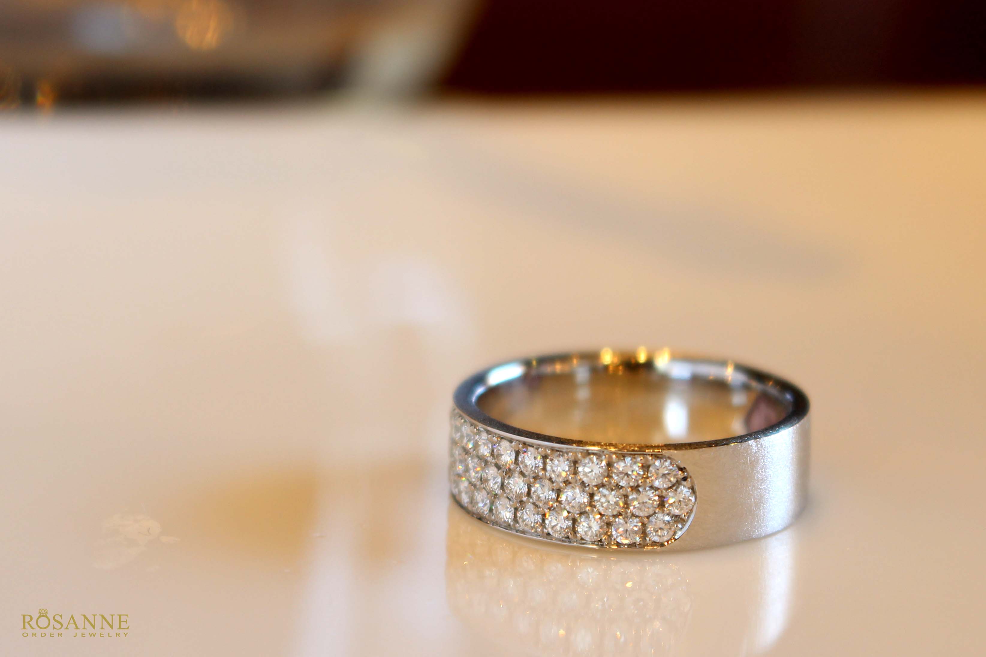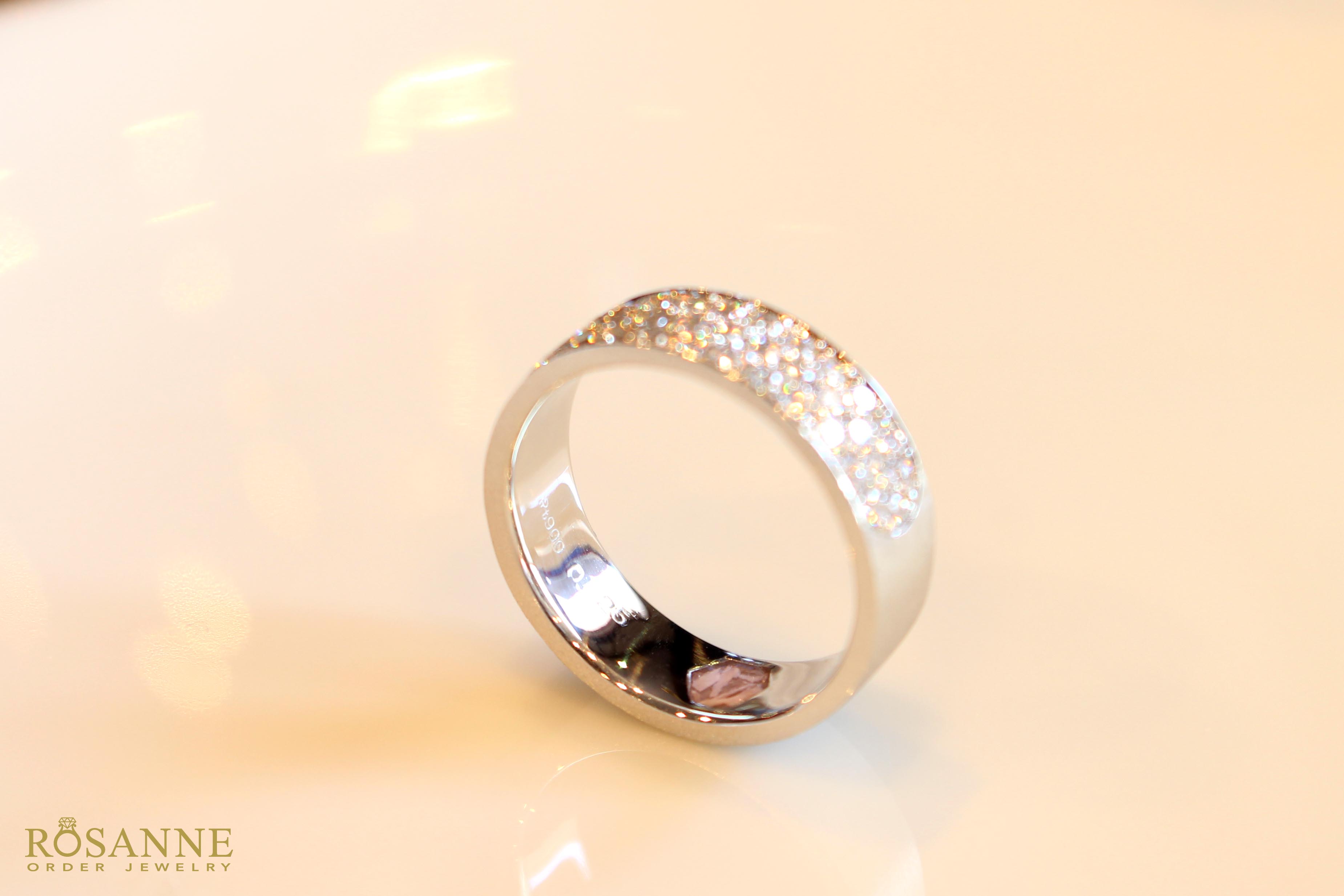 プラチナの平打ちリングにダイヤモンドをまんべんなくパヴェセッティングしたリング。