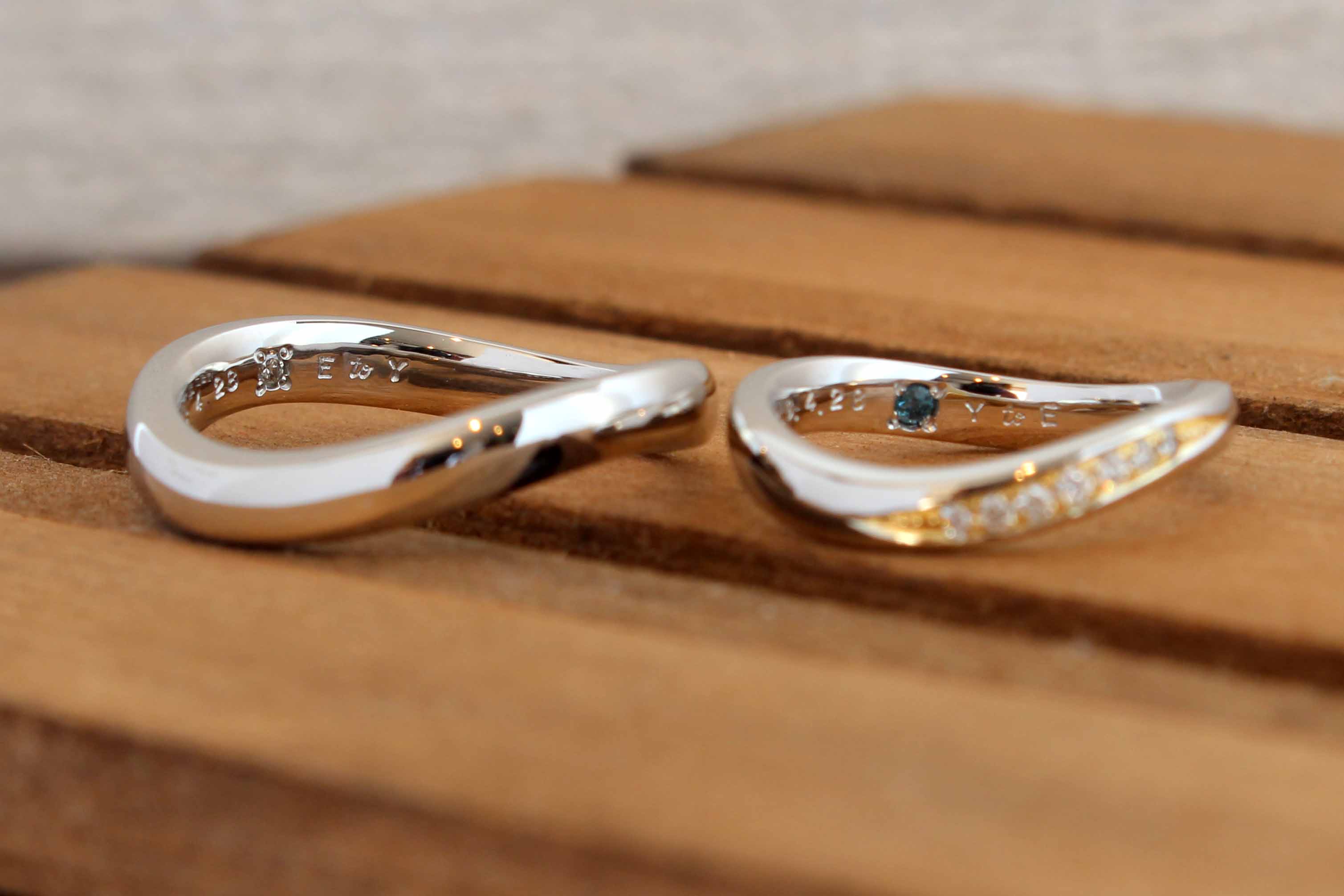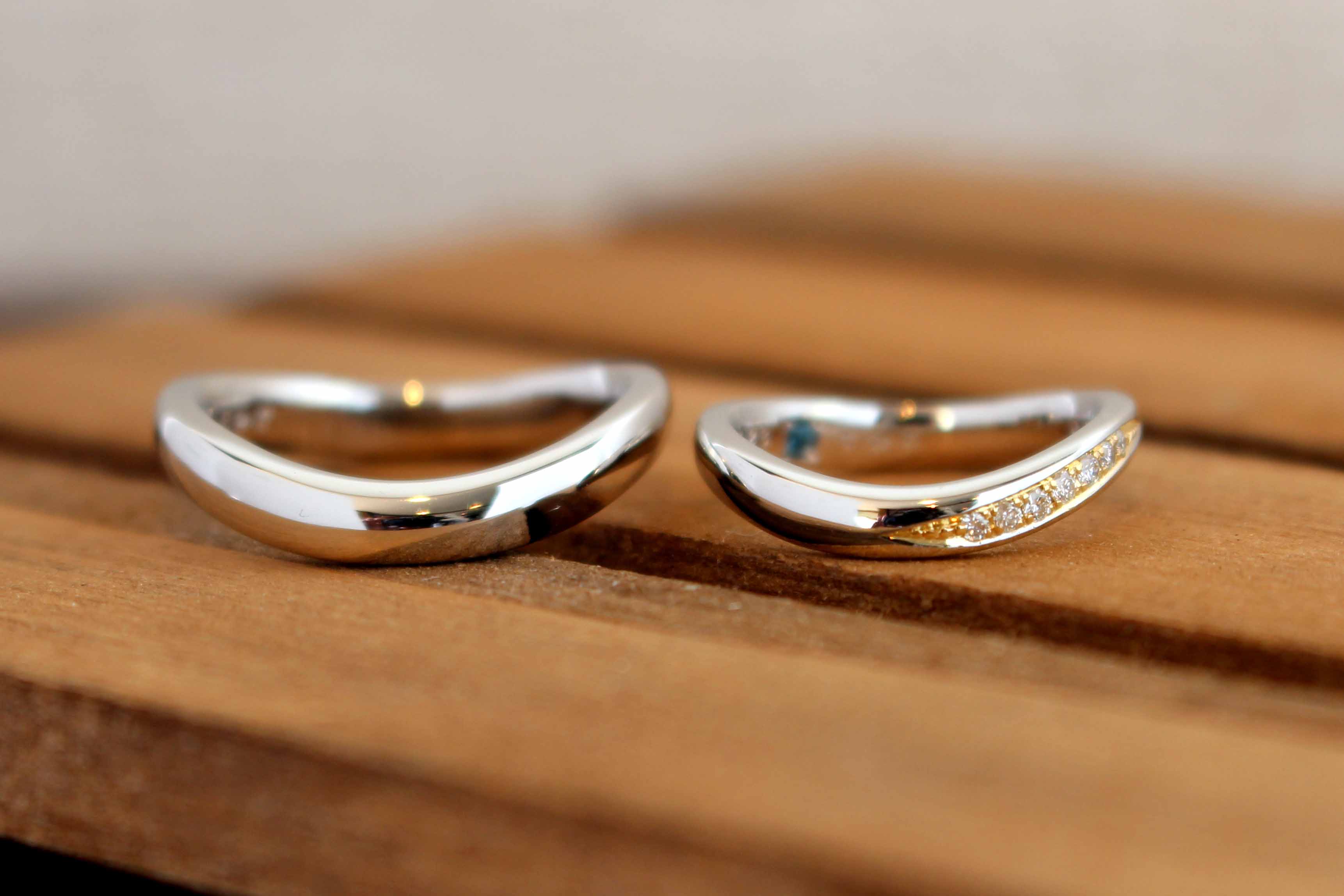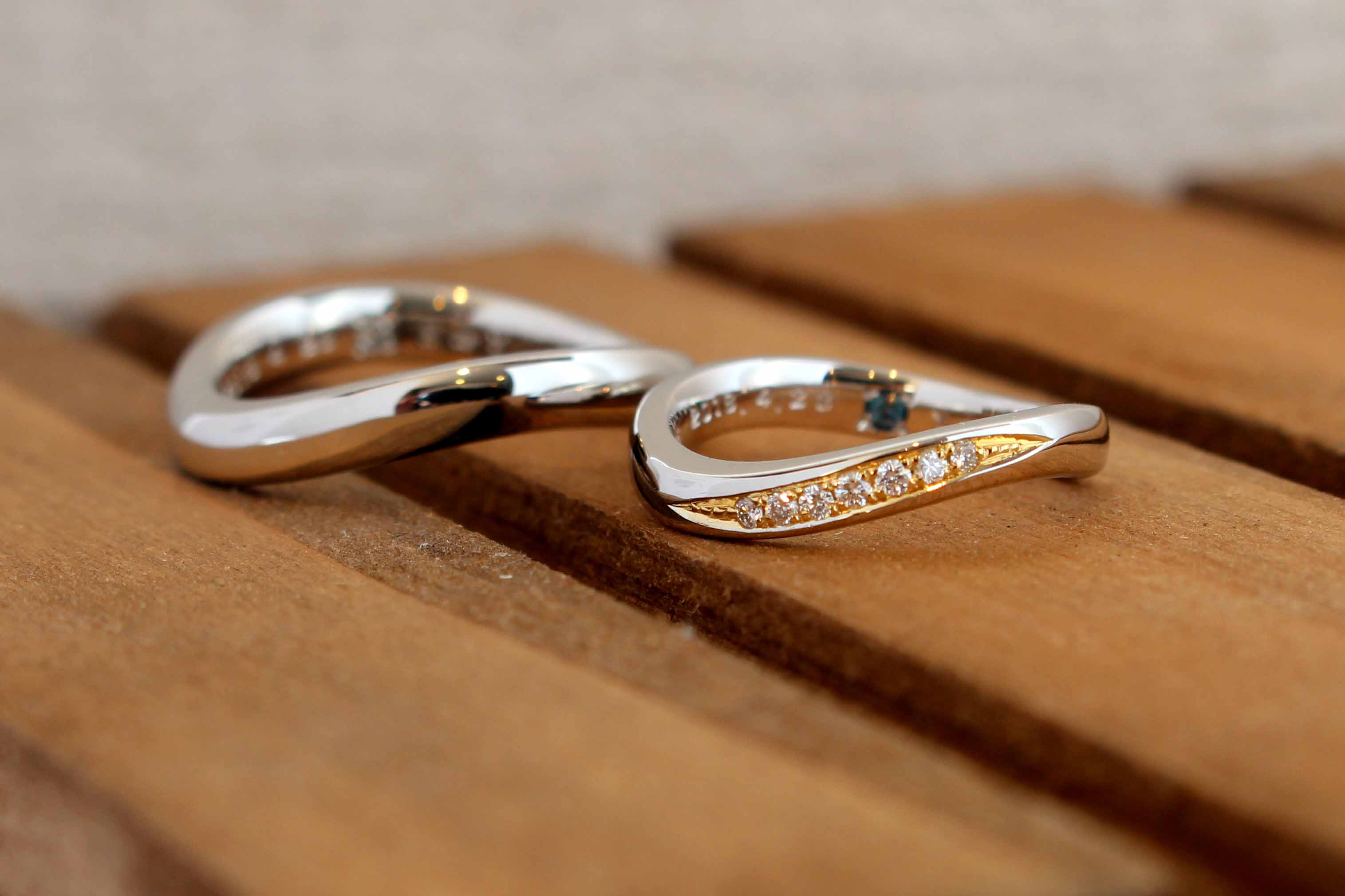 こちらはのリングですがメンズはとことんシンプルにプラチナで、レディースはダイヤモンドの周りのみイエローゴールドでセミオーダー頂きました。