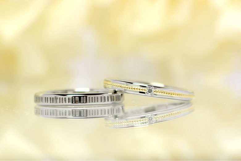 レディースはセンターをイエローゴールドでクラシカルな雰囲気に。フォルムに共通点を持たせペア感も演出致しました。
