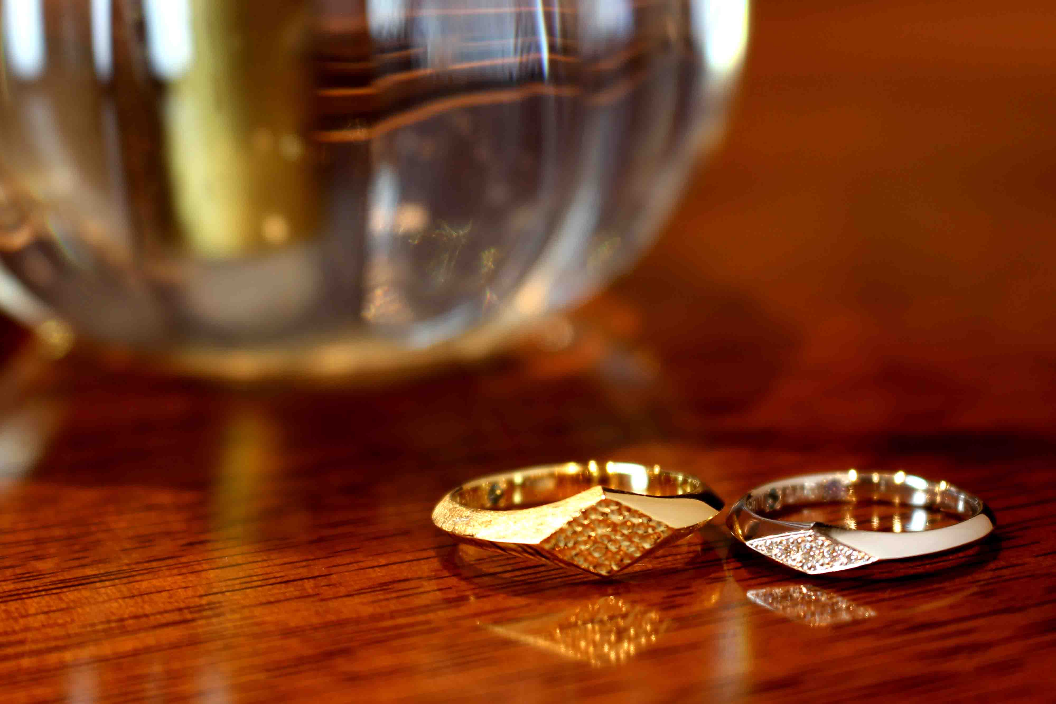 メンズは幅太で男らしく、レディースはダイヤモンドを5ピースセッティングして女性らしくエレガントに。他とは一味違うマリッジリングです。
