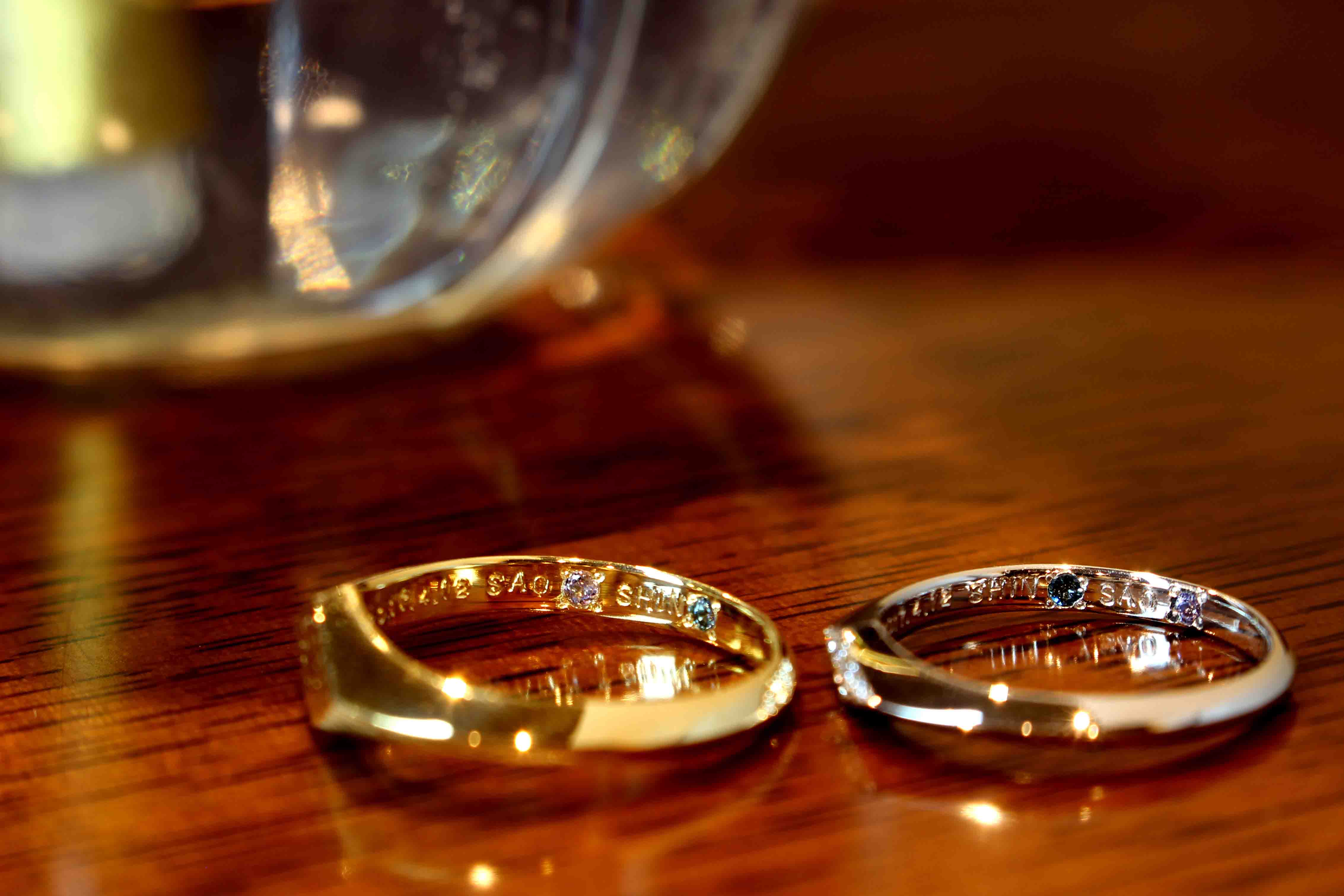 お写真の品物はオーダー頂いた品物ですが、メンズはハンマーで叩いた槌目加工、荒らし仕上げ、磨き仕上げとあたたかみのある質感に。レディースはVSクラスの美しいダイヤモンドを5ピースセッティング致しました。
