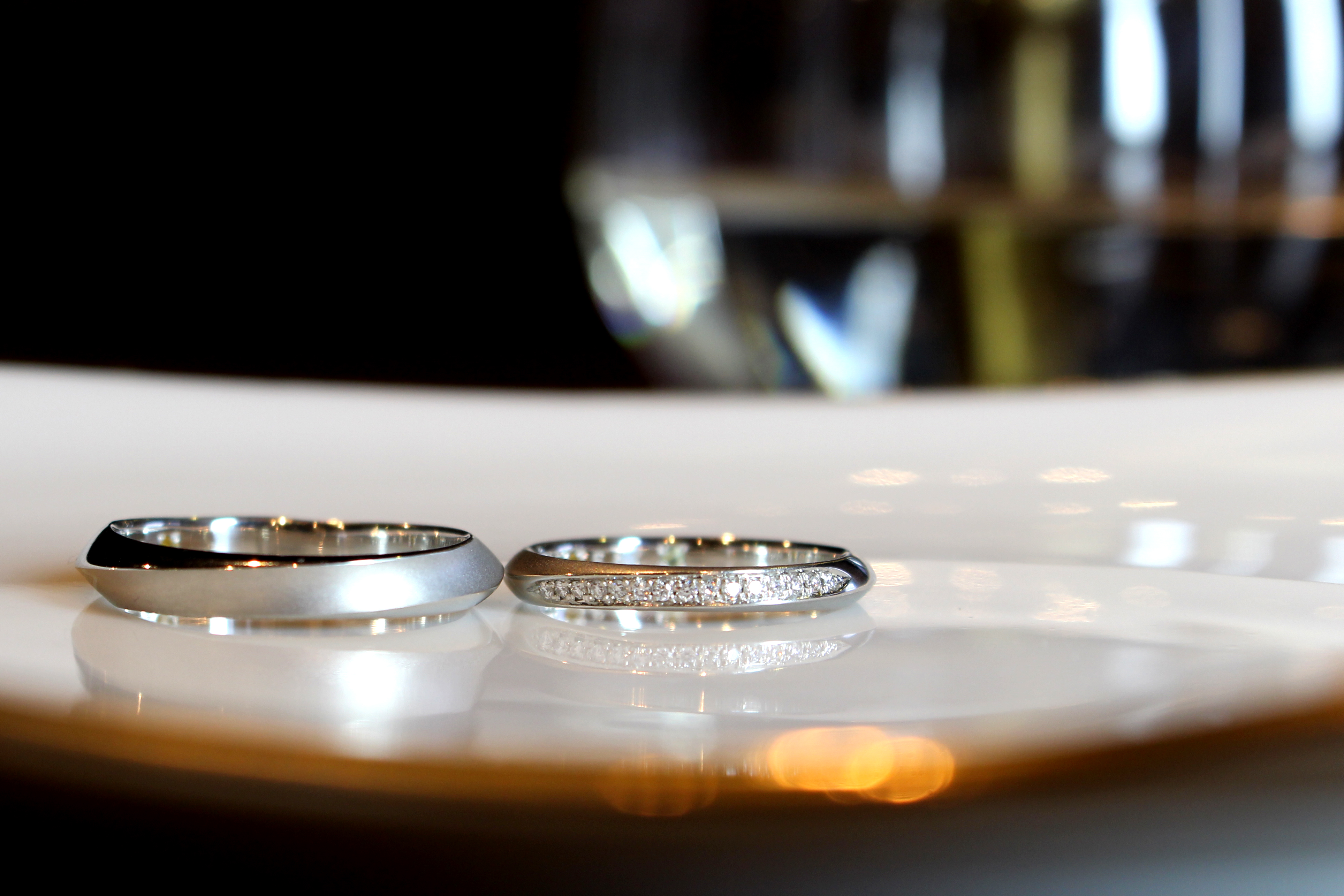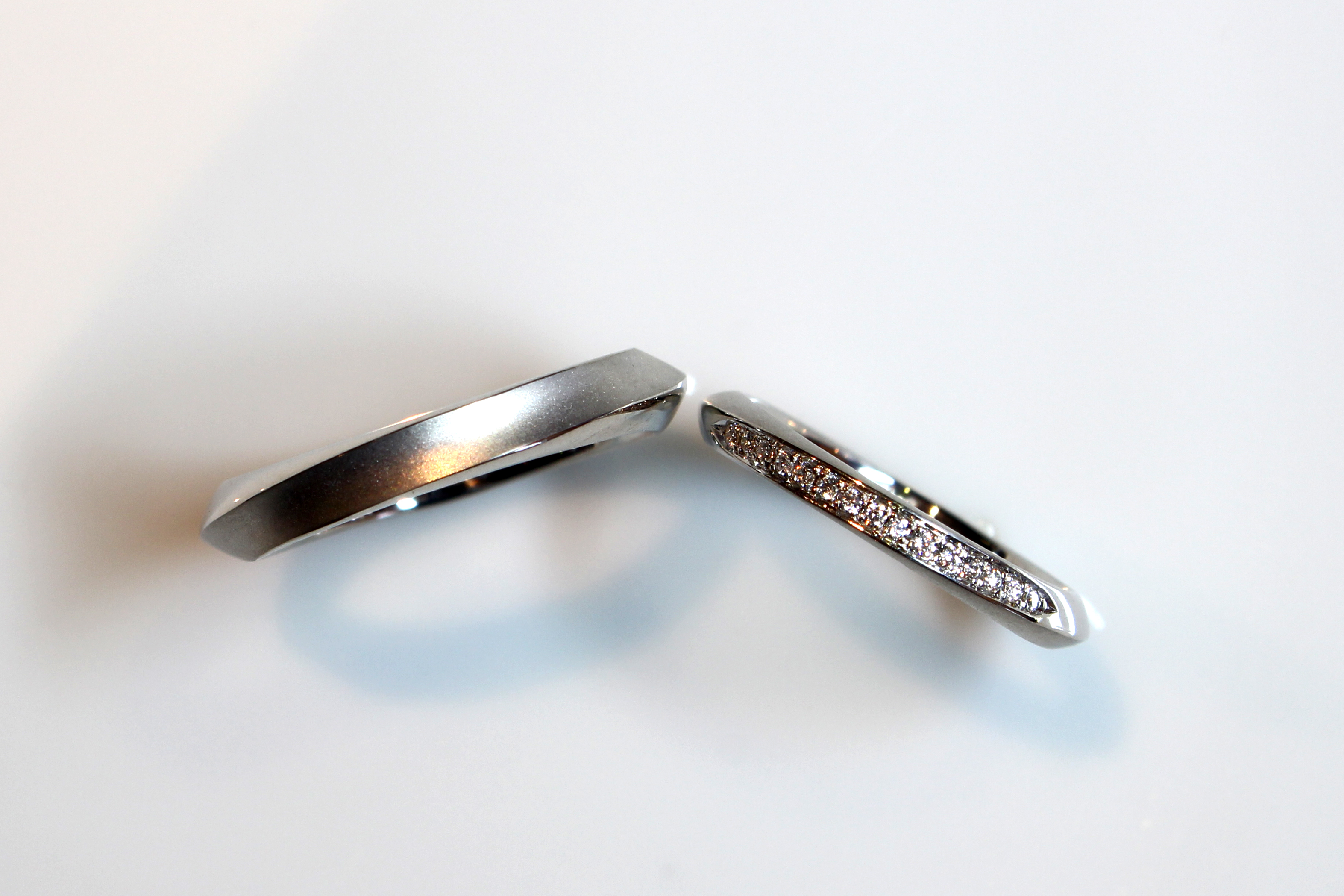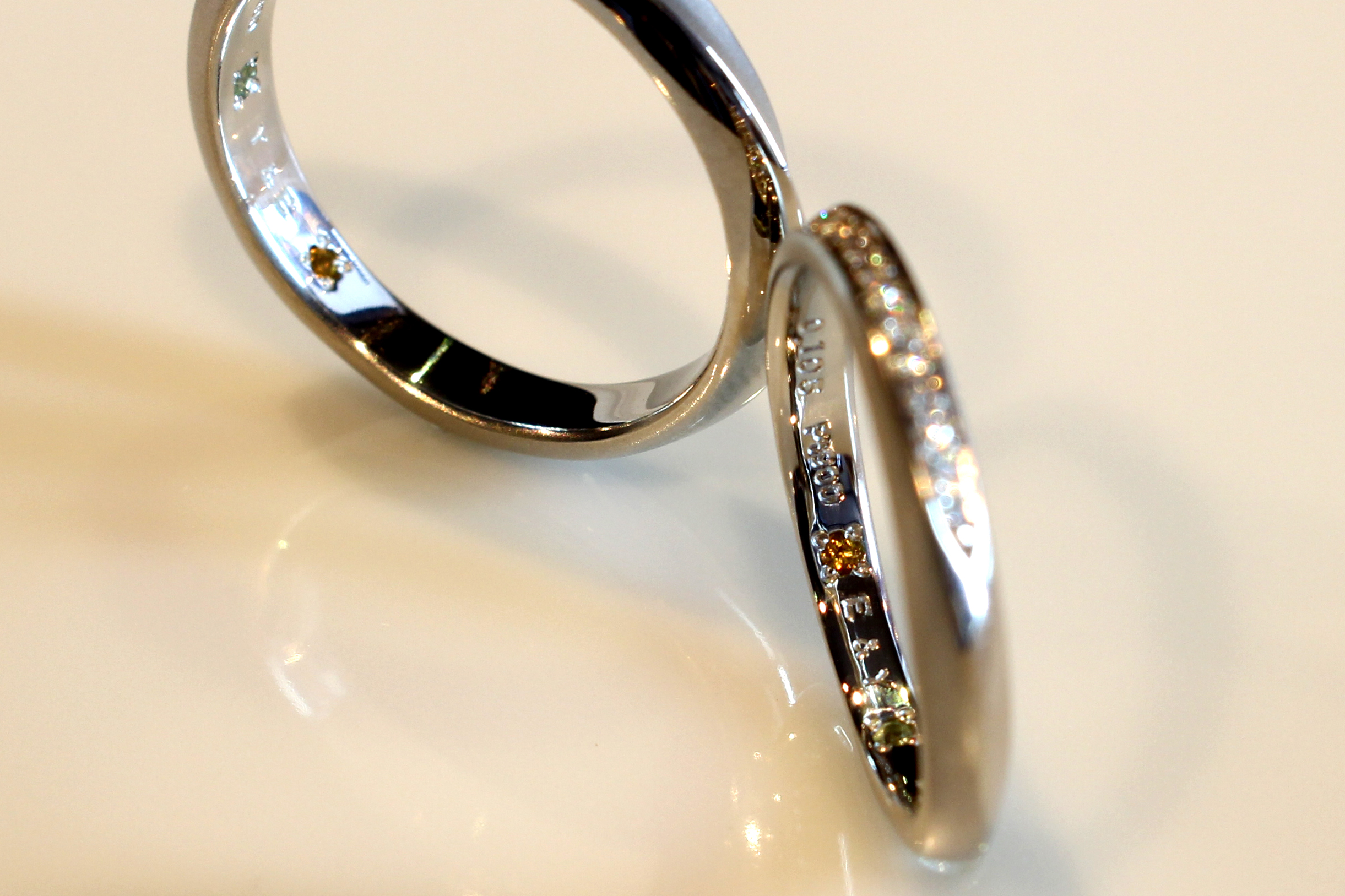 艶消しと磨きのコントラストがリングのデザインをよりはっきりと見せています。内側にはお2人の誕生石をセッティング。お2人だけの素敵なリングに仕上がりました。