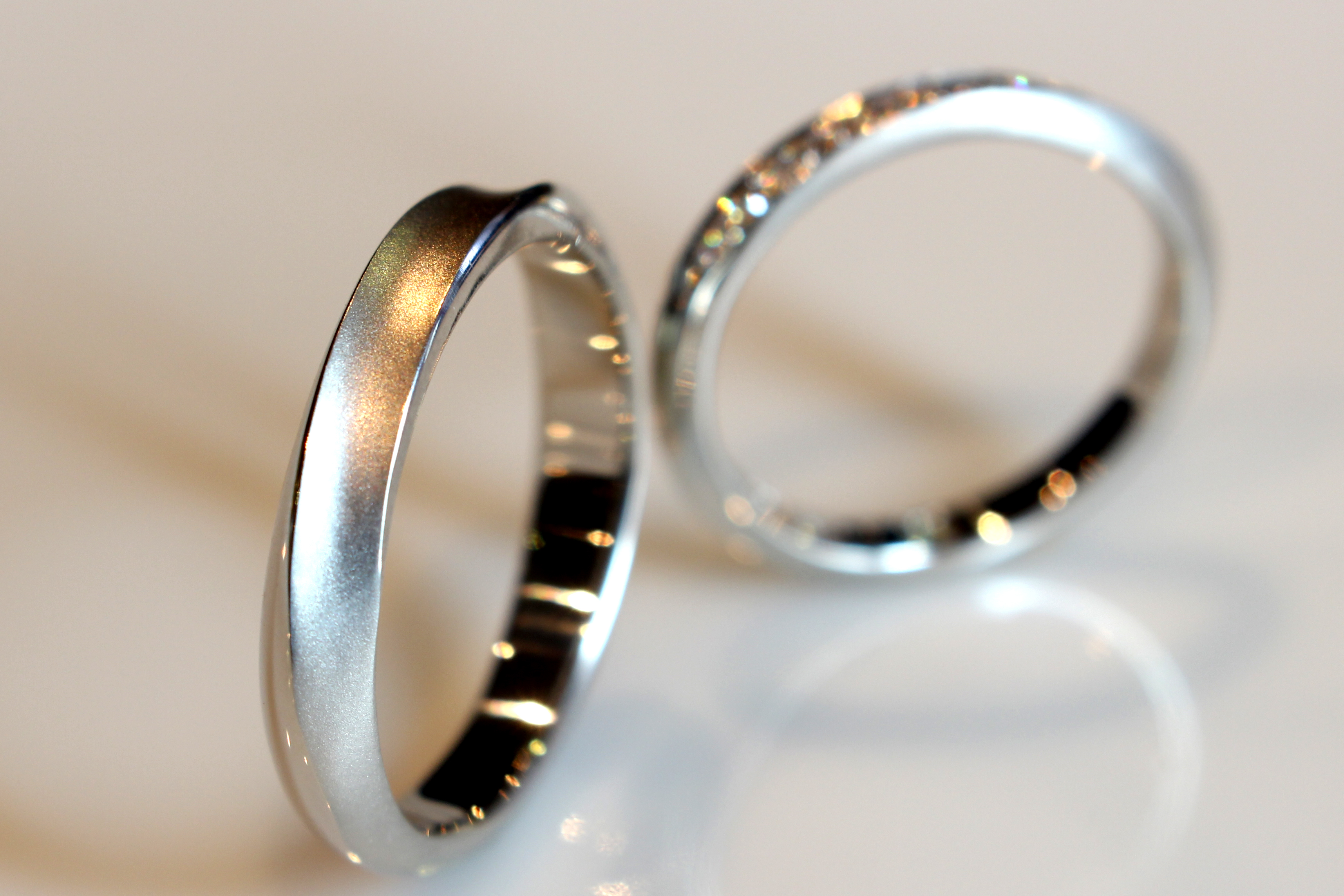 180度ひねりを加えたデザインです。メンズはトップのみ凹みを設けてシャープなイメージに、レディースは丸みを付け最上級グレードのダイヤモンドをセッティング致しました。