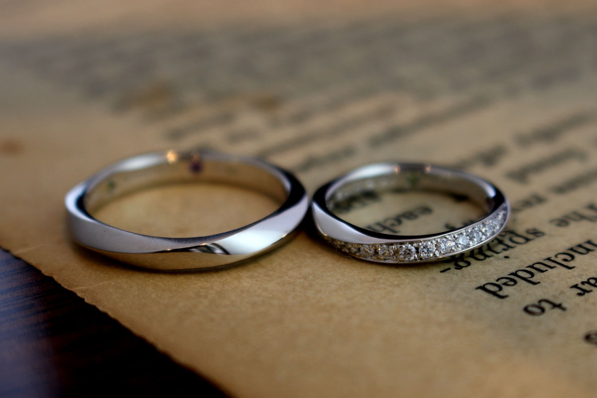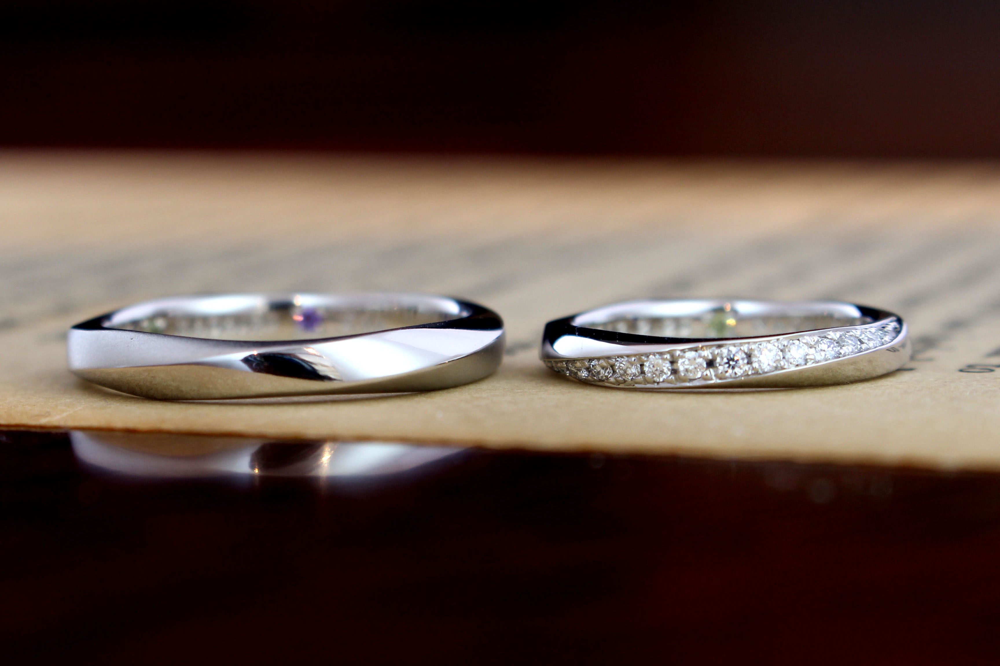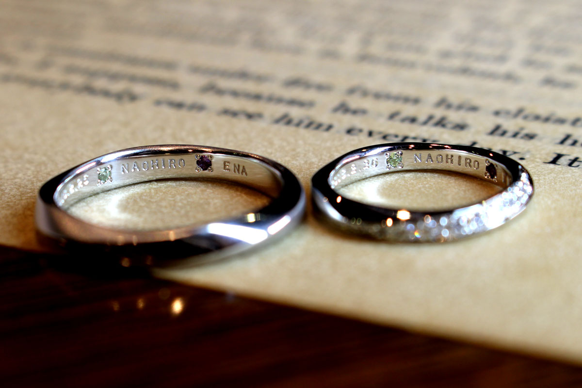 メンズはつや消し加工と磨き加工でコントラストを出しました。 レディースにはVSクラス最上級のダイヤモンドをグラデーションセッティングし、女性らしく華やかに。しっかりと地金を使いつつ繊細さももたせました。内側にはお2人の誕生石をセッティング。ペリドットとアメジストがとても綺麗に輝きます。