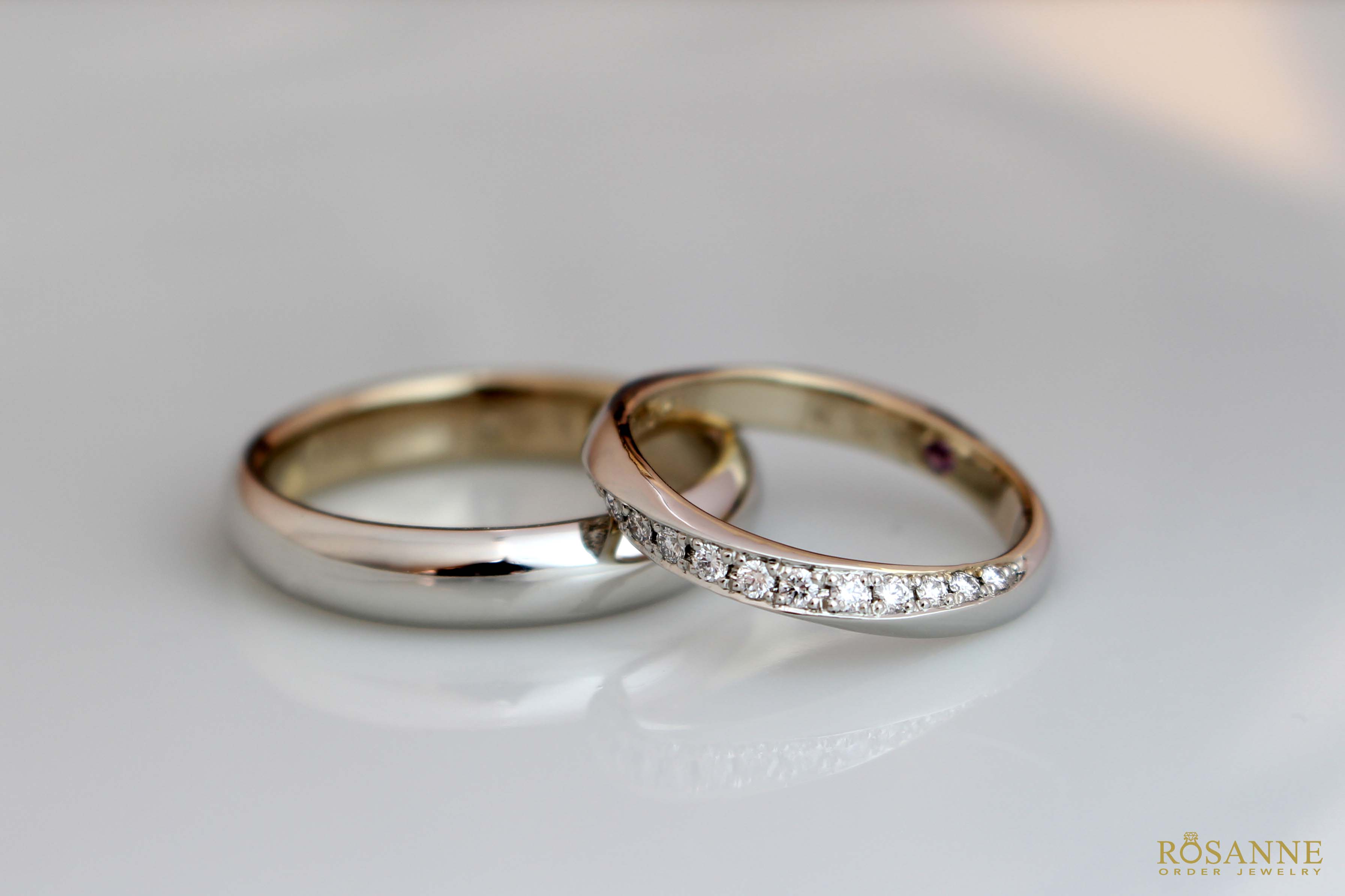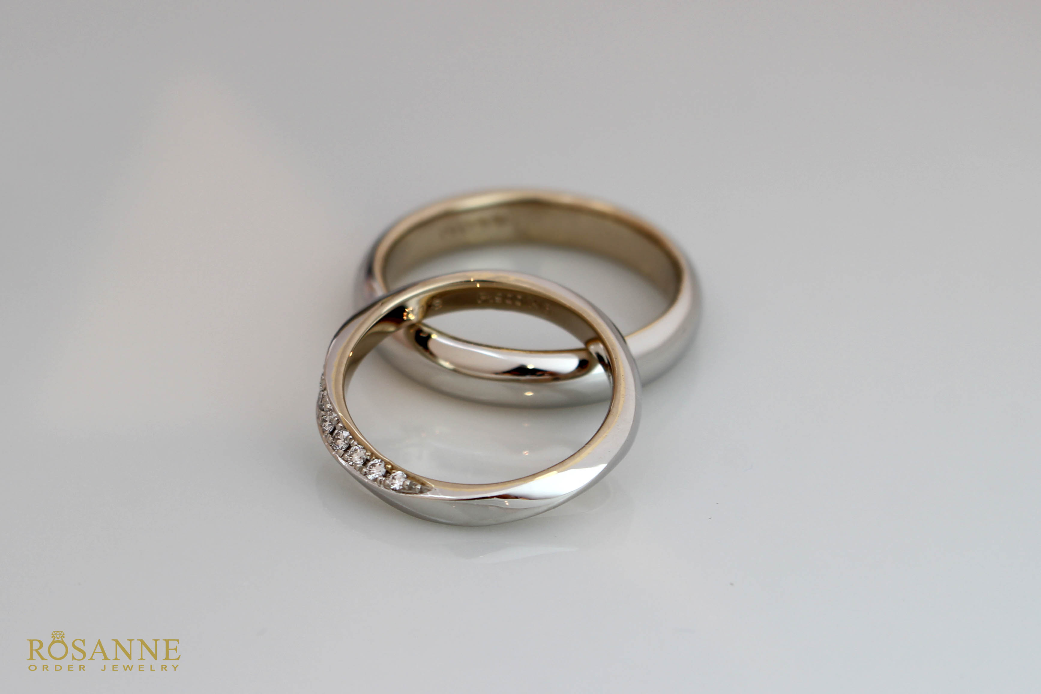シンプルな甲丸リングと当店オリジナルのひねりリングをベースにお二人のお好きな2種類の素材で制作したマリッジリング。