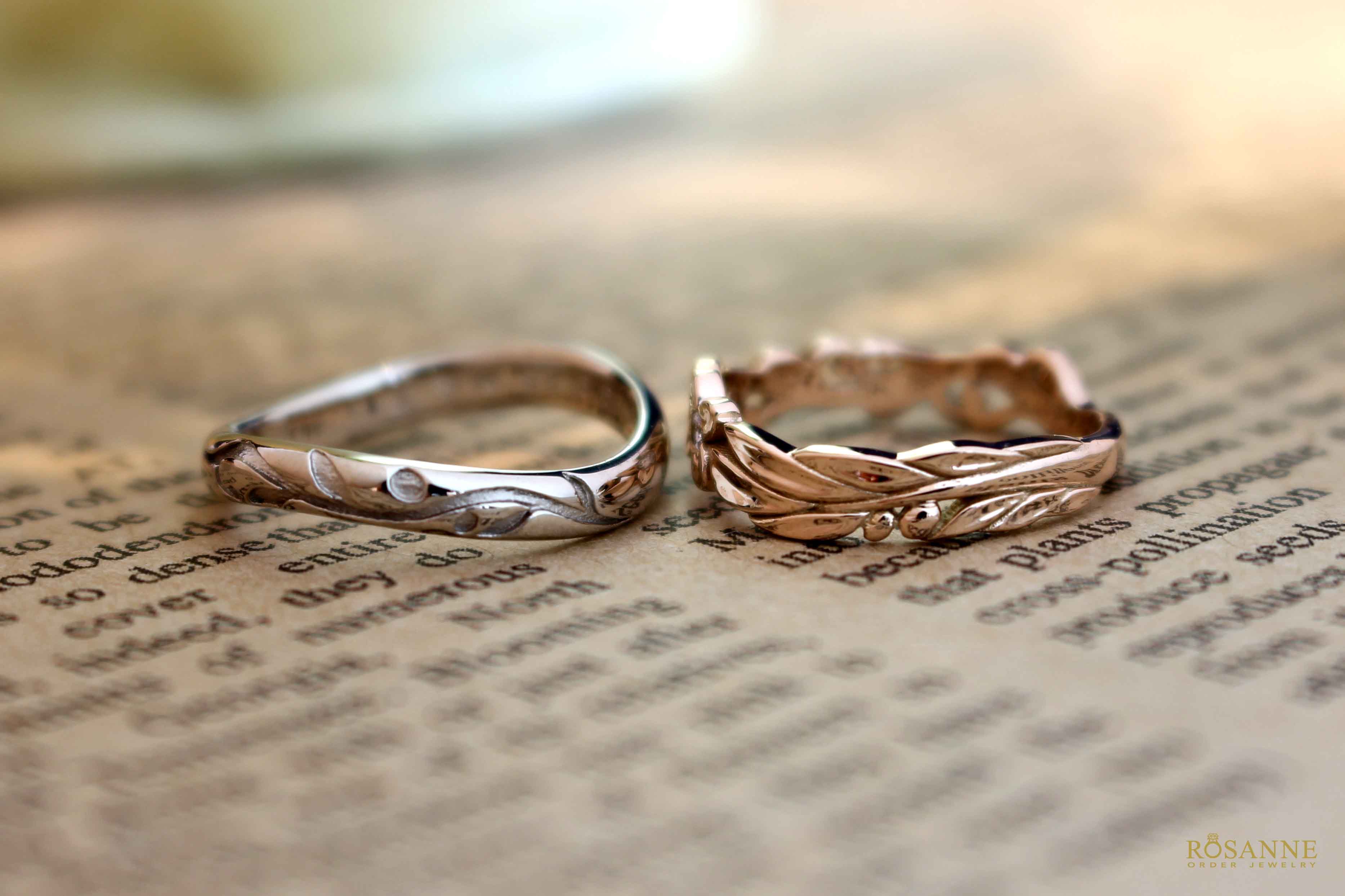 メンズは緩やかな曲線で構成された甲丸リングをベースにオリーブの葉や身を彫入れました。身につける位置でU字やSの字に表情を変えるウェーブリングです。レディースは透かし彫りでオリーブと唐草模様を表現しました。オリーブの花にはダイヤモンドをセットしています。