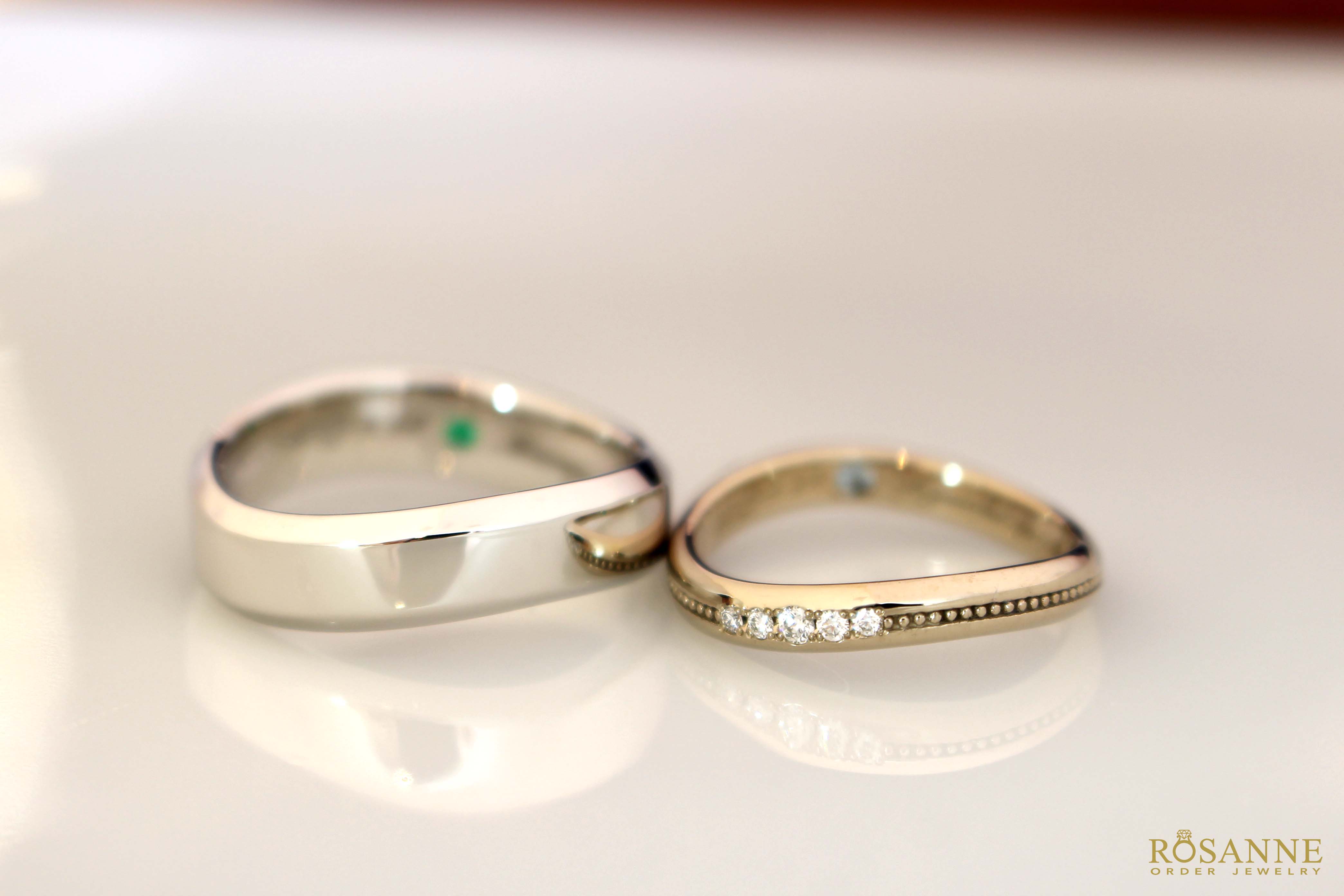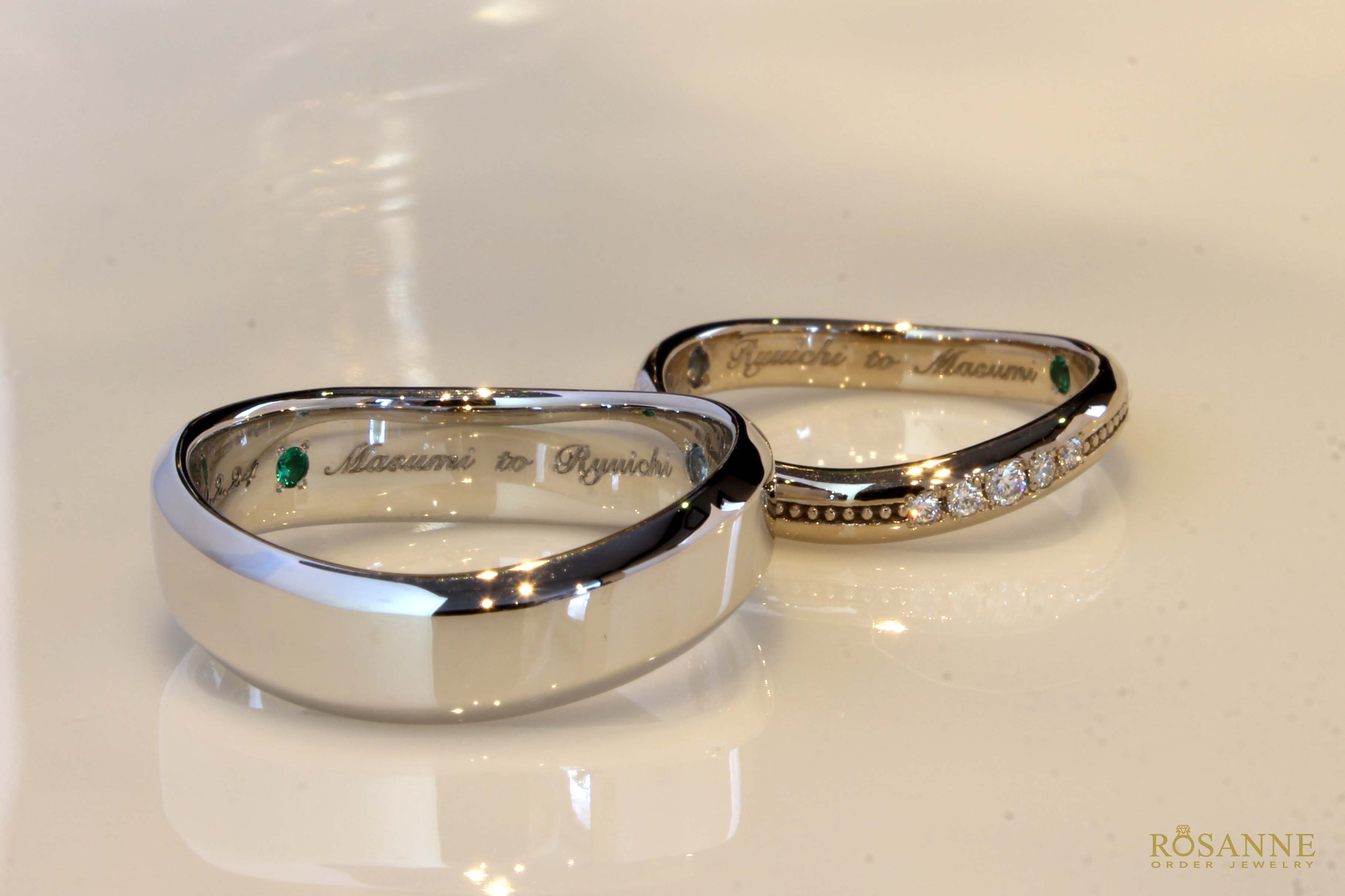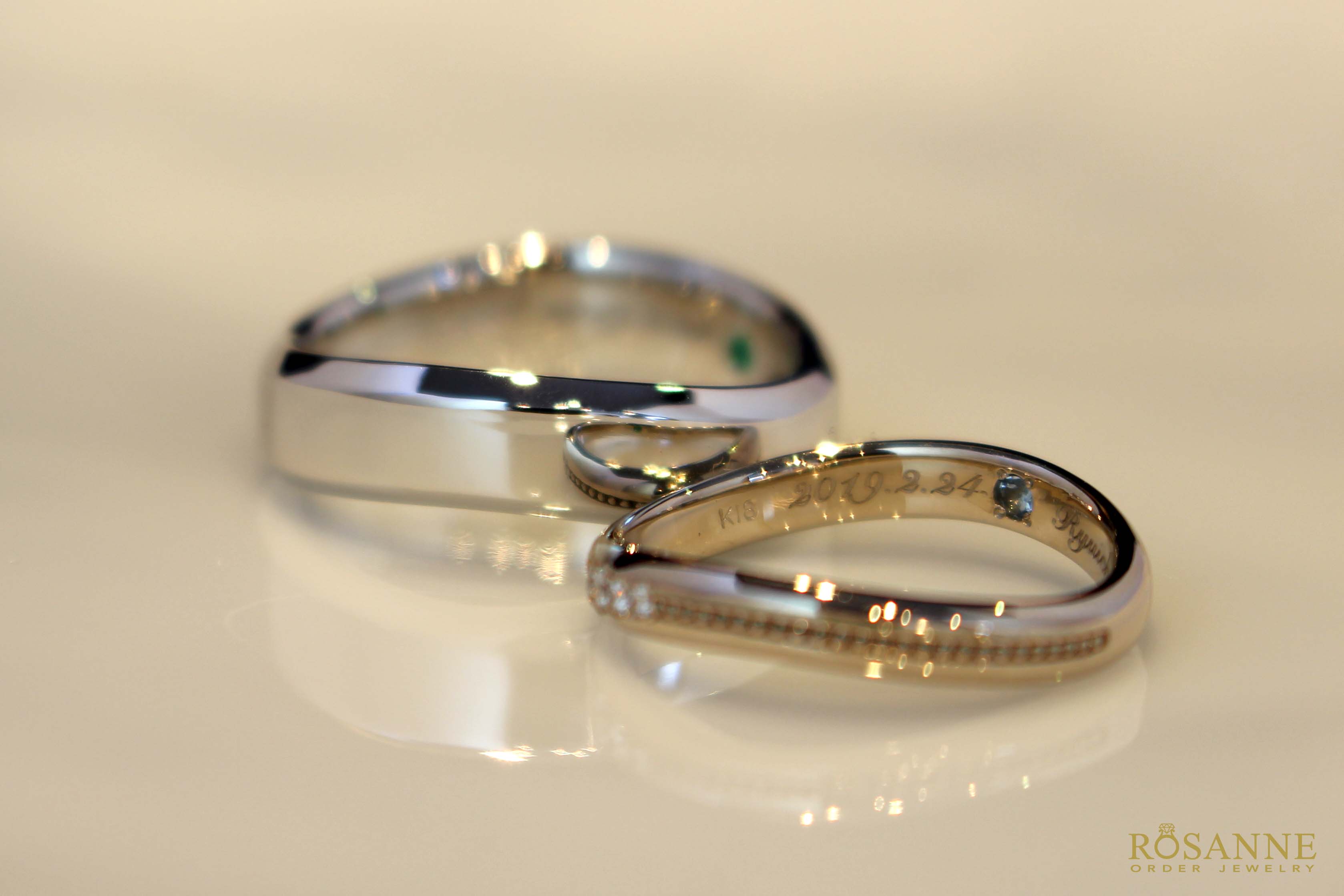 それぞれお好きな素材でご注文頂きました。メンズはプラチナで重厚感を、レディースはシャンパンゴールドで暖かい色合いのマリッジリングに仕上がっております。