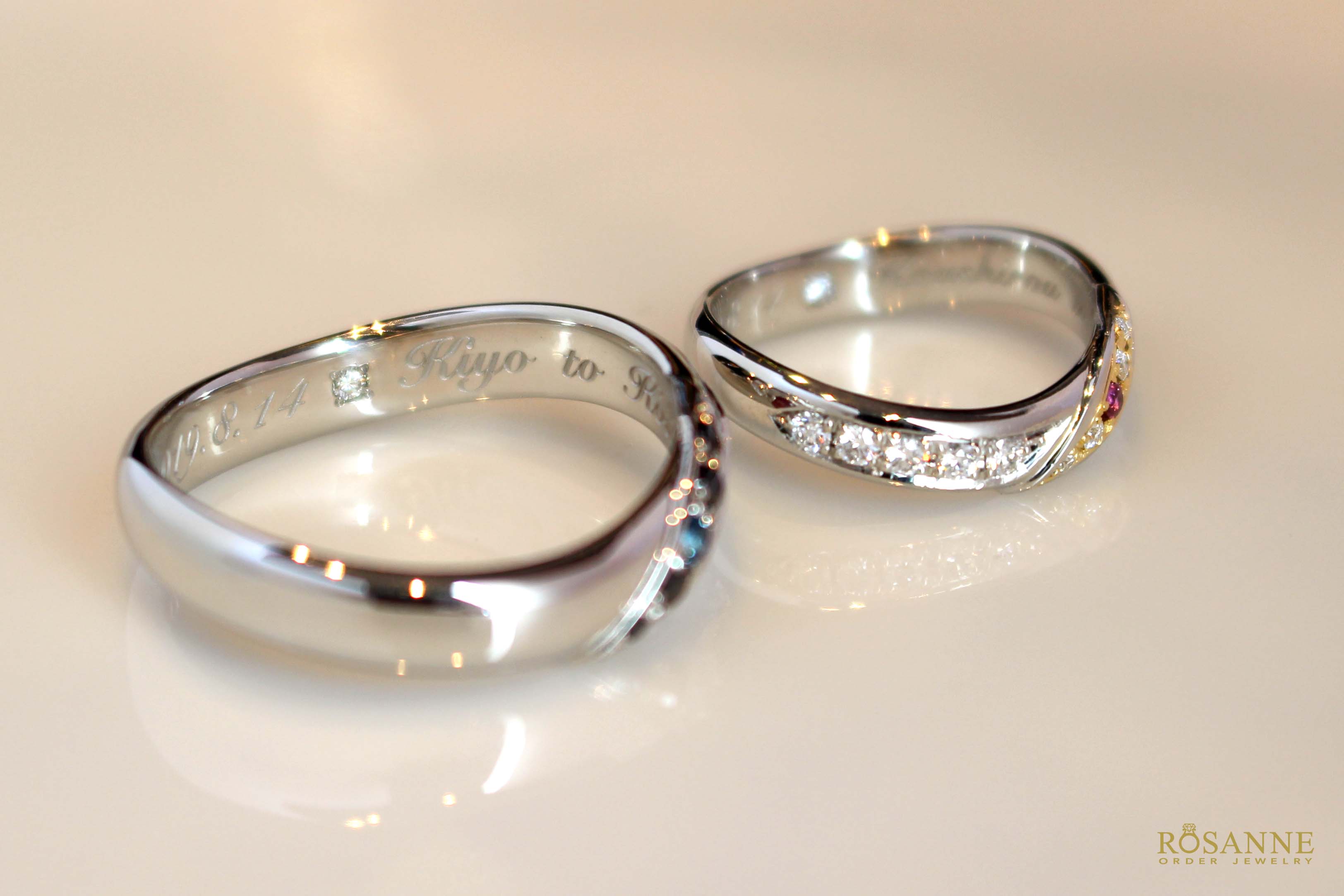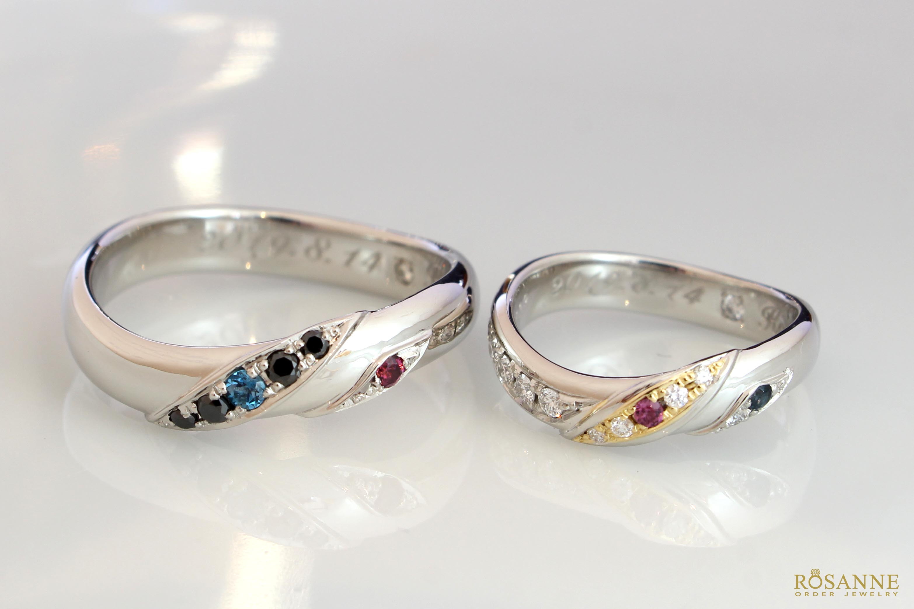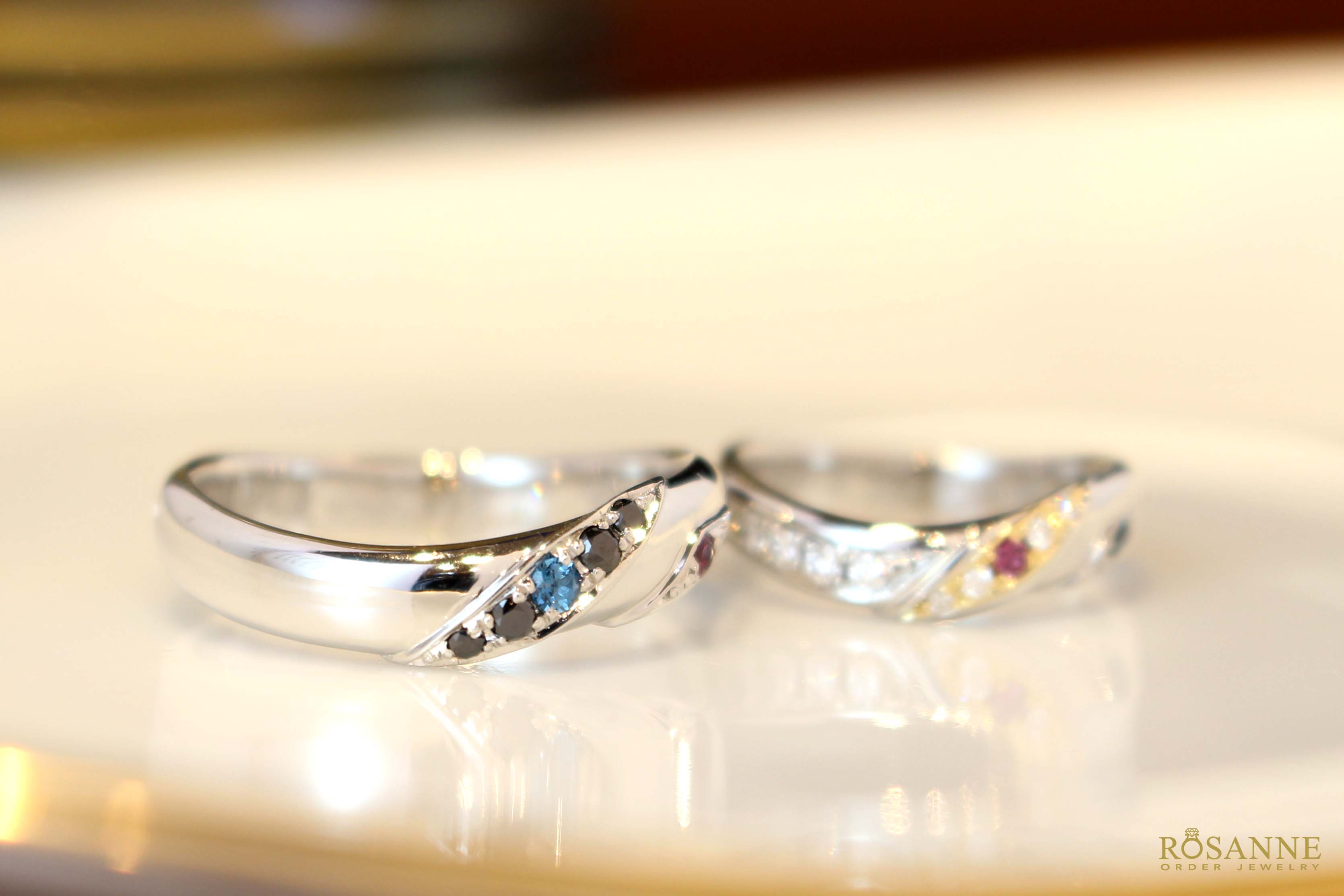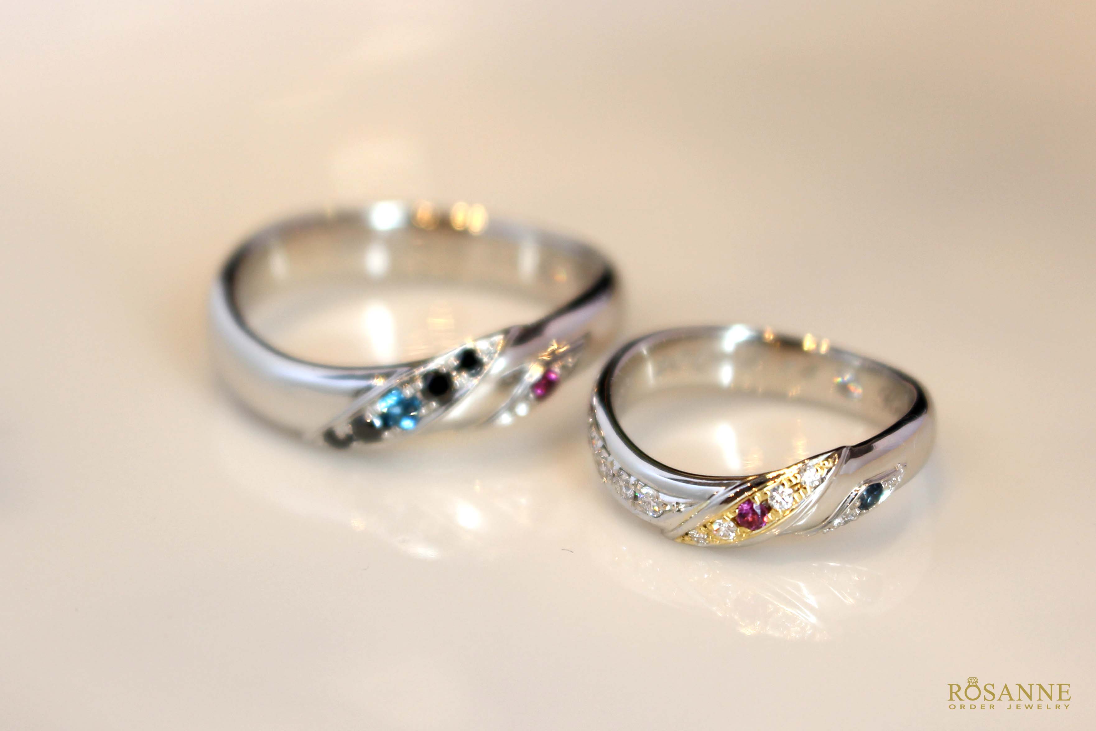 お互いの誕生石ブルートパーズとロードライトガーネットをセットし、メンズはブラックダイヤ、レディースはダイヤモンドをセットして特別なマリッジリングに仕上がりました。