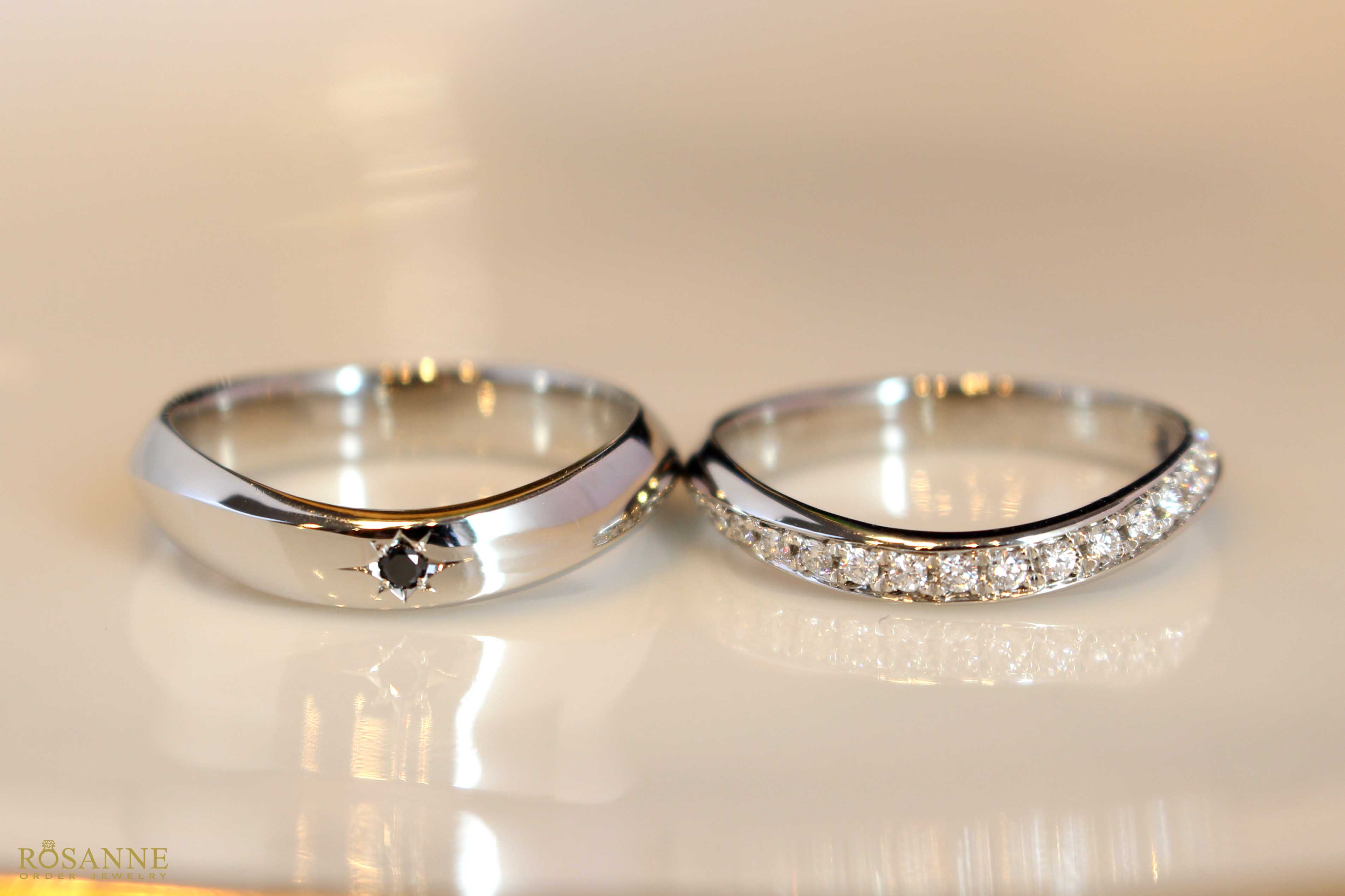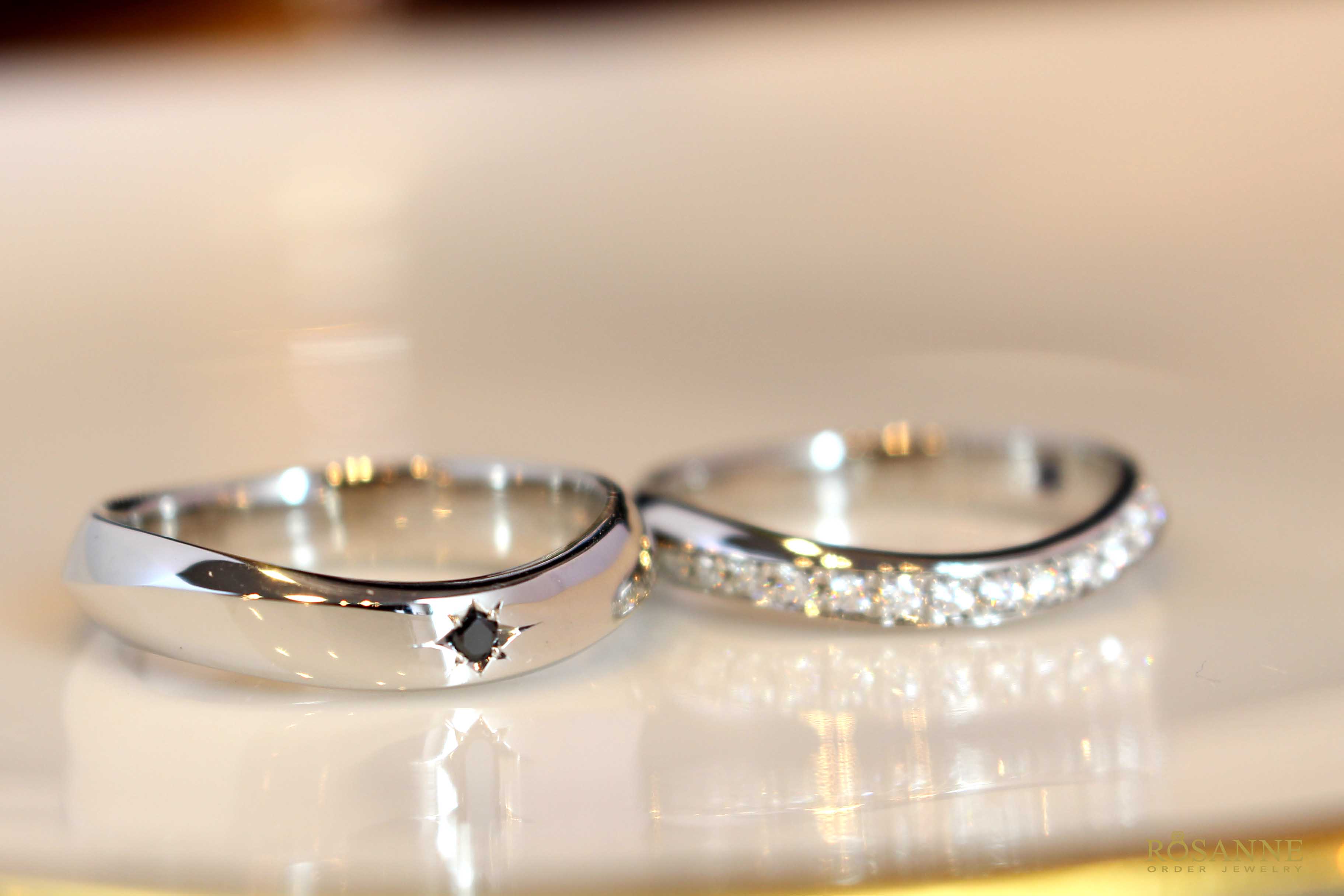 こちらのデザインをお二人ともプラチナでオーダー頂きました。メンズはブラックダイヤモンドとお二人の誕生石を、レディースはVSクラスのダイヤモンドと誕生石をセットしました。気分に合わせリバーシブルでお使い頂けるリングに仕上がっております。