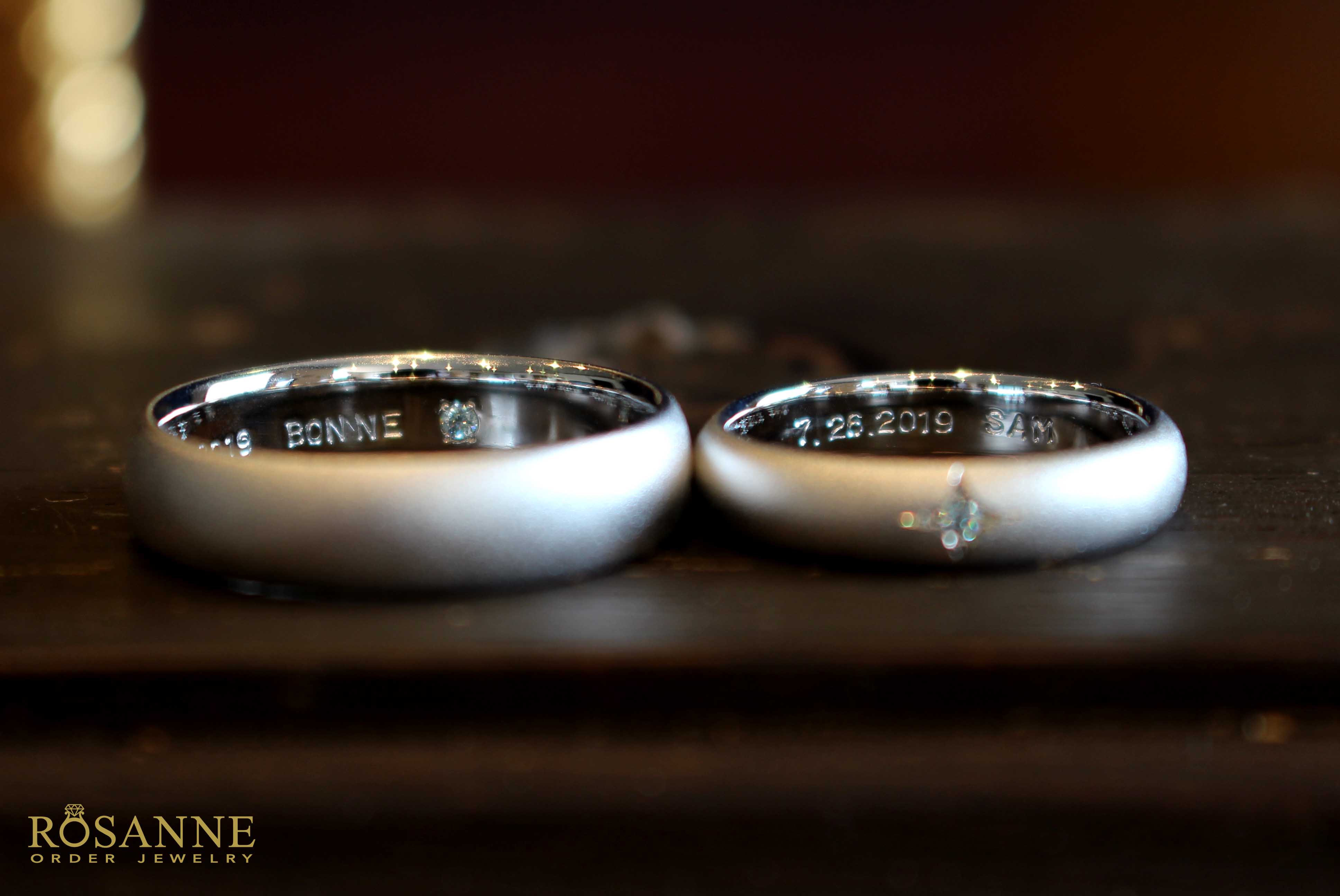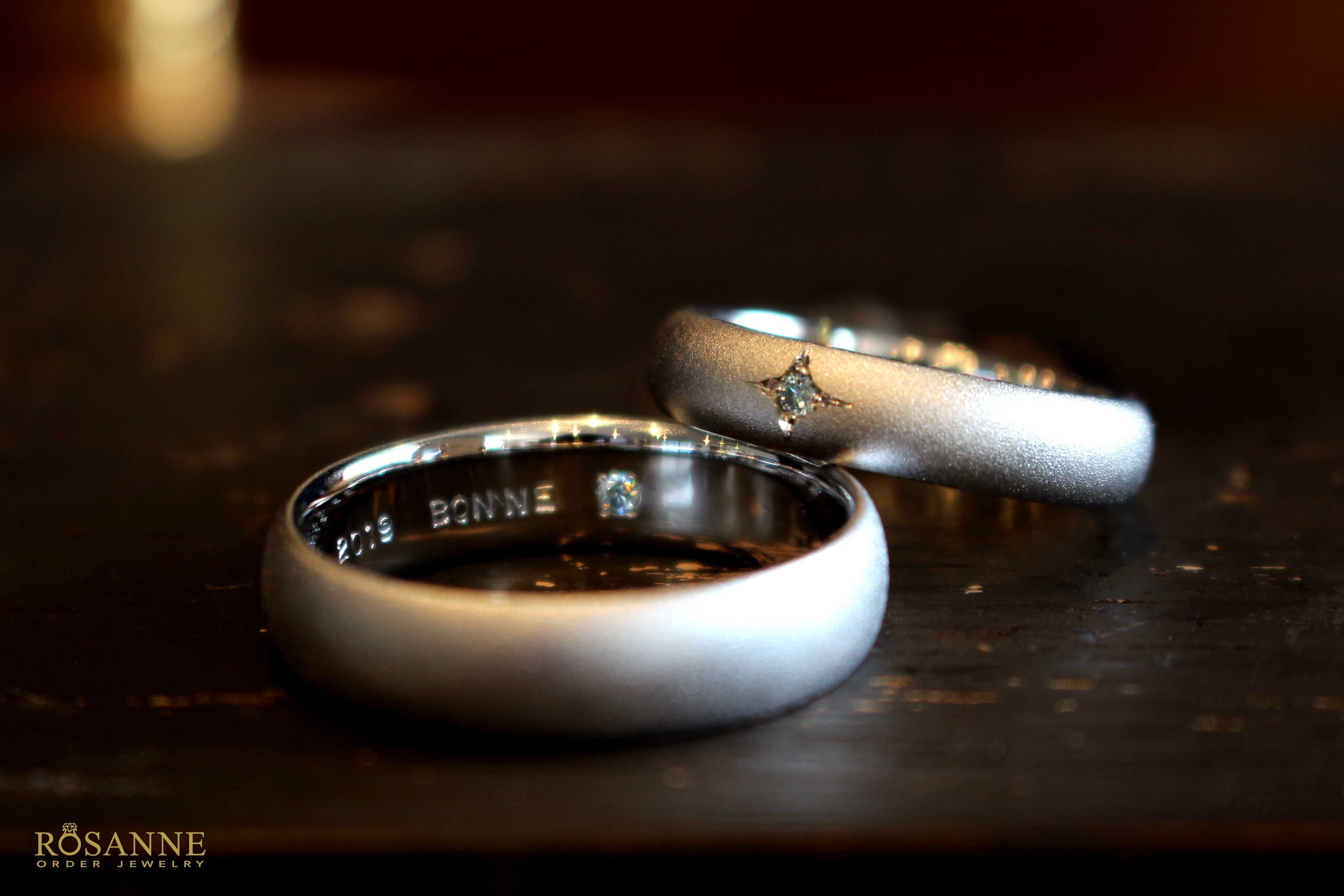 シンプルなリングでも石留めの方法や仕上げ方でお二人だけのリングに仕上がっております。内側と外側にはアイスブルーダイヤモンドをセッティング。変色防止のコーティングをかけさせて頂きました。