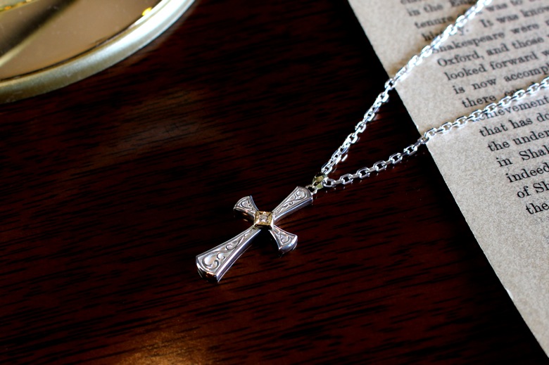 クラシカルな唐草模様が上品な雰囲気のクロスペンダントです。