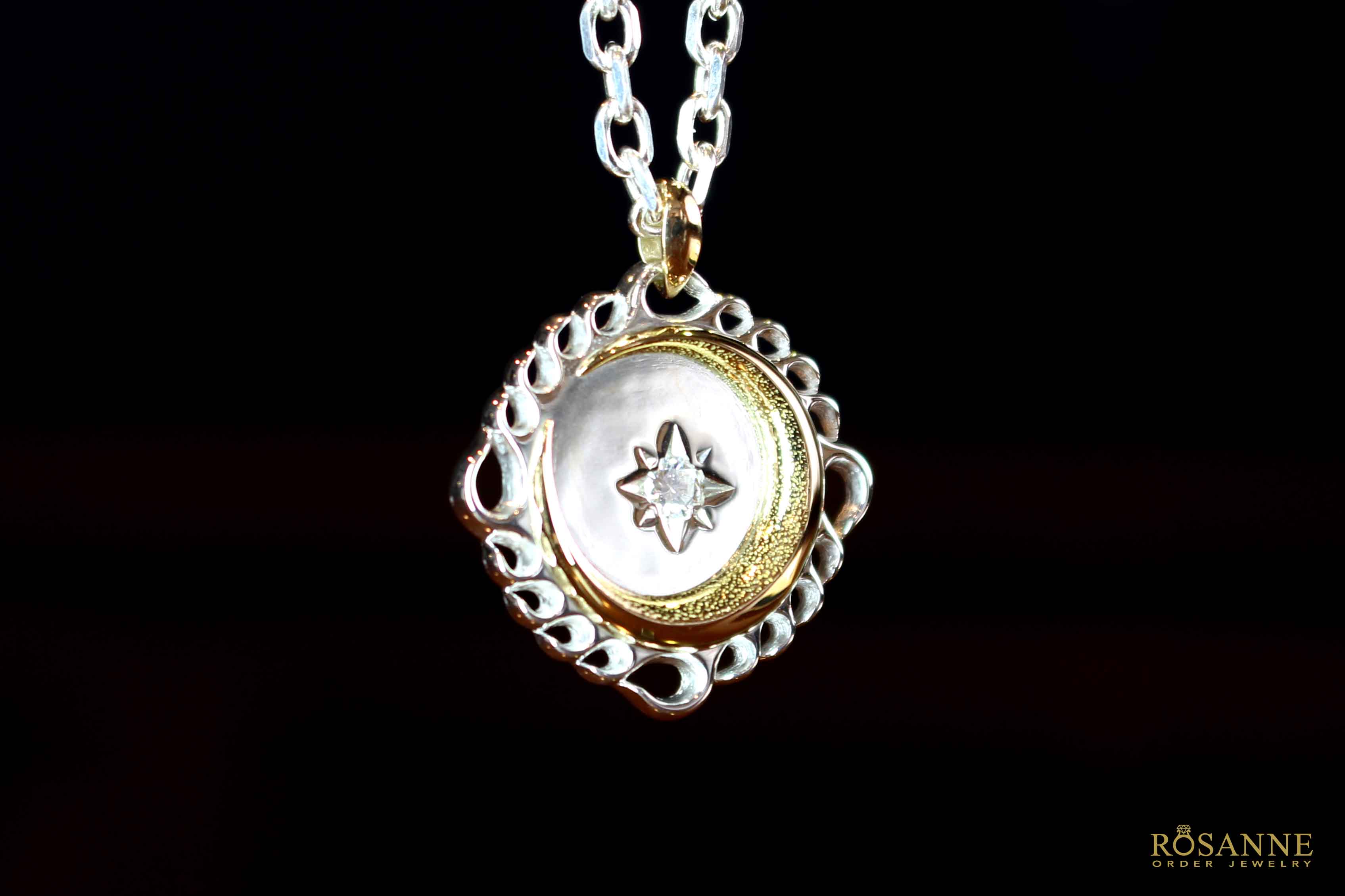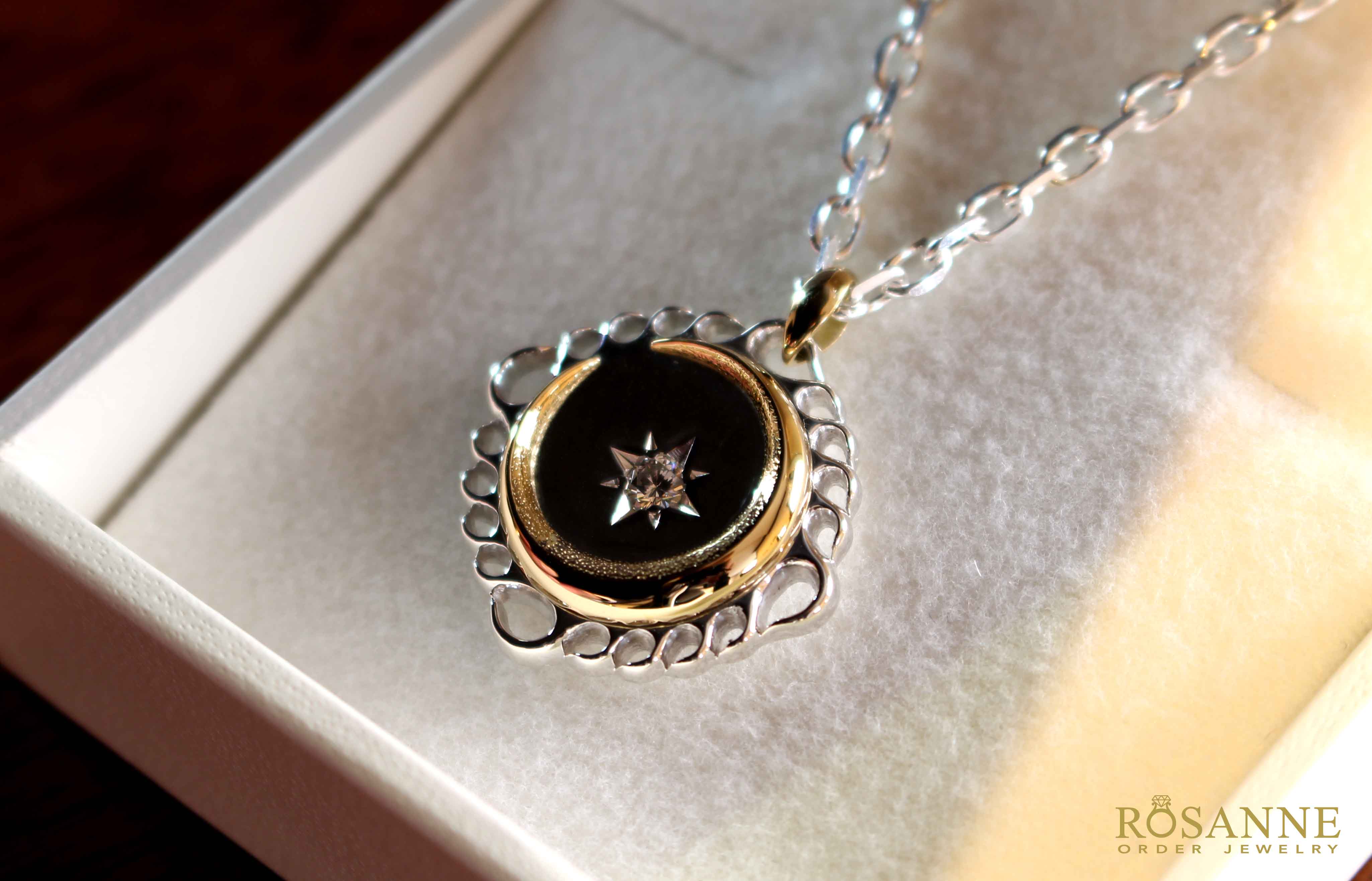 センターのダイヤモンドは星のように飾りをつけてセッティング致しております。こちらのデザインをシルバーと18金を組み合わせ0.1ctのダイヤモンドをセットさせて頂きました。レディースも月と太陽モチーフの品物がございます。