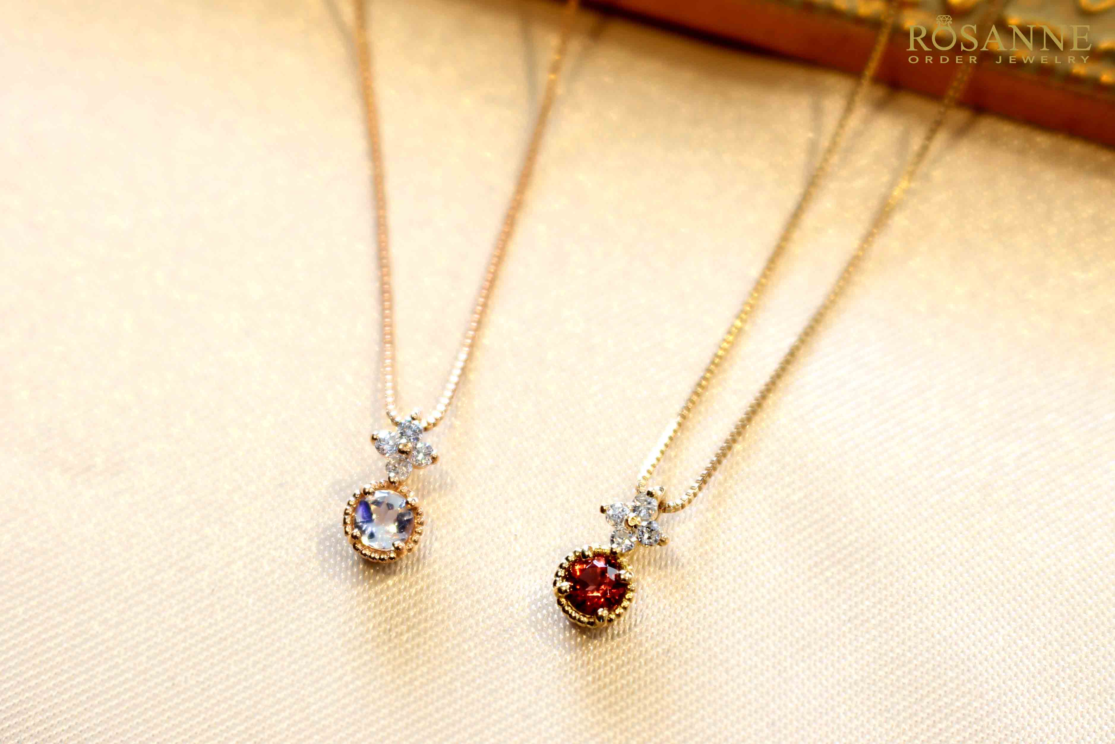 こちらは当店のお勧めの組み合わせ。ムーンストーンとピンクゴールドの組み合わせはとてもめずらしいですが実は相性抜群なんです。もう1点はイエローゴールドとガーネットの組み合わせ。温かみのある色合いが美しいネックレスです。もちろんこちらのネックレスも50種類以上のカラーストーンやダイヤモンドでご注文頂けます。