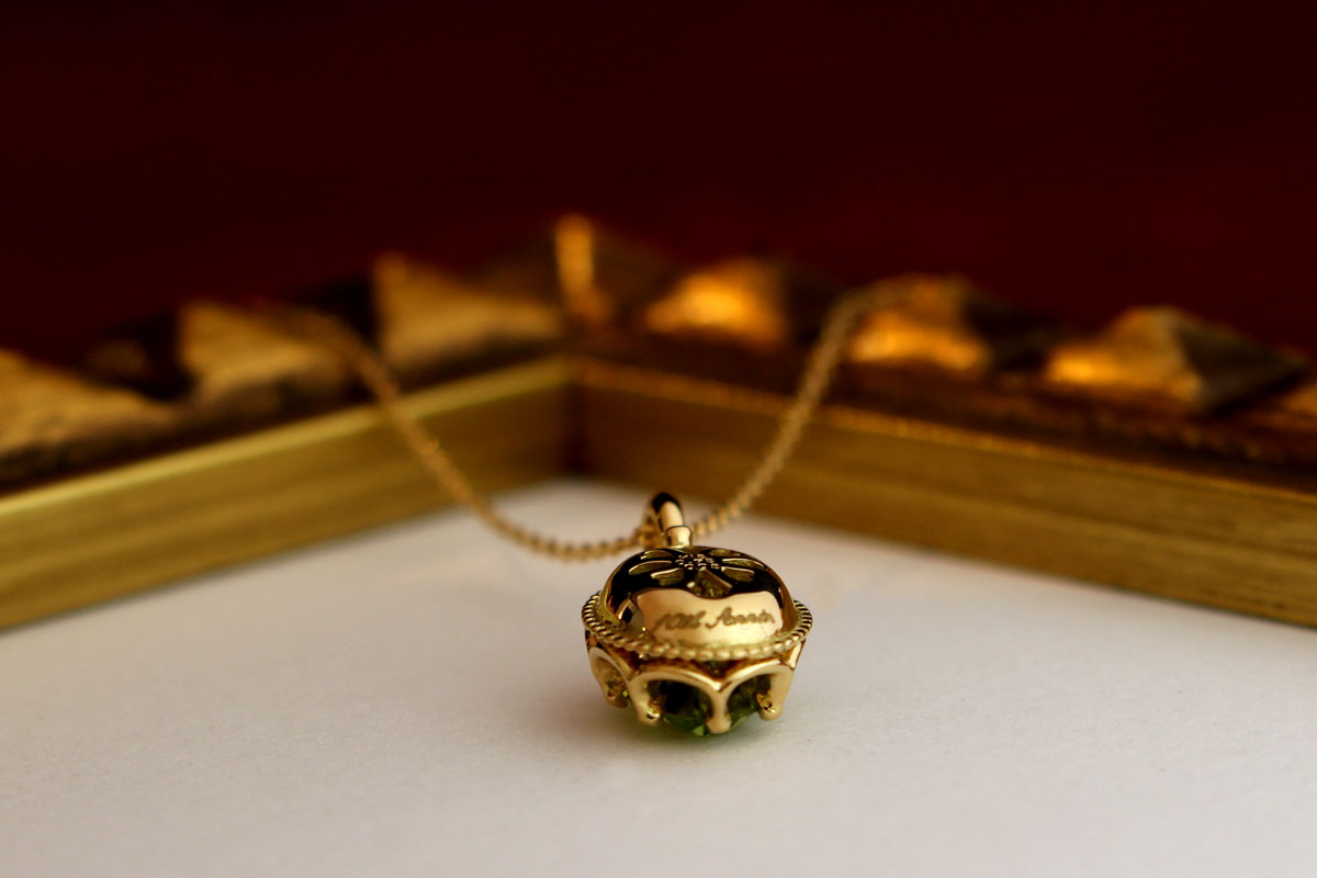 奥様の誕生石のペリドットを立体的な枠に浮かせてセッティング。ペリドットのグリーンとイエローゴールドの相性が抜群ですね。裏には10th Anniv.とレーザー刻印させて頂きました。