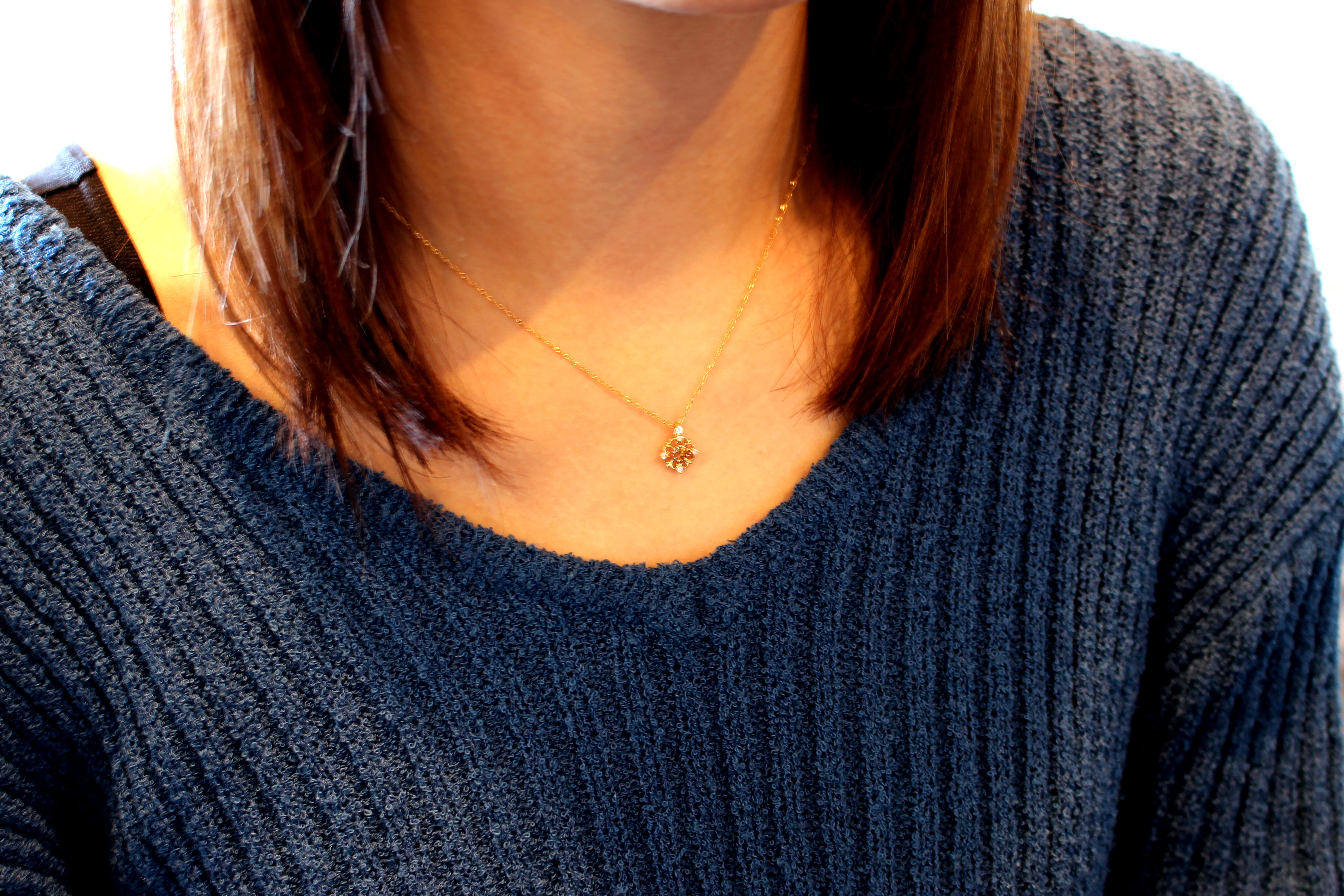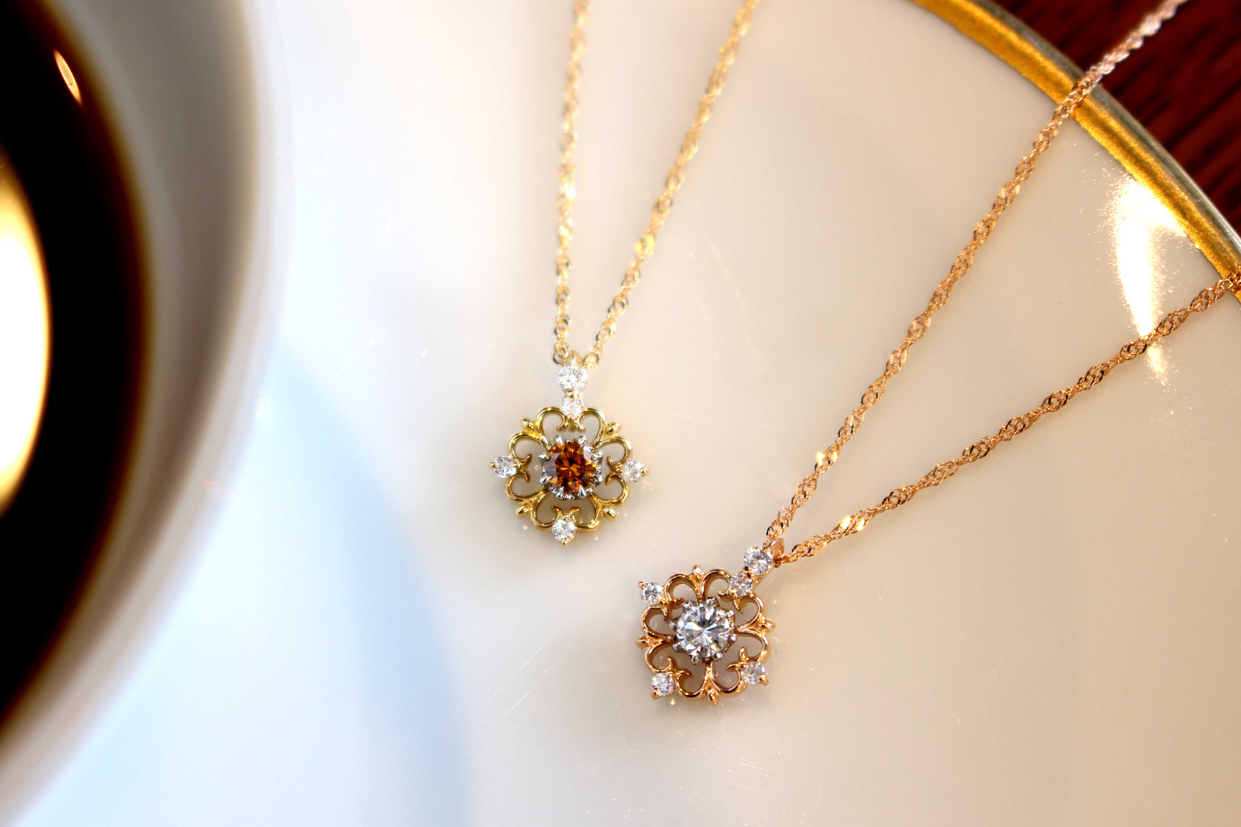 1点はコニャックダイヤを主役にイエローゴールドとプラチナで取り巻いたクラシカルな雰囲気のネックレスに仕上がりました。