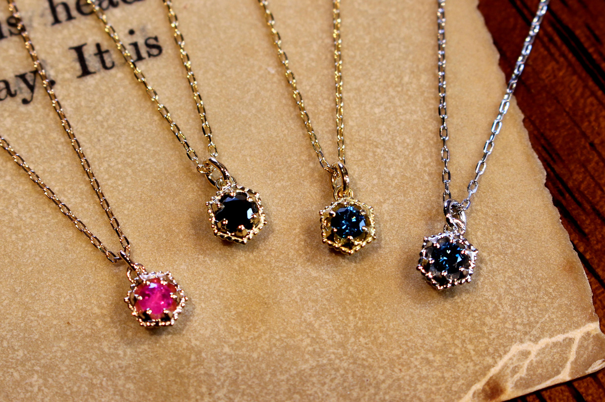 当店こだわりの立体感のある六角形の石座のネックレス。