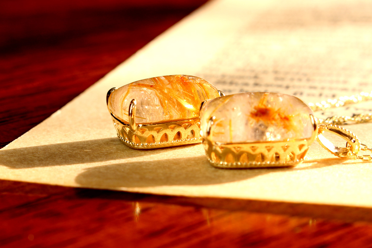 サイドの透し彫りから入り込む光によってルチルがとても綺麗に輝きます。
