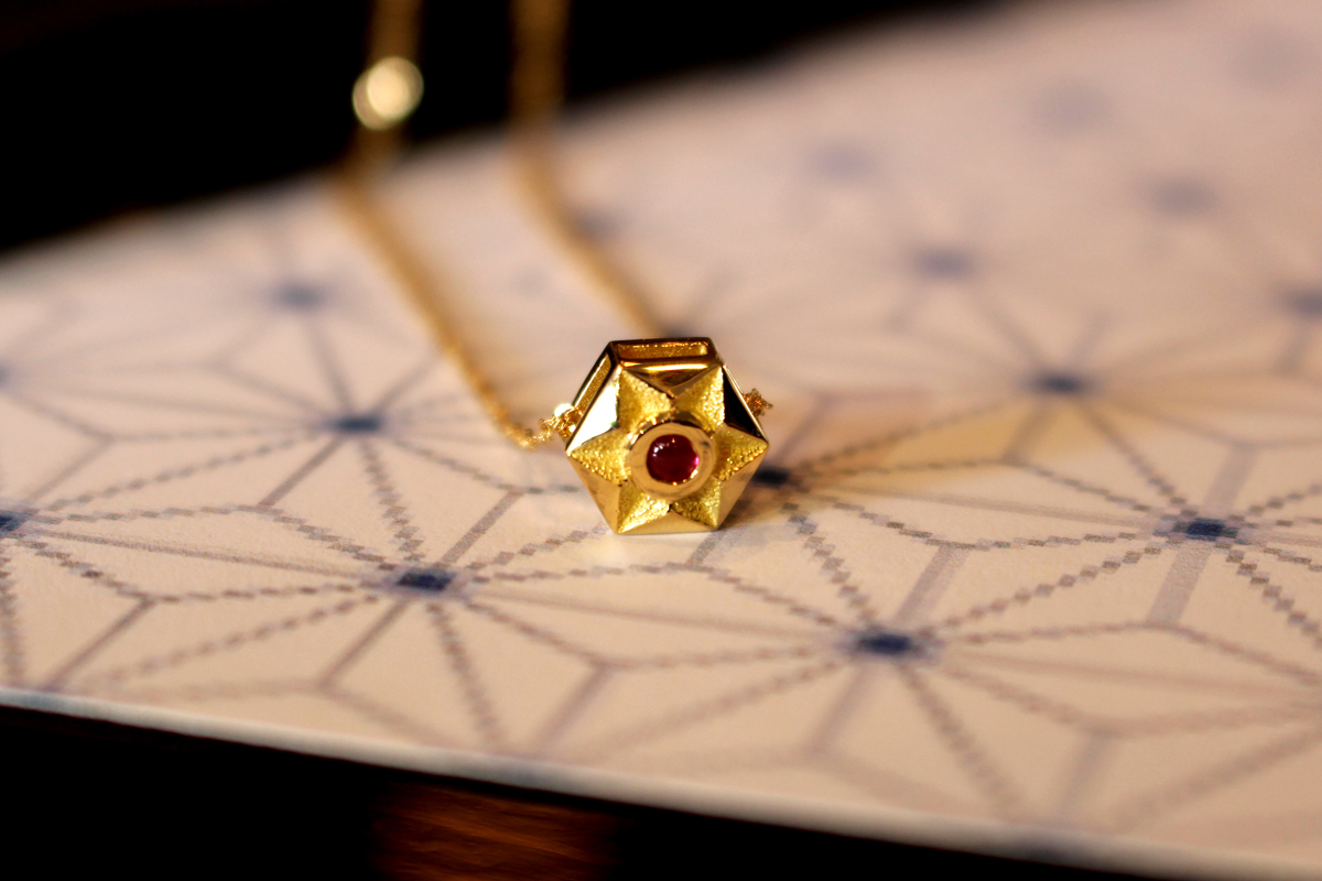 お2人の誕生石をセッティングし、リバーシブルに。チェーンの通し方によってもさらに表情を変えるネックレスです。モチーフにした「麻の葉」模様ですが、麻の葉は成長が早く、真っ直ぐにぐんぐん成長していくため、すくすくと育つように子供の産着に使われる事が多かったようです。