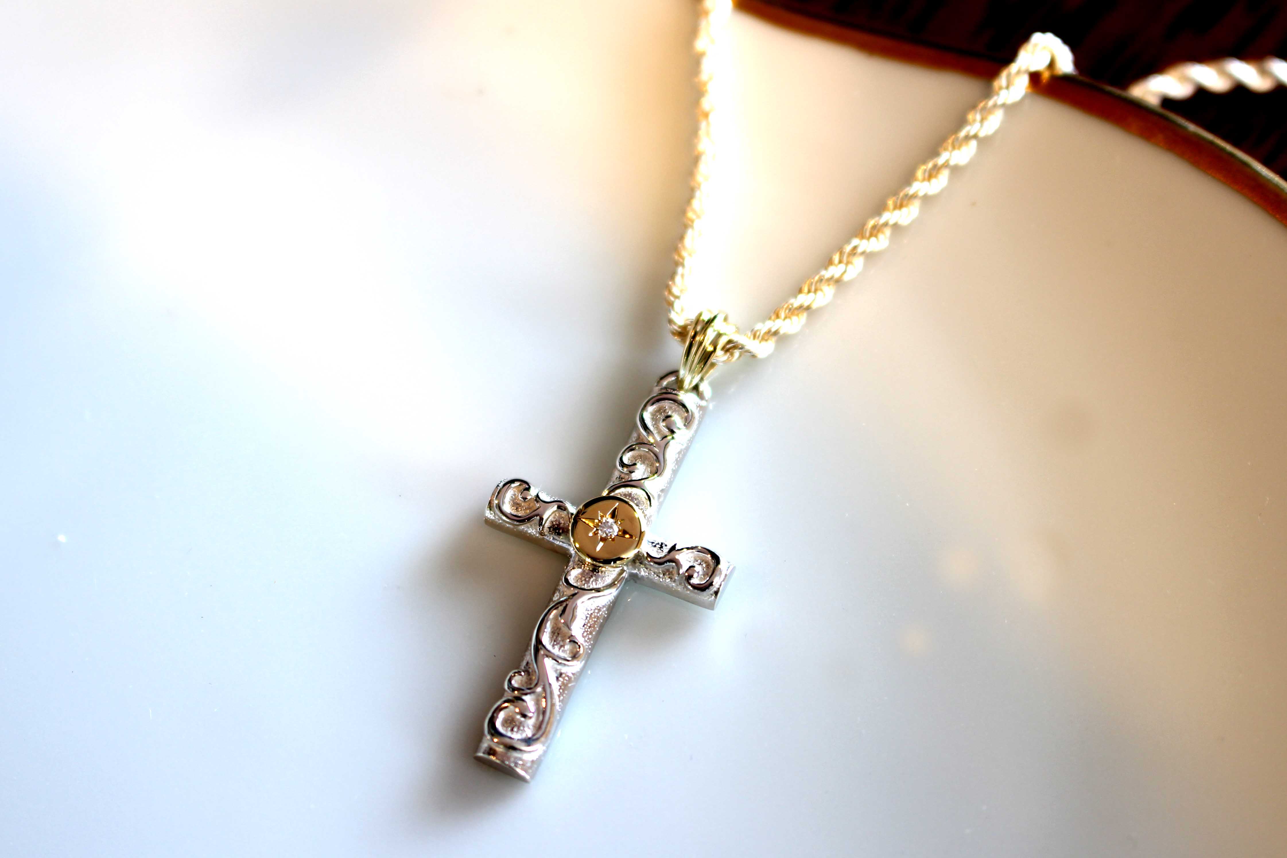 手彫りで施された波模様が美しい当店のオリジナルクロスネックレス。