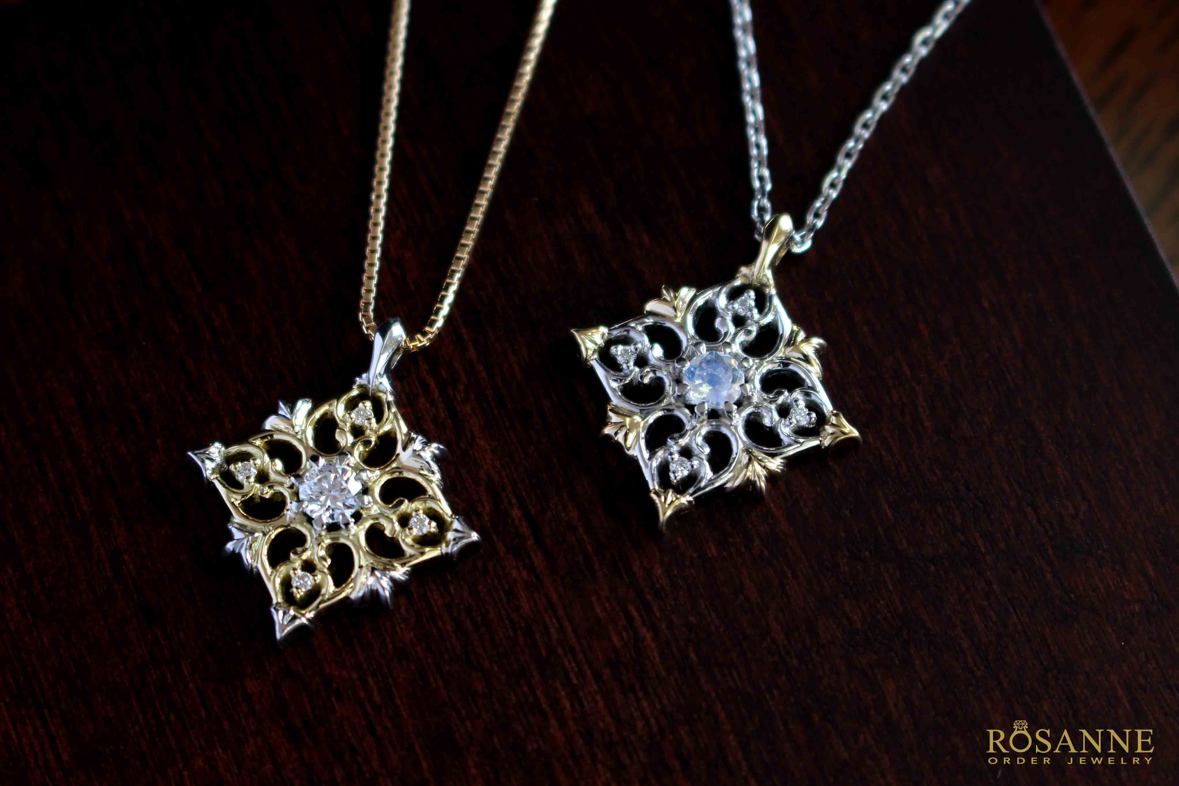 曲線で構成された透かし模様がクラシカルで美しいペンダント。ボリュームがあるのですが透かし柄で表現されているため繊細さも感じるデザインです。いくつものパーツで構成されたペンダントですので素材を変えて制作させて頂きます。メンズ、レディースともにお使い頂けるユニセックスなデザインのペンダントです。