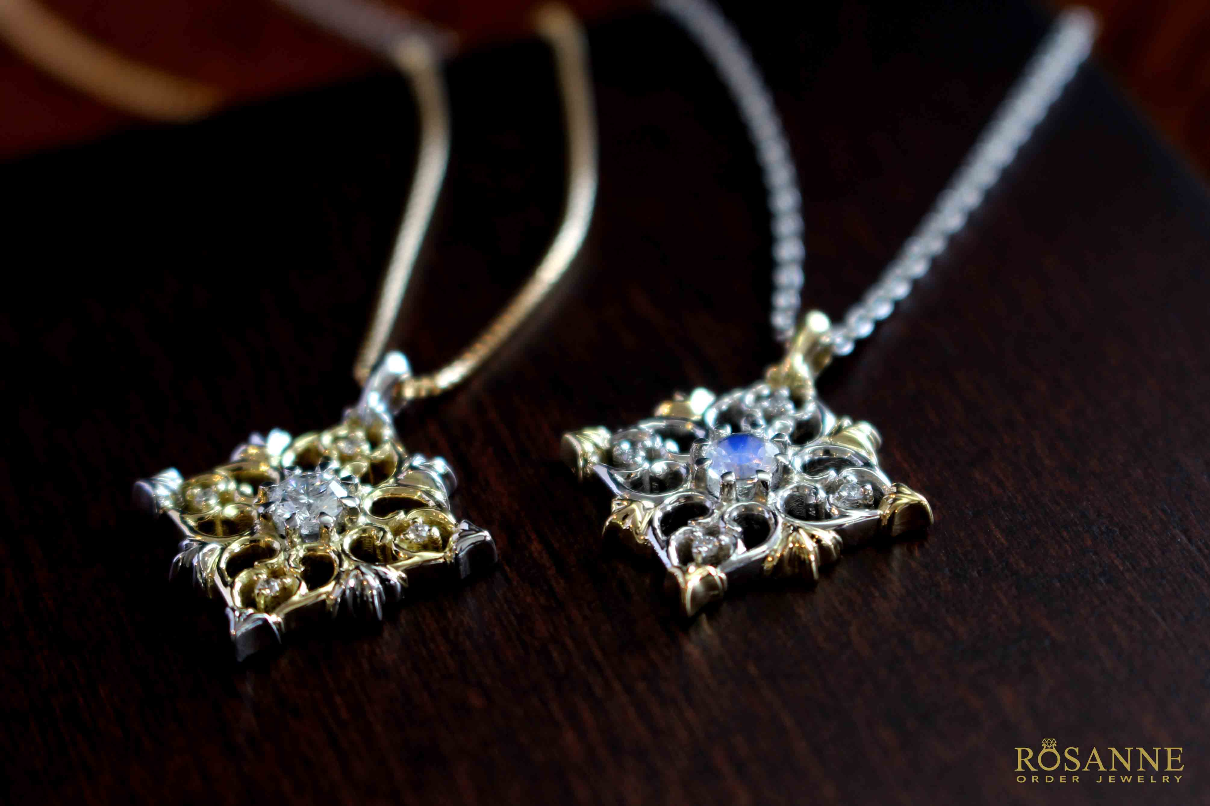 こちらの商品はペアでご注文頂きました。メンズはプラチナをベースにイエローゴールドを部分使いし、センターはブルーの効果が美しいロイヤルブルームーンストーンで制作させて頂きました。レディースはイエローゴールドをベースにプラチナをコンビ使いしセンターにはVSクラスのダイヤモンドをセットさせて頂きました。
