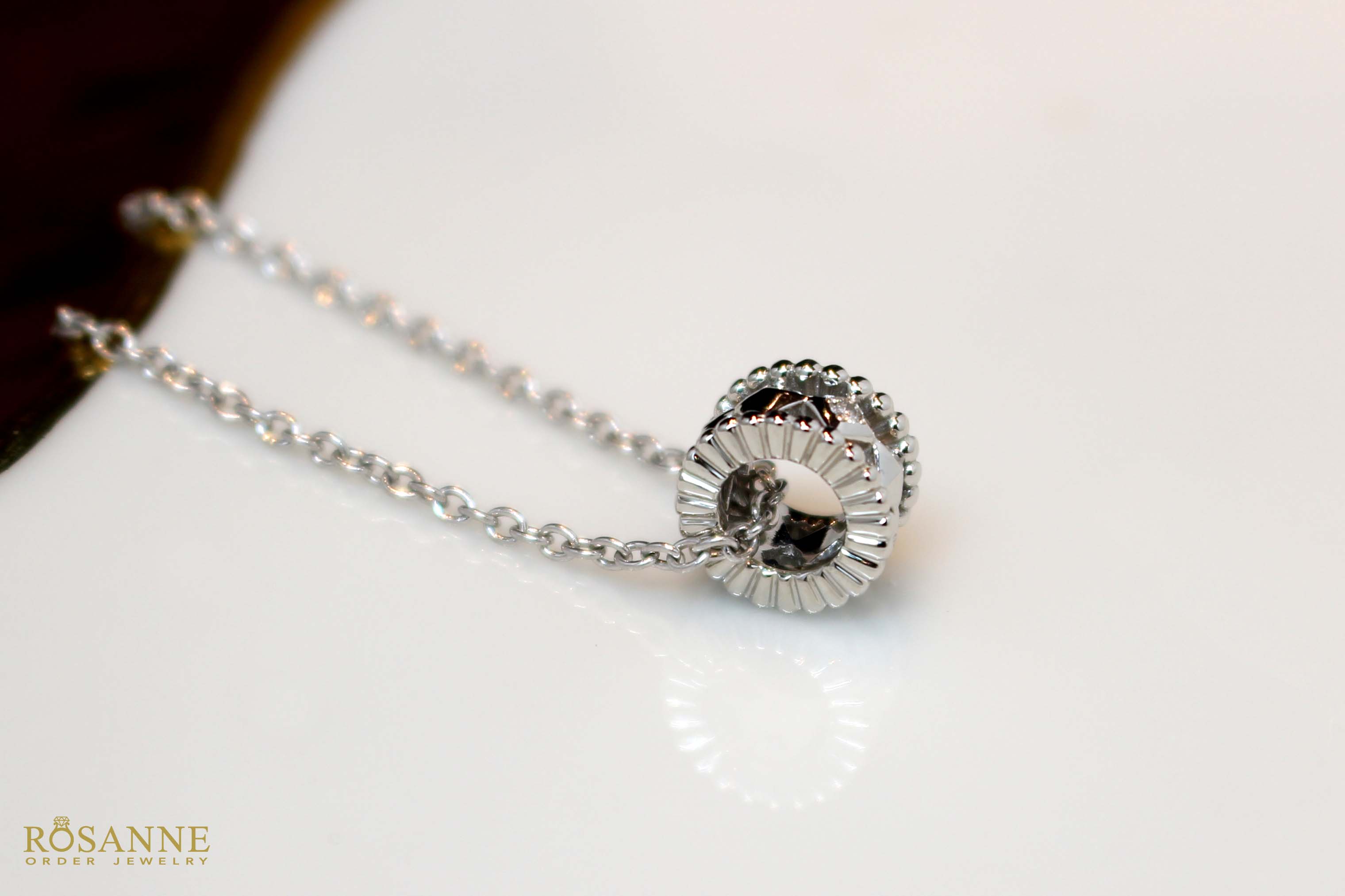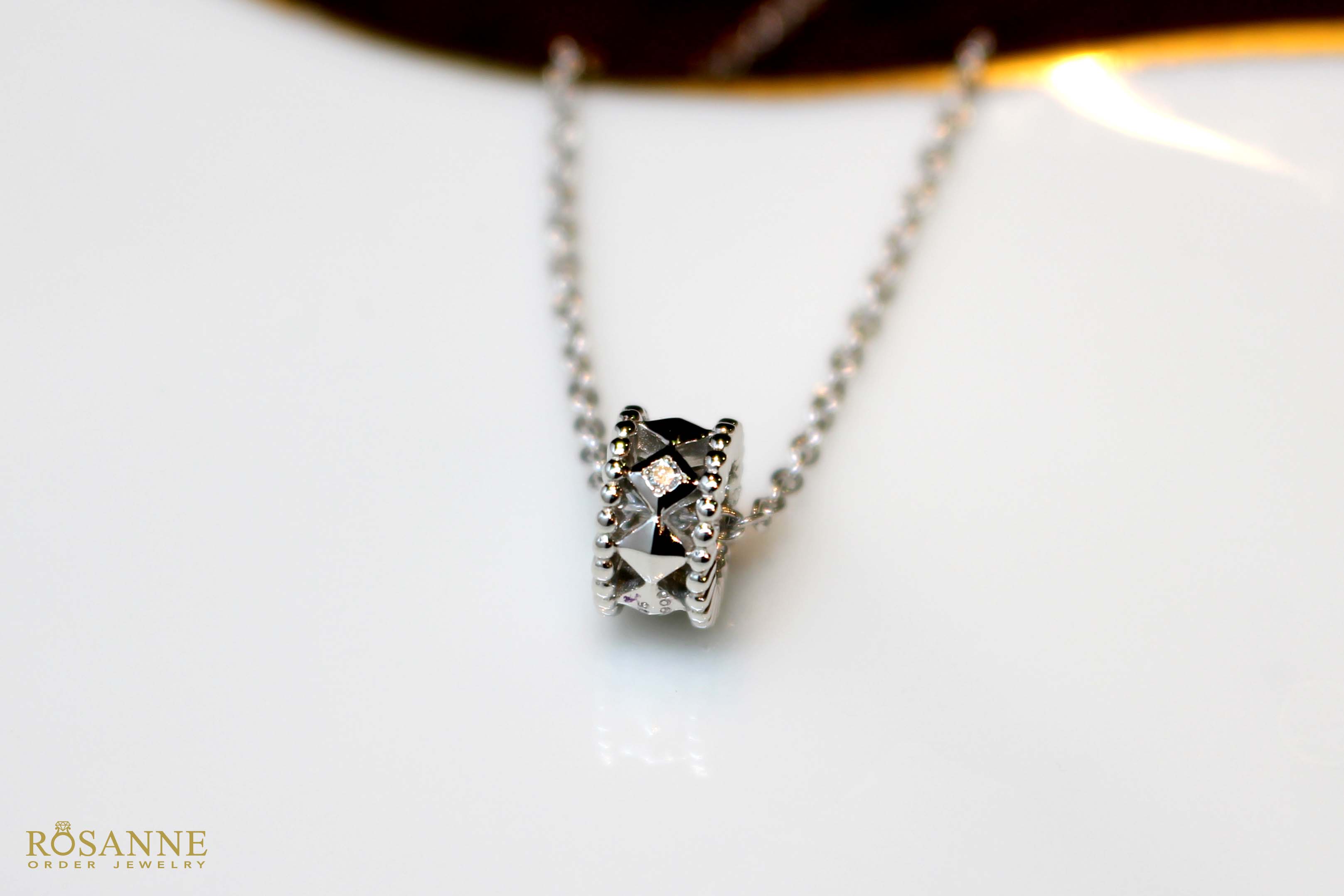 カジュアルなお洋服にも合わせやすいよう、華奢になりすぎないボリューム感で製作致しました。透かしで表現した柄の中にさりげなくダイヤモンドが光ります。