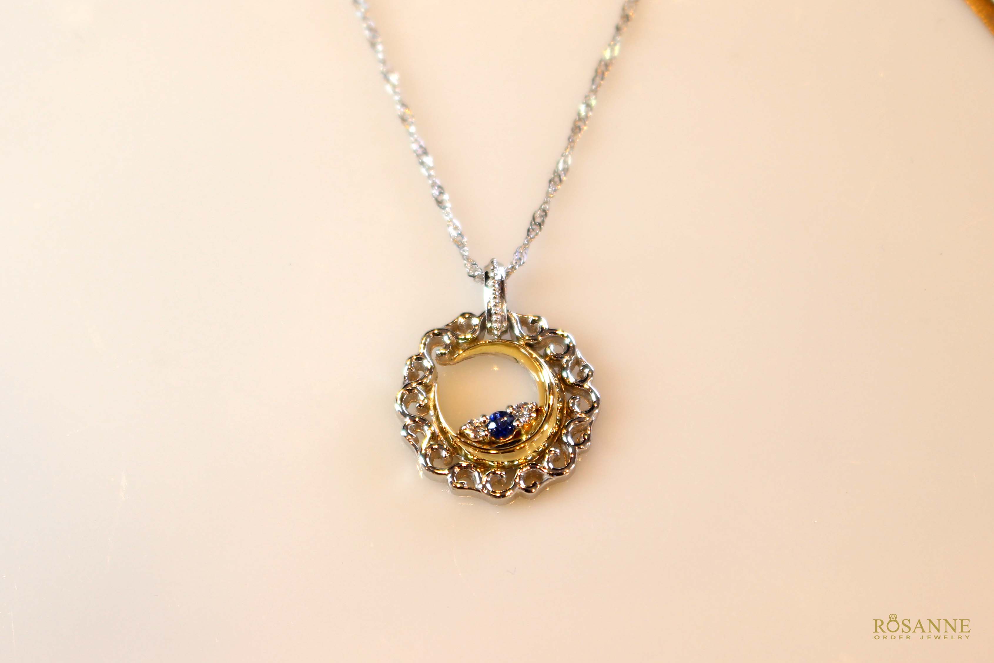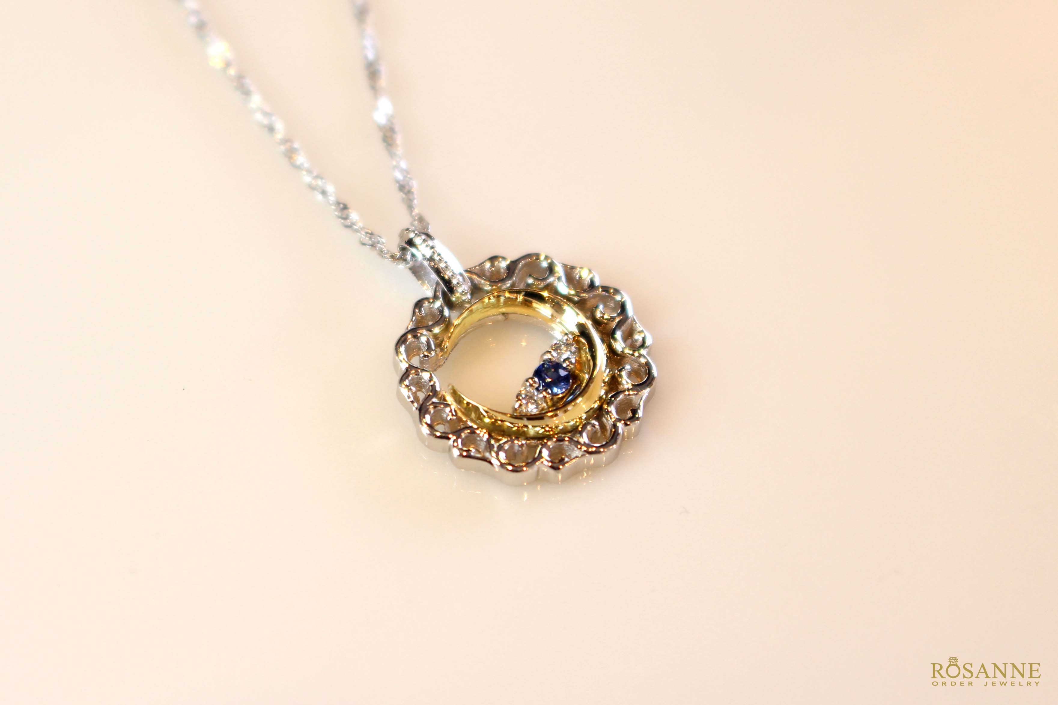 女性らしい唐草模様をファイアーパターンに見立ててデザイン致しました。こちらのデザインをプラチナとイエローゴールドの組み合わでお作り致しました。誕生石のサファイアとダイヤモンドが星のようにキラキラと瞬く美しいネックレスです。