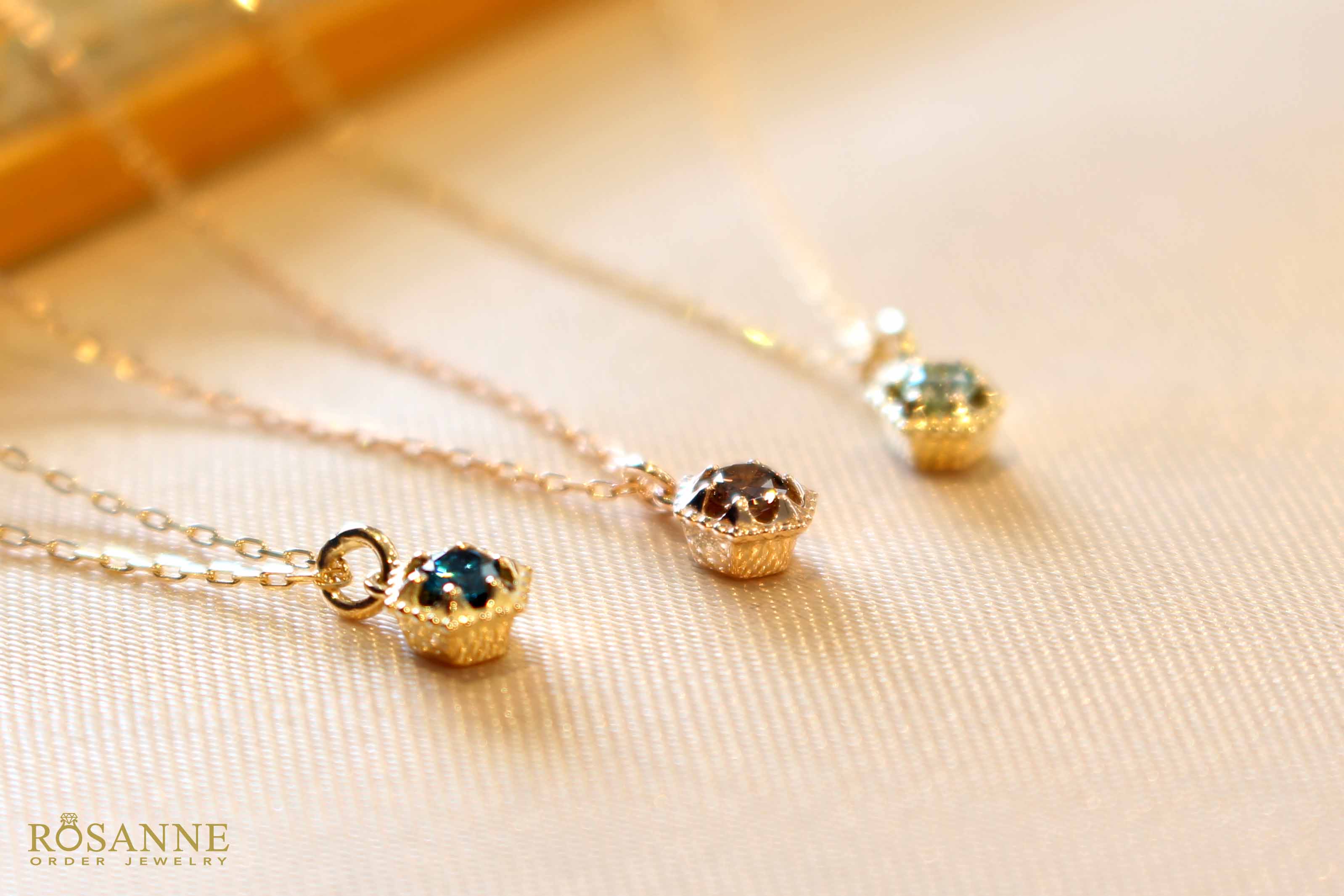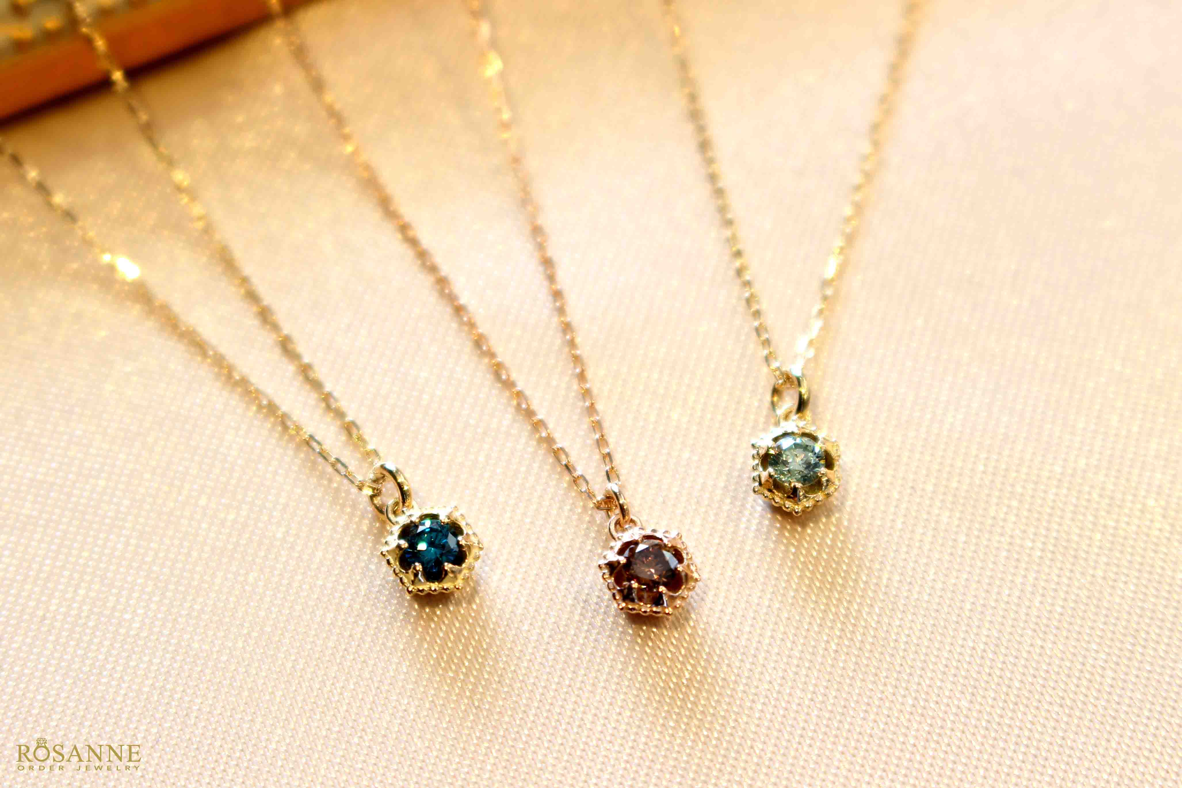当店こだわりの立体感のある六角形の石座にカラーダイヤをセッティングした人気の商品です。サイドにはミル打ちが入り繊細でクラシックな印象のネックレスです。