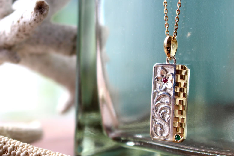 裏側にも沖縄の波をイメージした彫りを入れさせて頂きました。お選び頂いたエメラルドとルビーの色合いもバッチリ。いつまでもお客様のお気に入りになればいいなと思いながらデザイン制作いたしました。