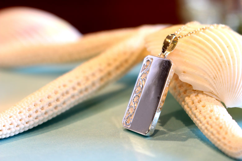 沖縄出身のお客様のご注文です。K18部分にはミンサー織りの柄を彫り入れしました。「いつ(五つ)の世(四つ)までも末永く」という想いが込められている織り柄だそうです。