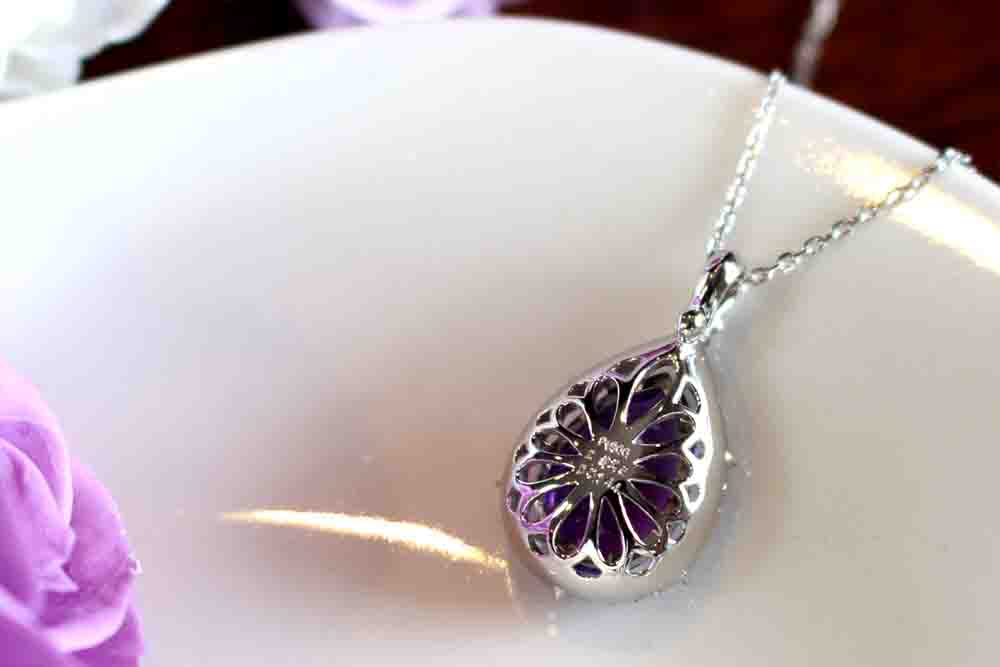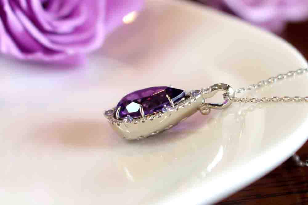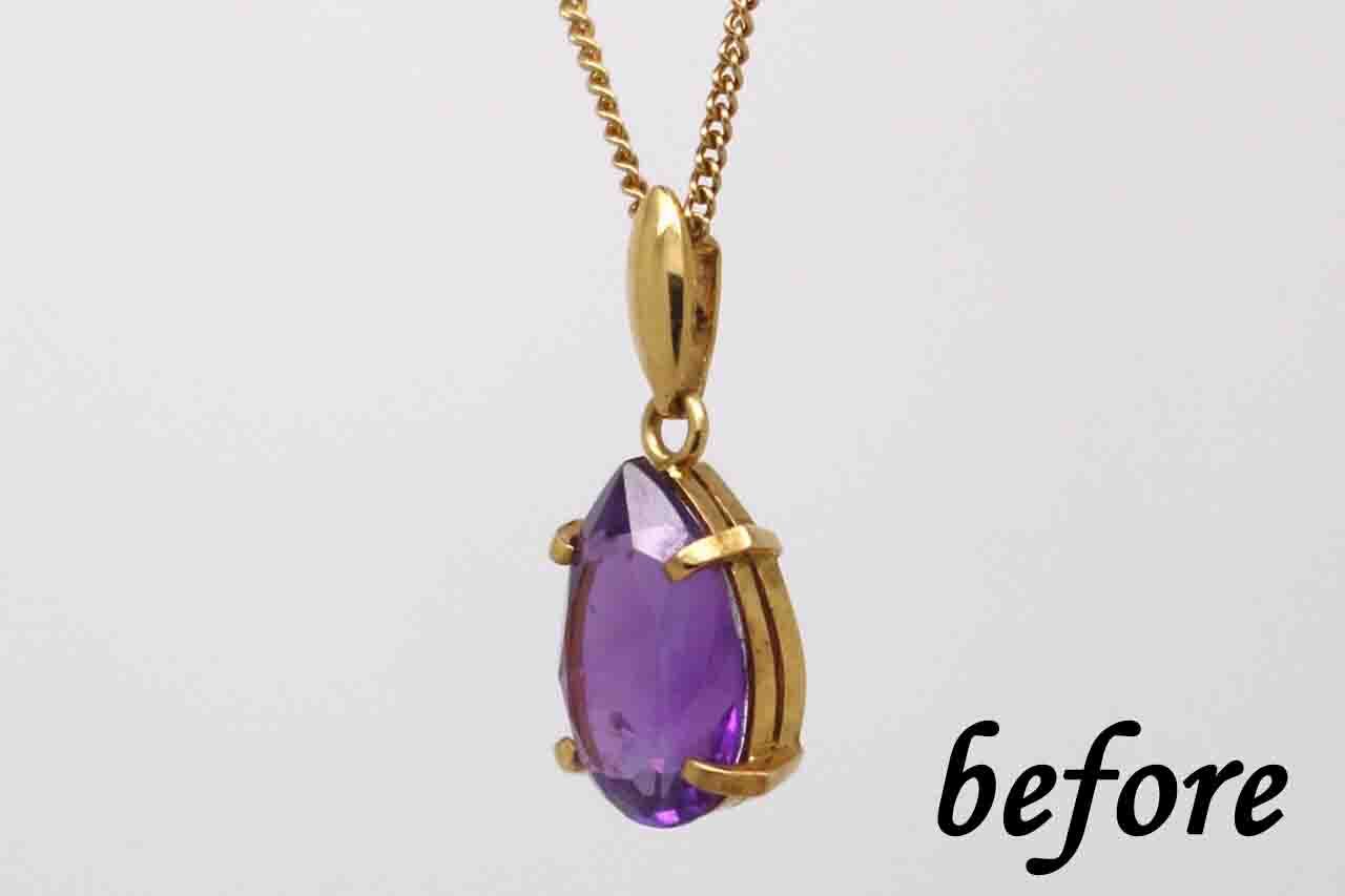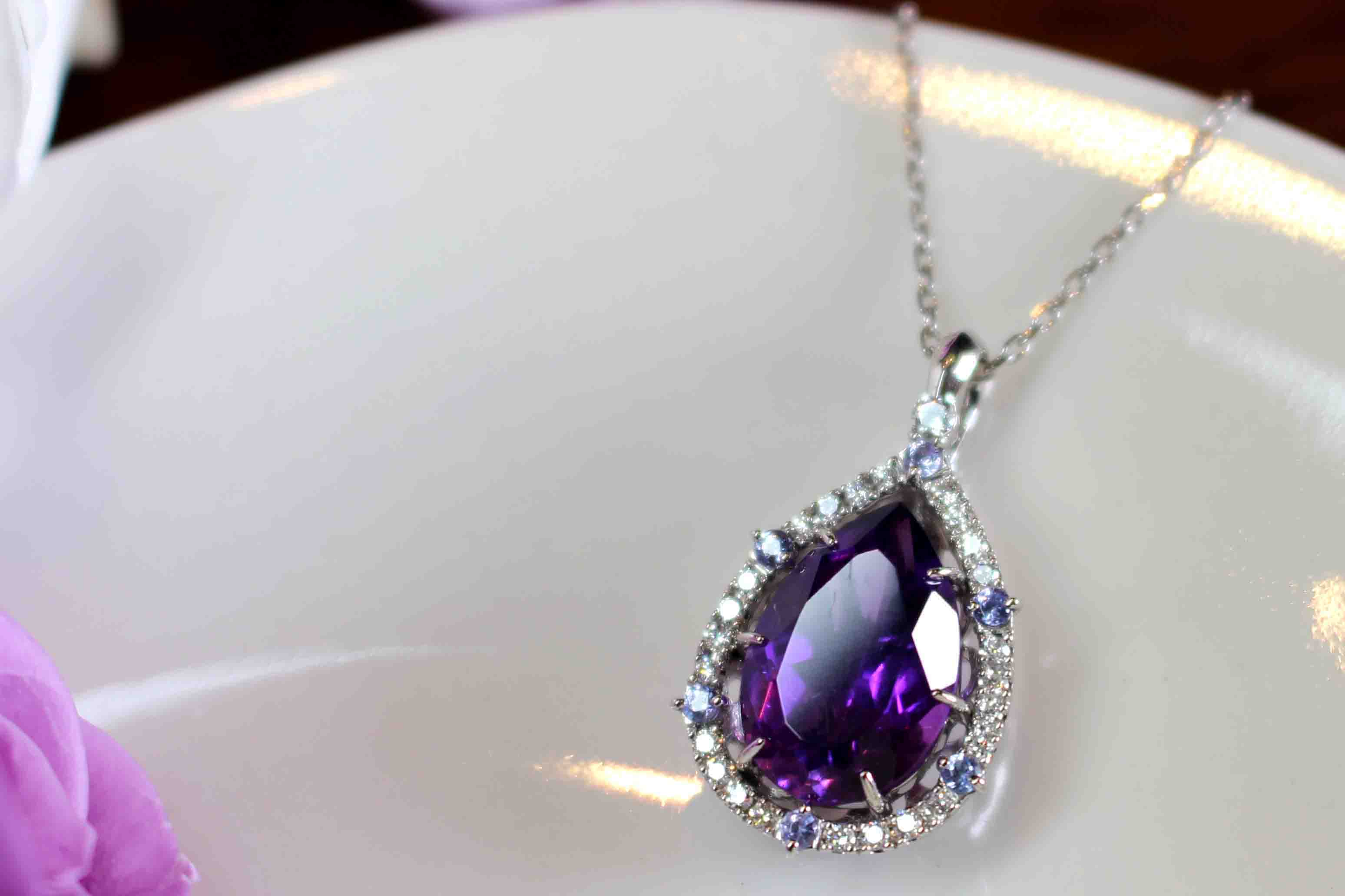 お手持ちのアメシストのゴールドペンダントをリフォームさせて頂きました。提案させて頂いたデザインの中からダイヤモンドで取り巻いたシンプルで豪華な品物をお選び頂きました。