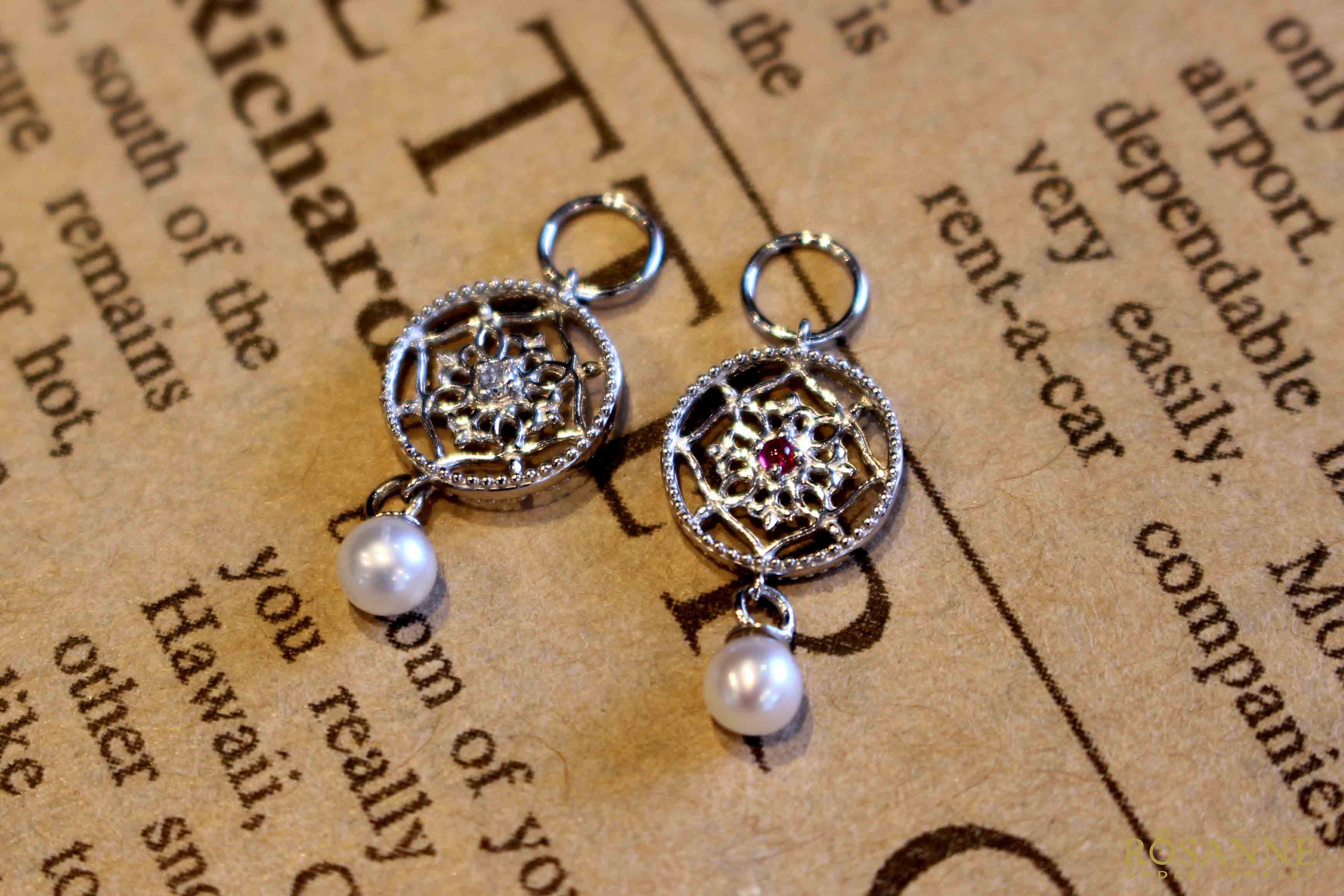 ダイヤモンドとカボションカットのルビーのリバーシブルになっていますので気分やお洋服に合わせて。揺れる淡水パールが耳元を華やかに演出します。