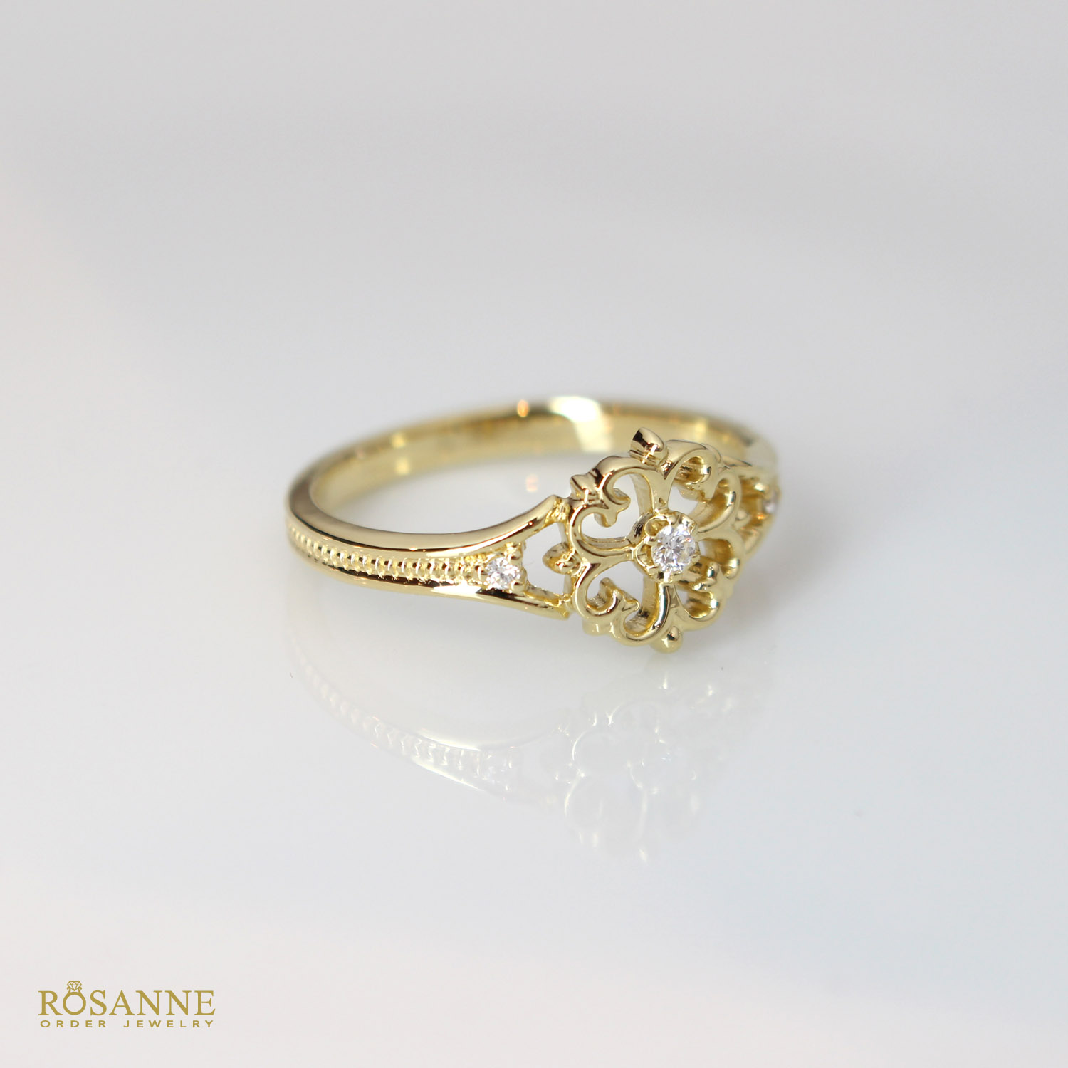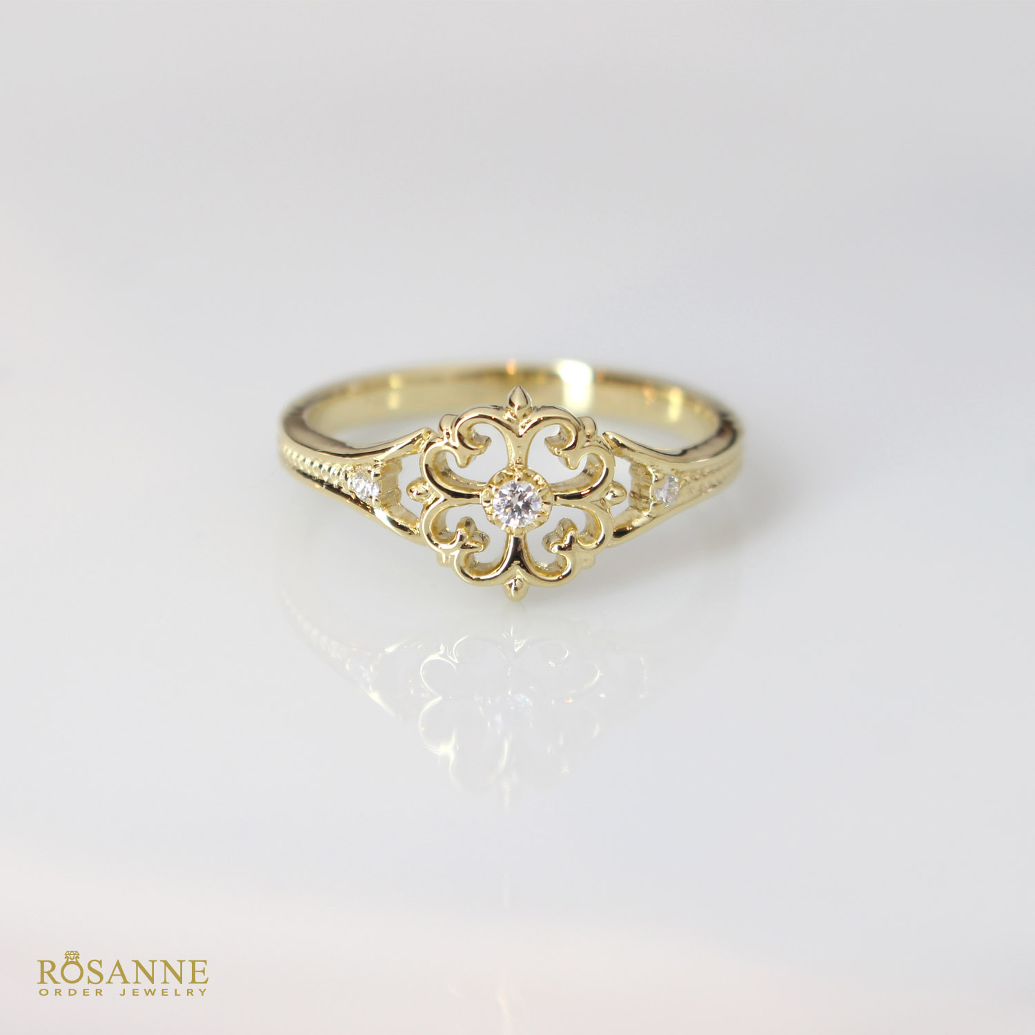 本モデル Luminé(ルミネ) は、ひし形のアウトラインに透かし細工を施し、センターに小粒の宝石をあしらったリング。