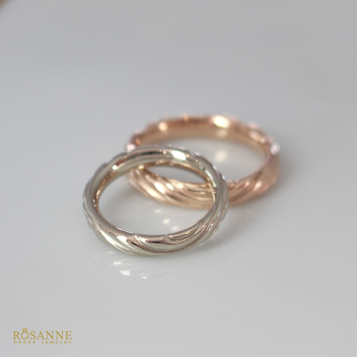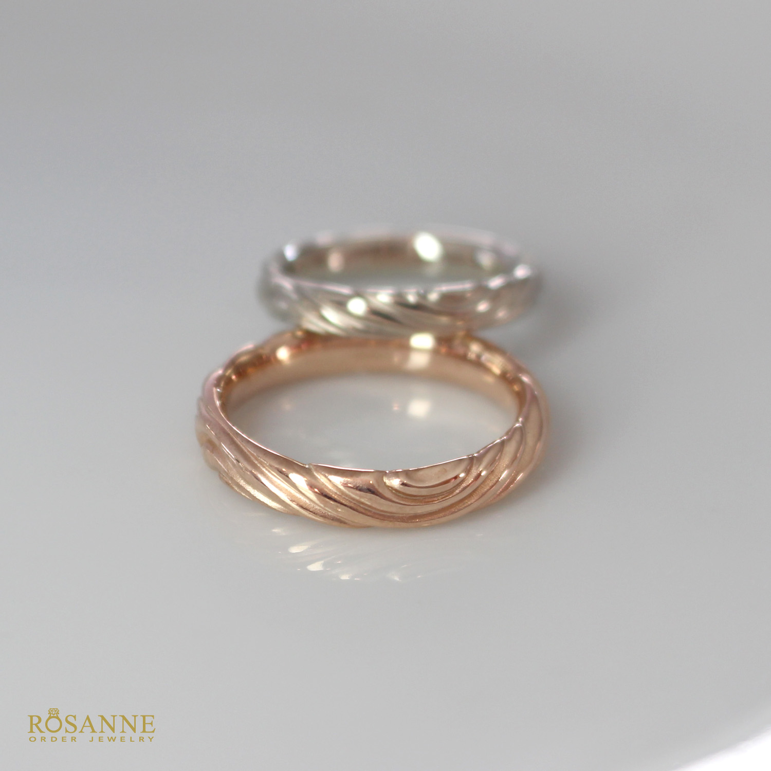 Carving(カービング)シリーズ Scroll(スクロール)はメンズ4mm・レディース3mmとしっかり幅を確保し、厚みも十分に持たせた重厚なフォルム。地金を惜しみなく使用した、贅沢なつくりのモデル。