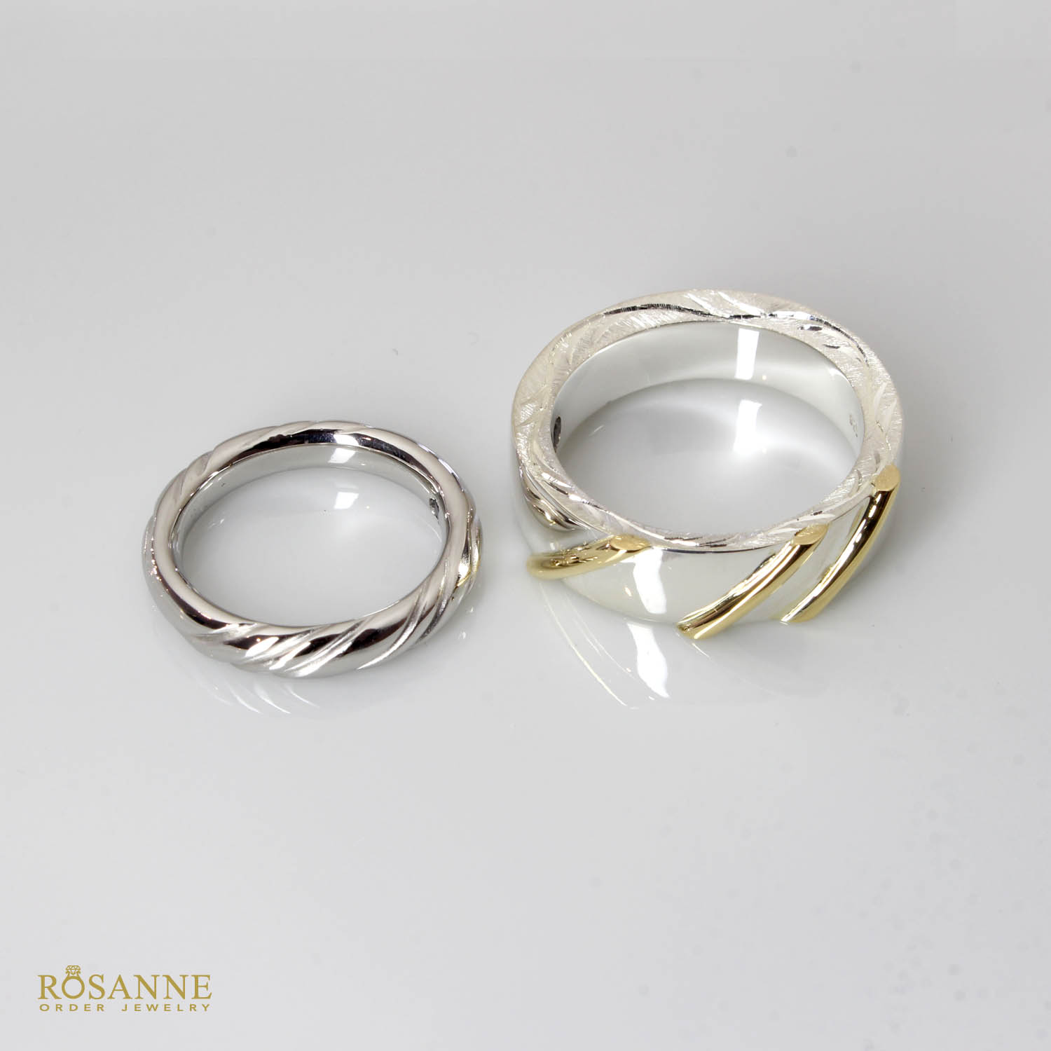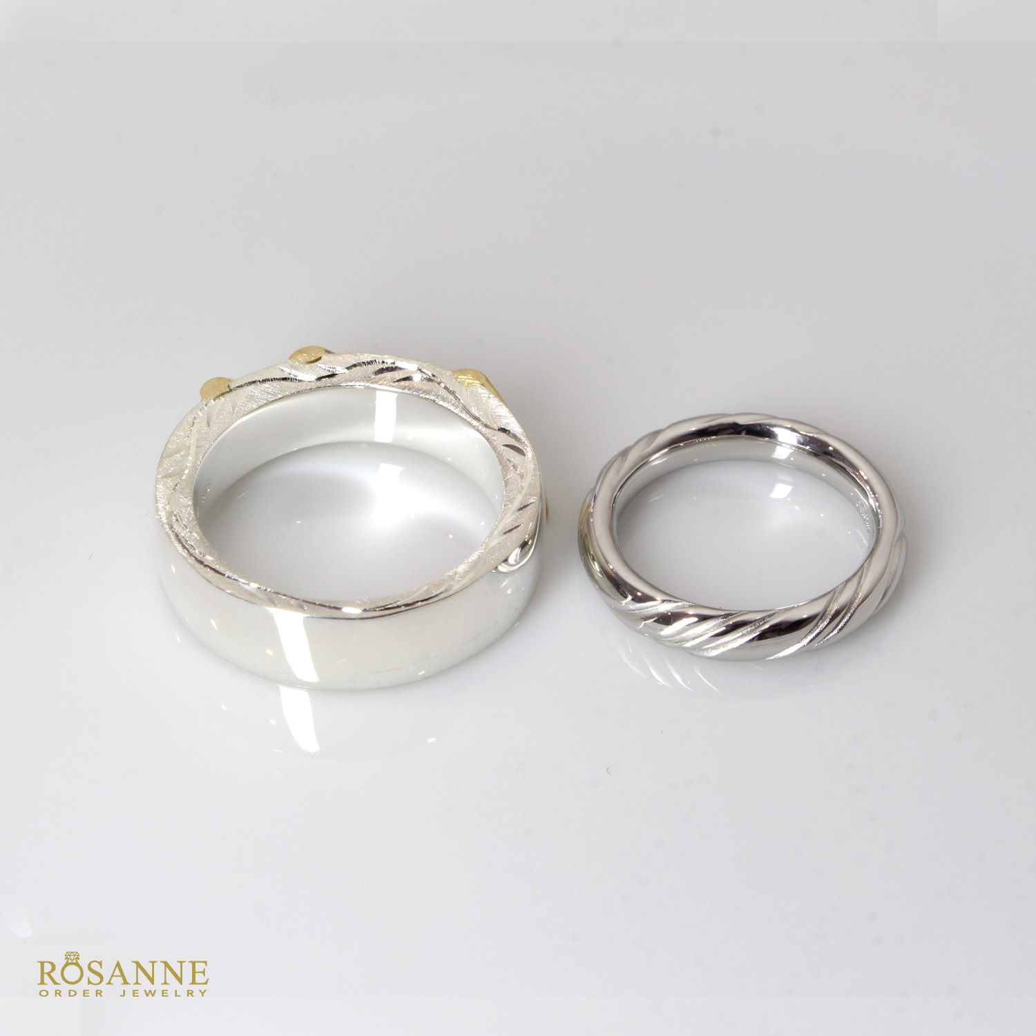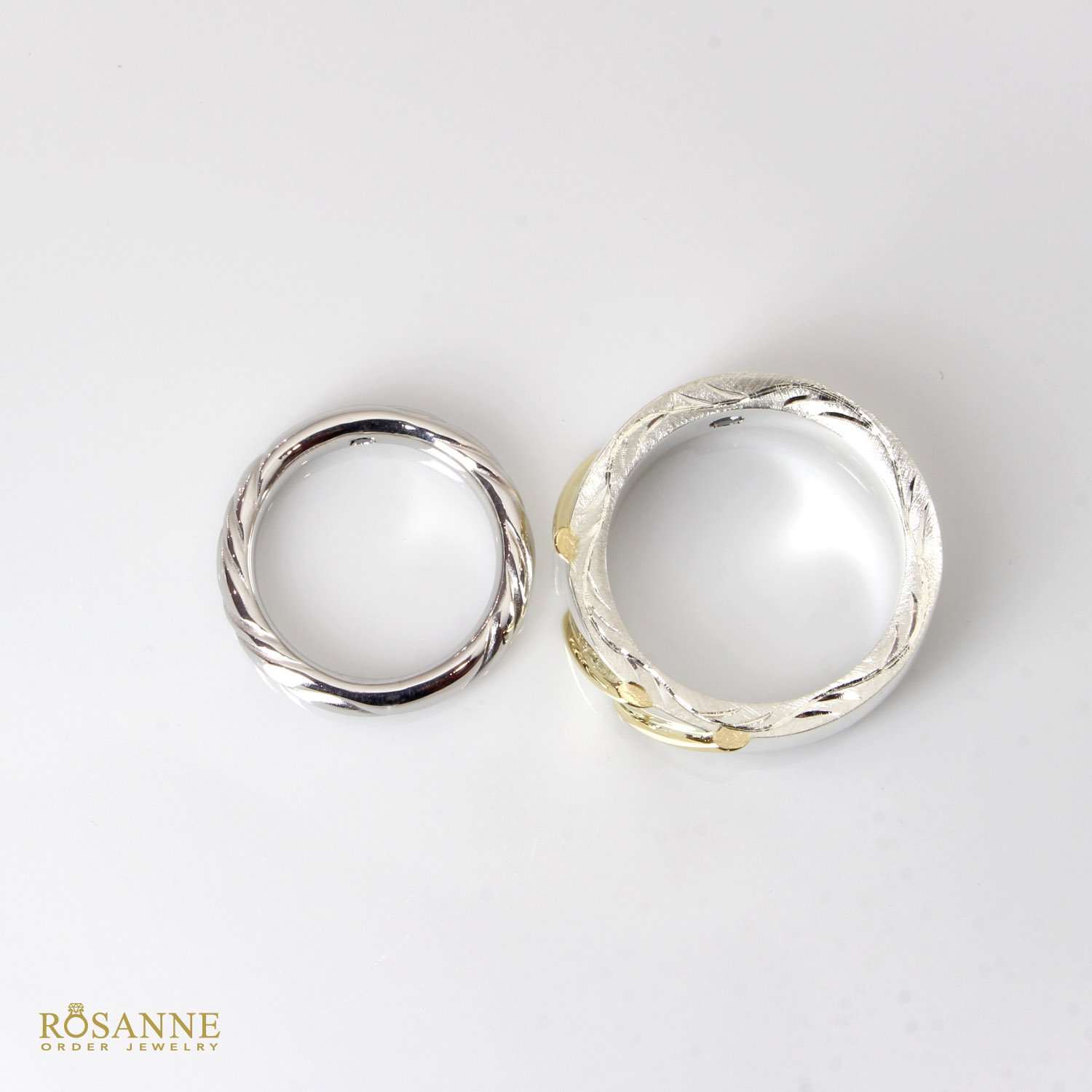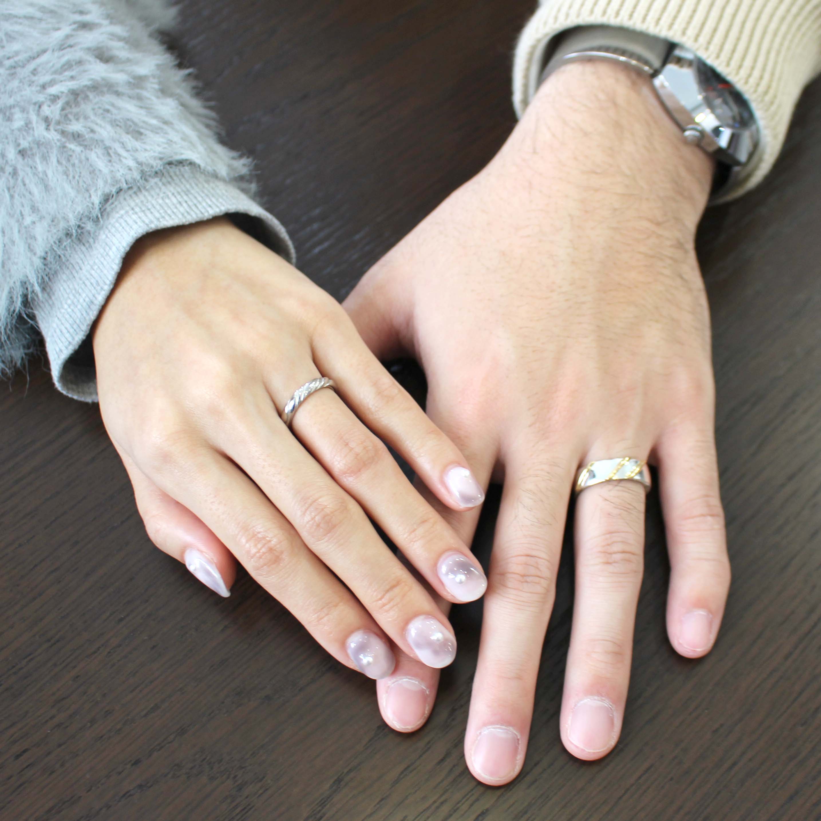 メンズレディースそれぞれお好みのデザインでお作り致しました。奥様はストレートベースの甲丸リングに曲線的な彫りを施しました。ダイヤモンドがなくてもキラキラ感もある品物です。