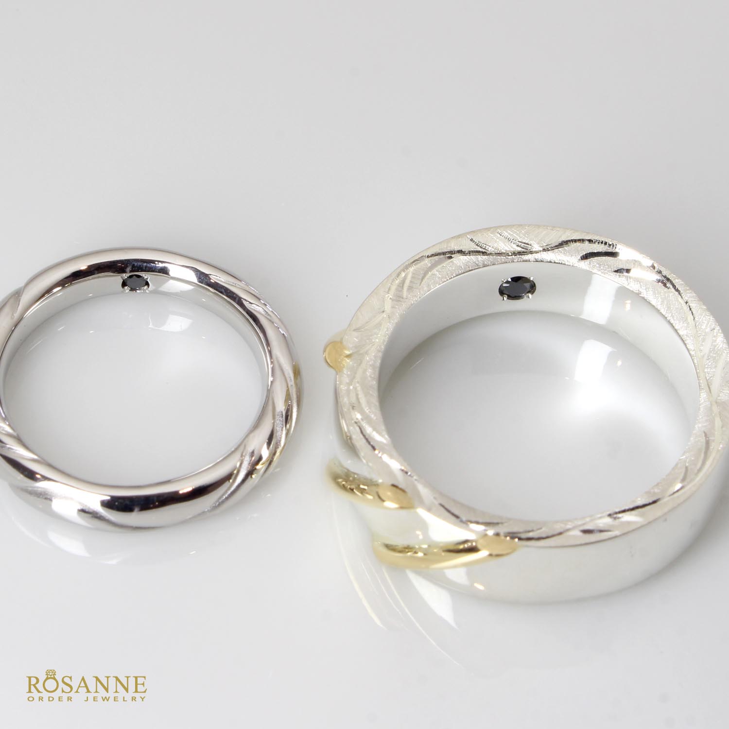 旦那様はシルバーリングをベースに金の線を埋め込みラインをお入れしました。内側にはお揃いのブラックダイヤモンドをセットしております。とてもお似合いになられていました。