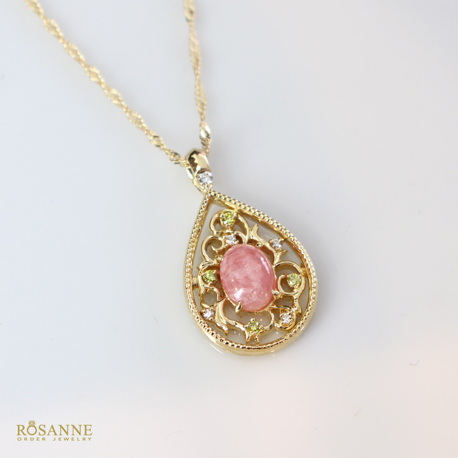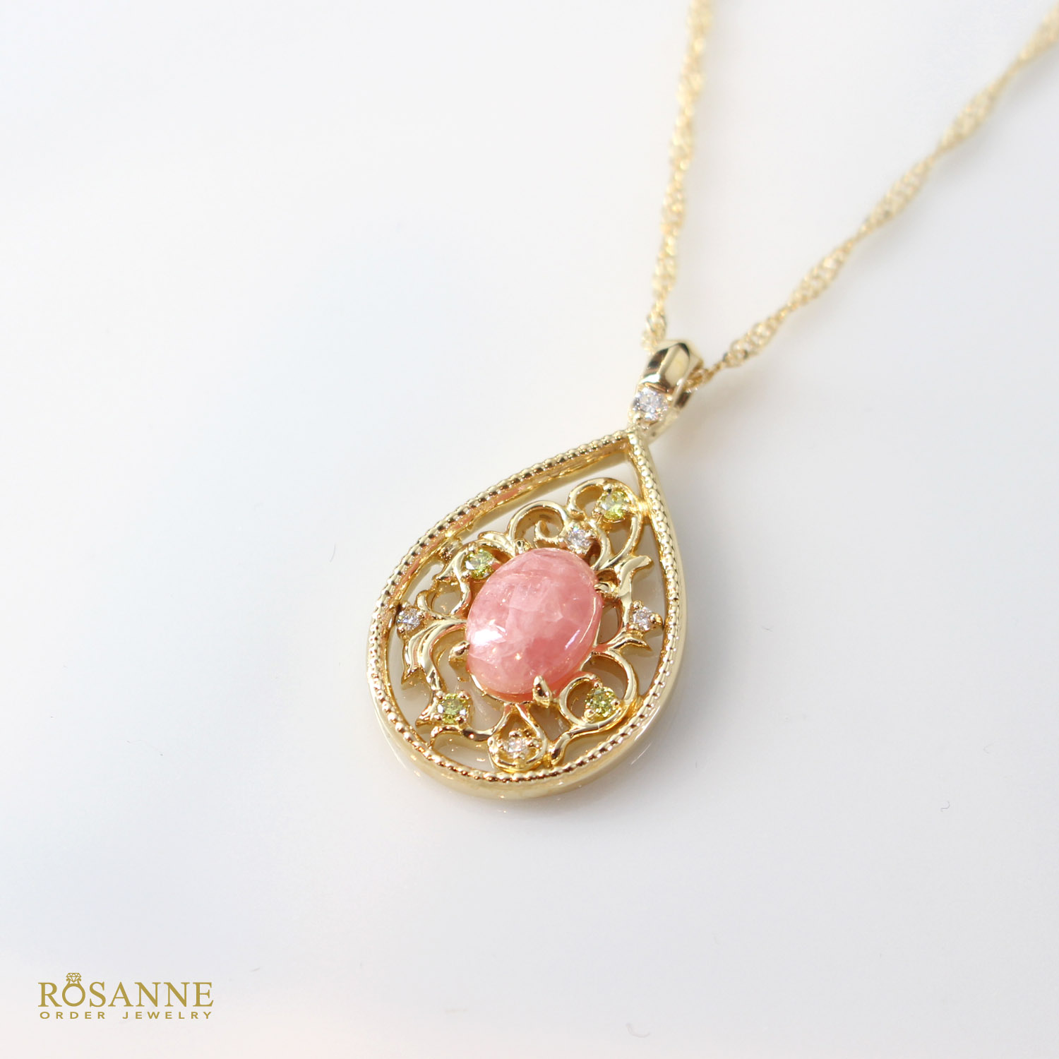 バラ色の宝石という名をもつ、ロードナイトをセンターストーンにした透かし柄のペンダント。