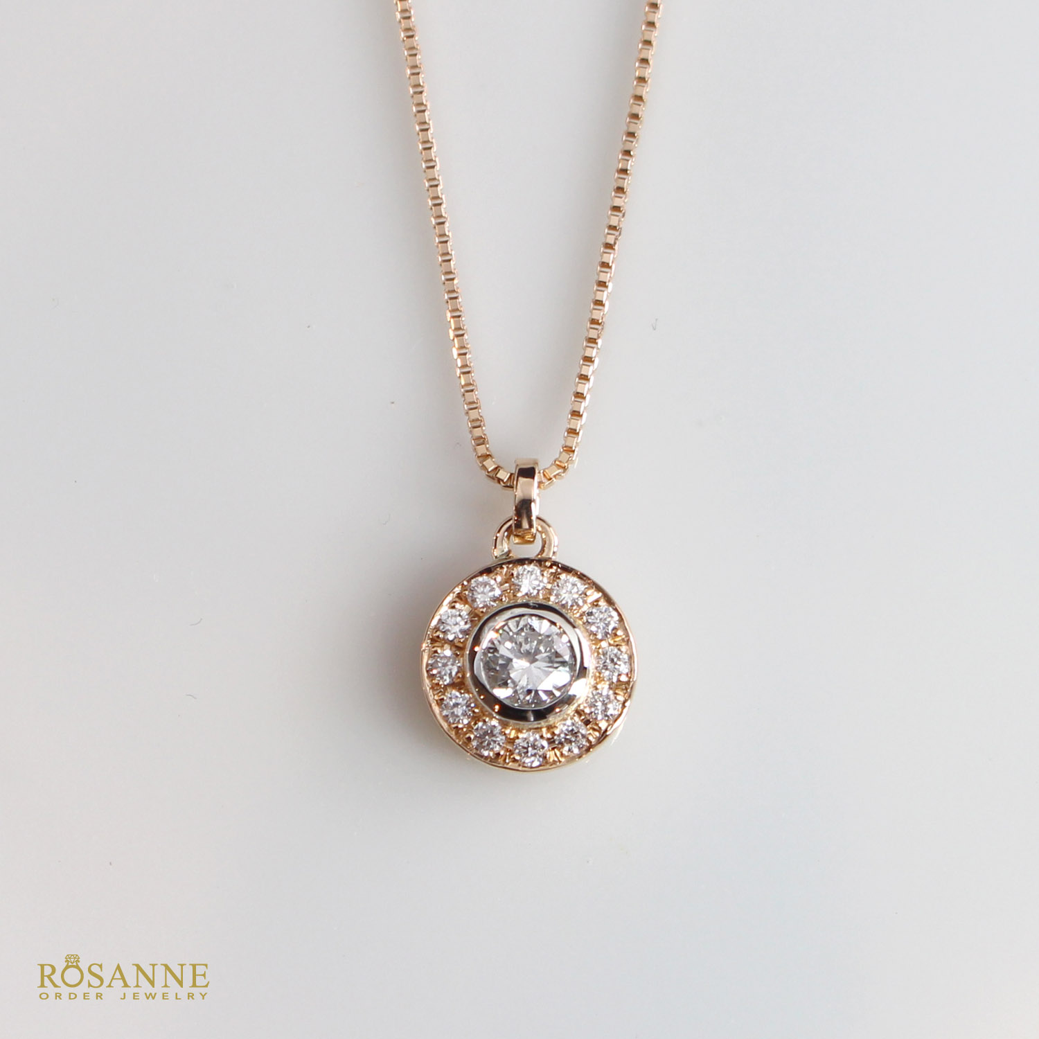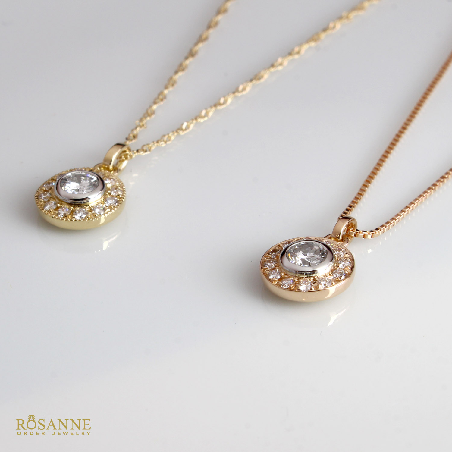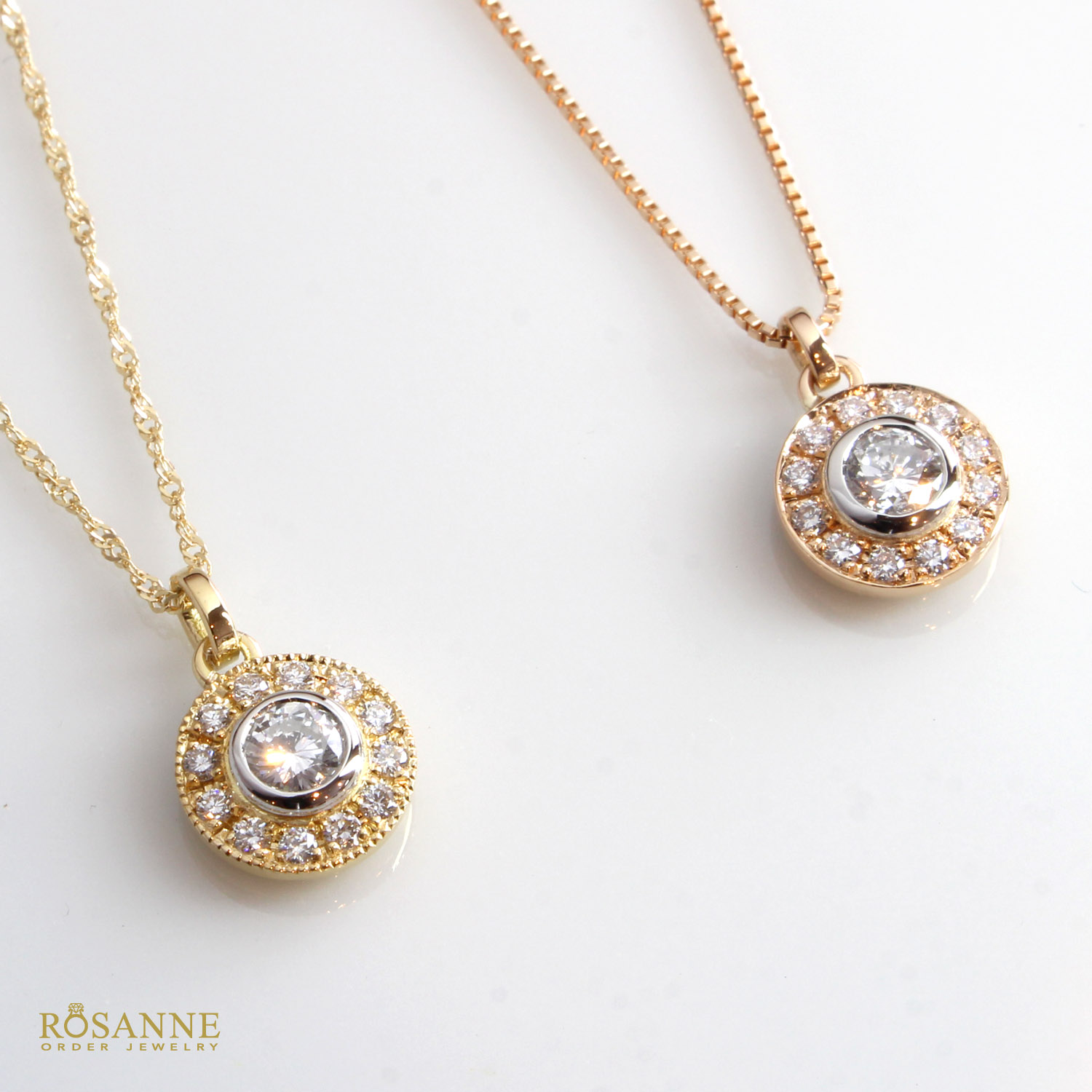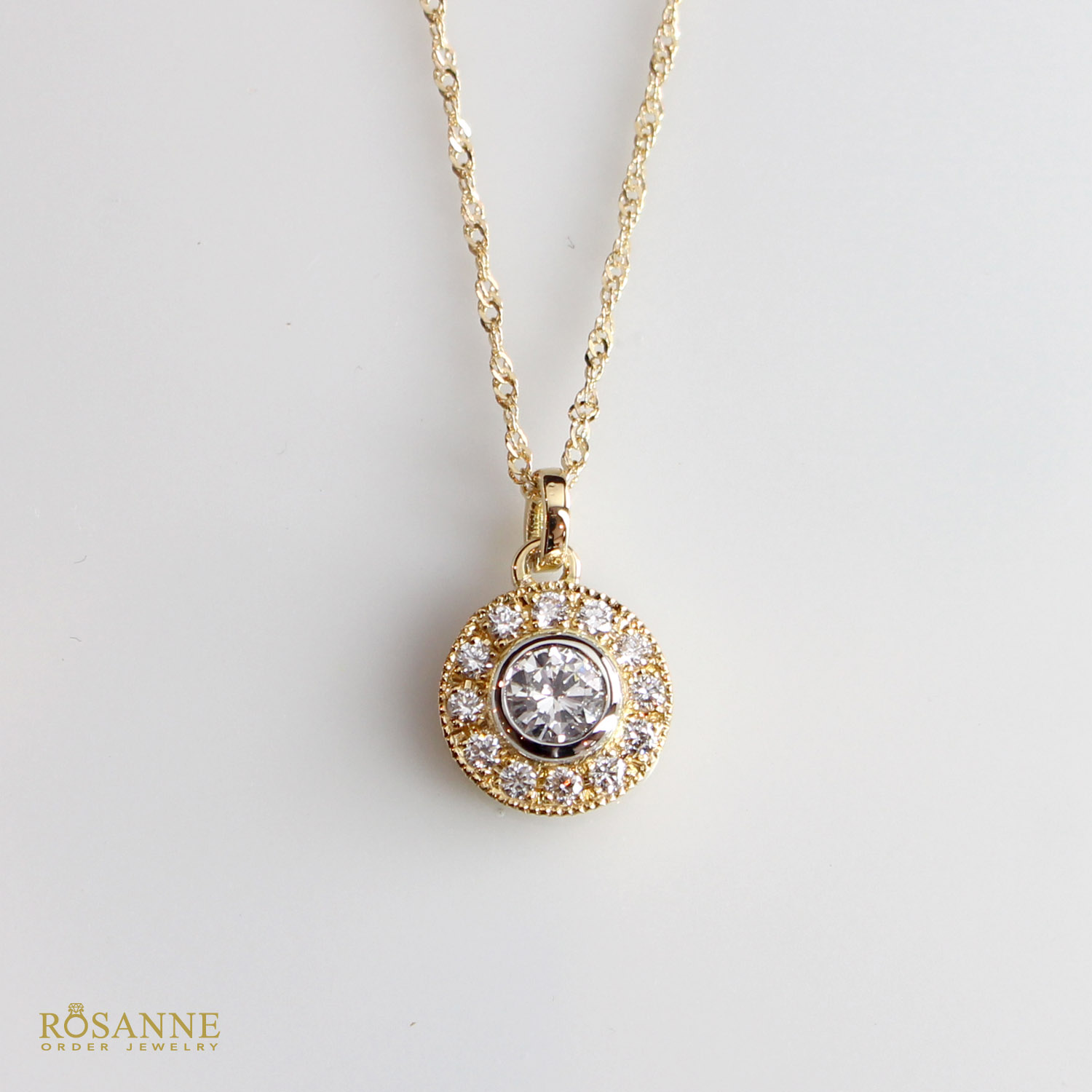 存在感ある中石ダイヤモンドを繊細なメレダイヤで取り巻いたネックレス。中石周りと外枠で異なる素材(イエローゴールド、ピンクゴールド、プラチナ)を選択可能。さらに、ミル打ちの有無もカスタマイズでき、細部まであなただけの特別なネックレスに仕立てます。